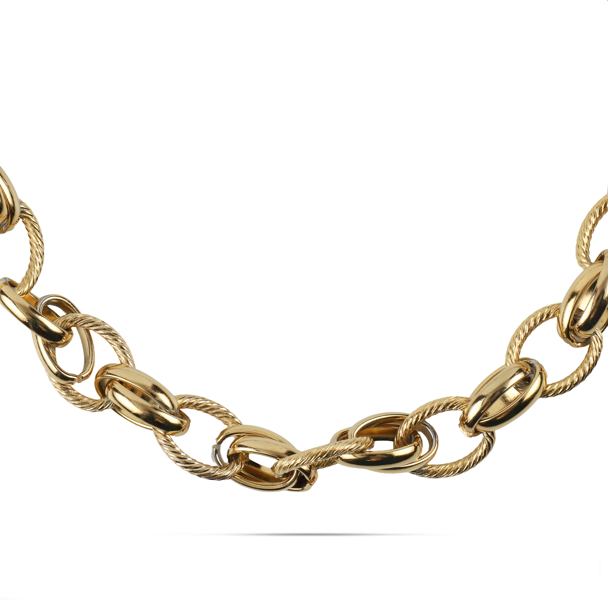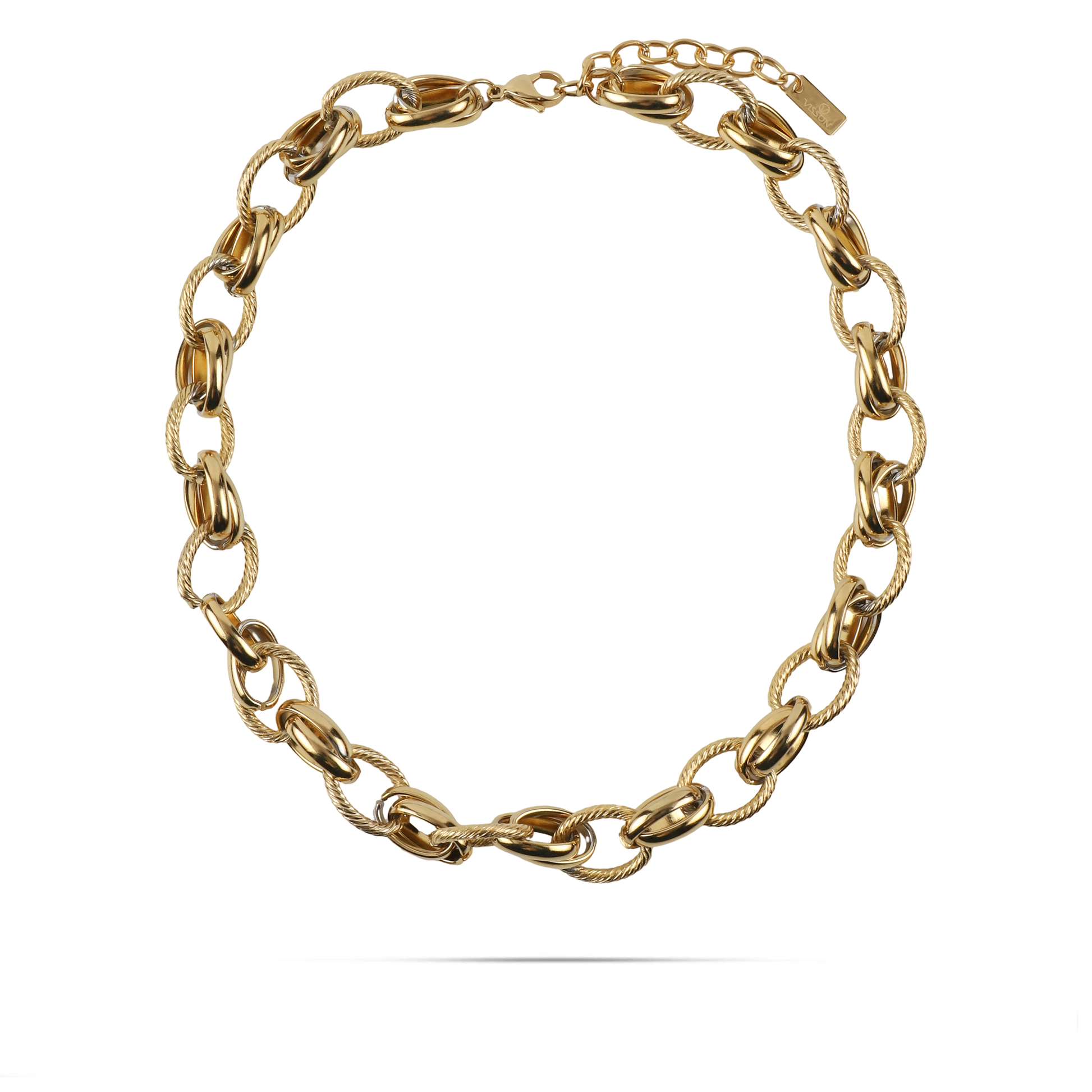 Αλυσίδα λαιμού από ανοξείδωτο ατσάλι σε χρυσό χρώμα, με περίτεχνο σχέδιο κρίκων που συνδυάζει κομψότητα και διαχρονικότητα. Η μοναδική της υφή και ο εκλεπτυσμένος σχεδιασμός της την καθιστούν ιδανική επιλογή για κάθε περίσταση — από τις καθημερινές σας εμφανίσεις έως τις πιο ιδιαίτερες. Ένα κόσμημα που αποπνέει πολυτέλεια και στυλ, προσθέτοντας λάμψη σε κάθε σας outfit.