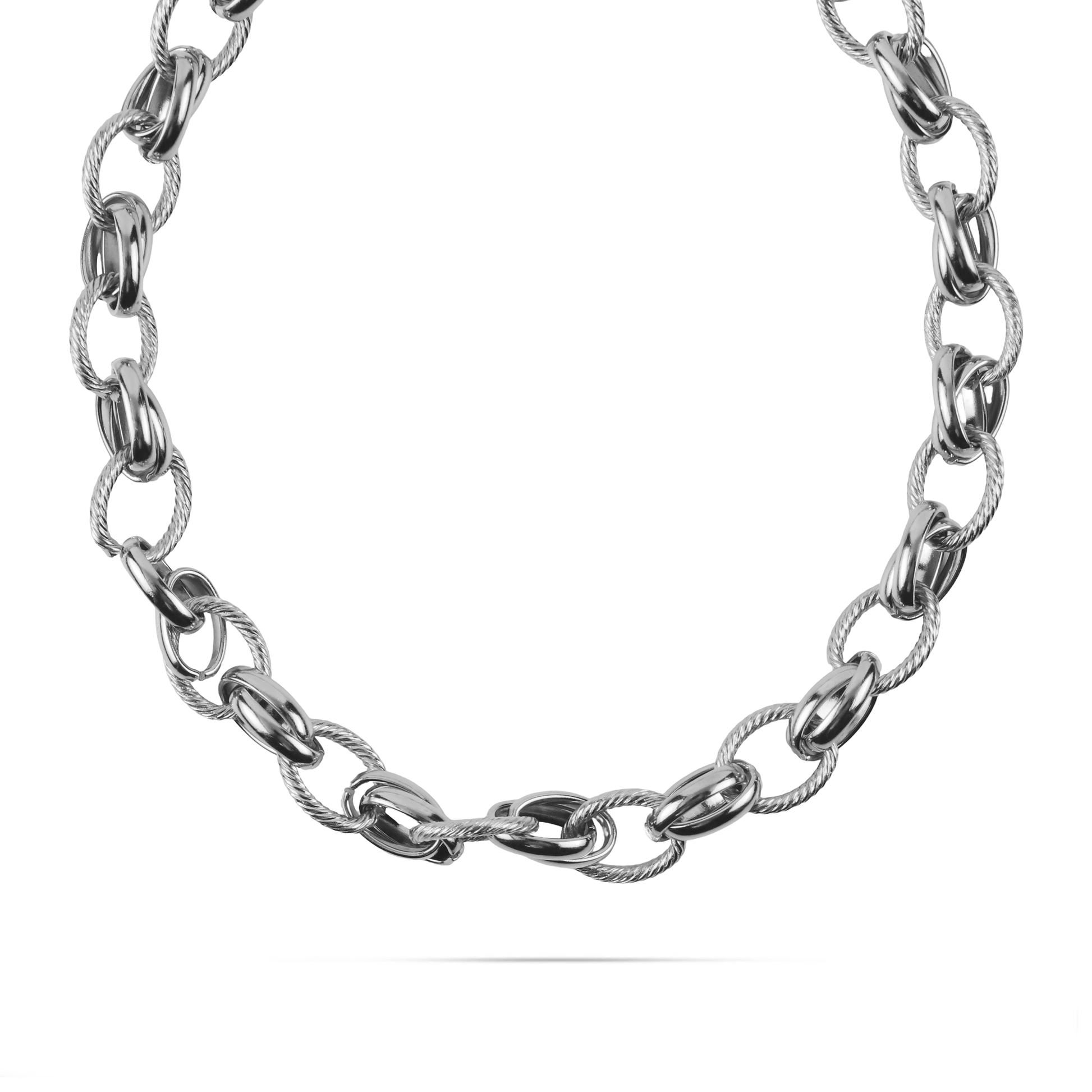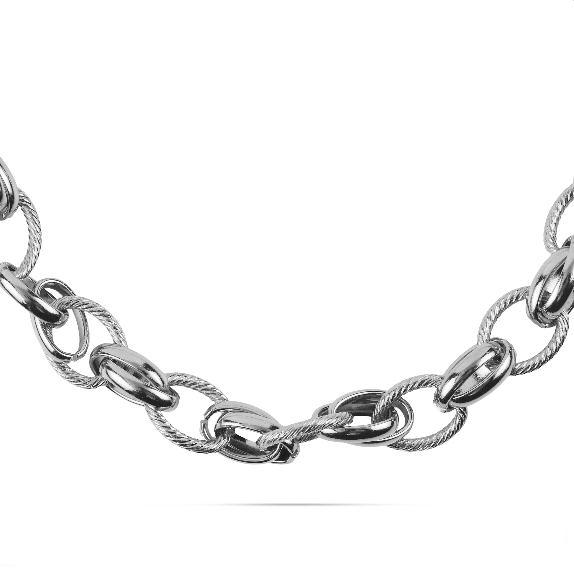 Αλυσίδα λαιμού από ανοξείδωτο ατσάλι σε ασημί χρώμα, με καλλιτεχνικά διαμορφωμένους κρίκους που δημιουργούν ένα διακριτικά εντυπωσιακό αποτέλεσμα. Ο συνδυασμός του λαμπερού μετάλλου με το περίτεχνο σχέδιο χαρίζει στο κόσμημα έναν μοντέρνο αλλά και διαχρονικό χαρακτήρα. Ιδανική για όσους αγαπούν τα κομψά και ευέλικτα κοσμήματα που μπορούν να φορεθούν από το πρωί έως το βράδυ.