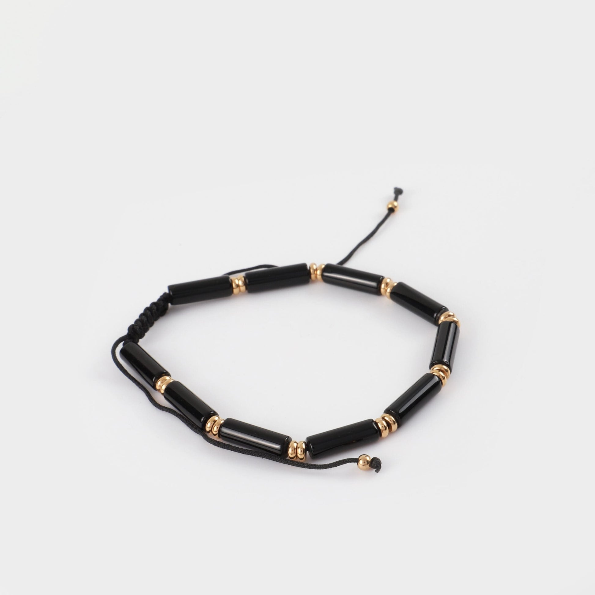 Αναδείξτε το στυλ σας με αυτό το μοναδικό βραχιόλι με κορδόνι και μακραμέ δέσιμο, διακοσμημένο με μαύρους ημιπολύτιμους λίθους που προσφέρουν μια φυσική, κομψή λάμψη. Τα βαρελάκια σε καφέ χρώμα δίνουν δυναμισμό στο σχέδιο, ενώ οι χρυσές ροδέλες προσθέτουν μια διακριτική και εκλεπτυσμένη λάμψη.