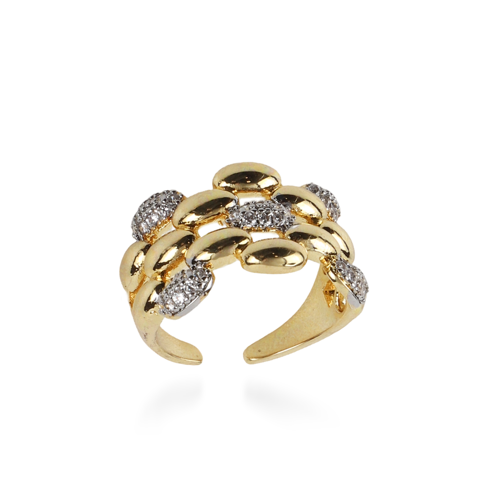 Το γυναικείο δαχτυλίδι Mar and Mar Selisare από ορείχαλκο σε χρυσό χρώμα διαθέτει πλατύ σχέδιο σε στυλ αλυσίδας, διακοσμημένο με λαμπερές λευκές πέτρες ζιργκόν, προσδίδοντας ένα μοντέρνο και εντυπωσιακό στυλ. Ιδανικό για να αναδείξετε την κομψότητα και τη λάμψη σας σε κάθε εμφάνιση. ✨💍