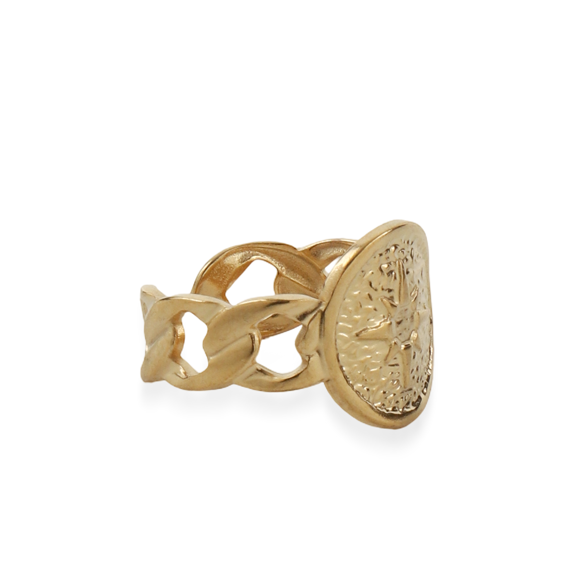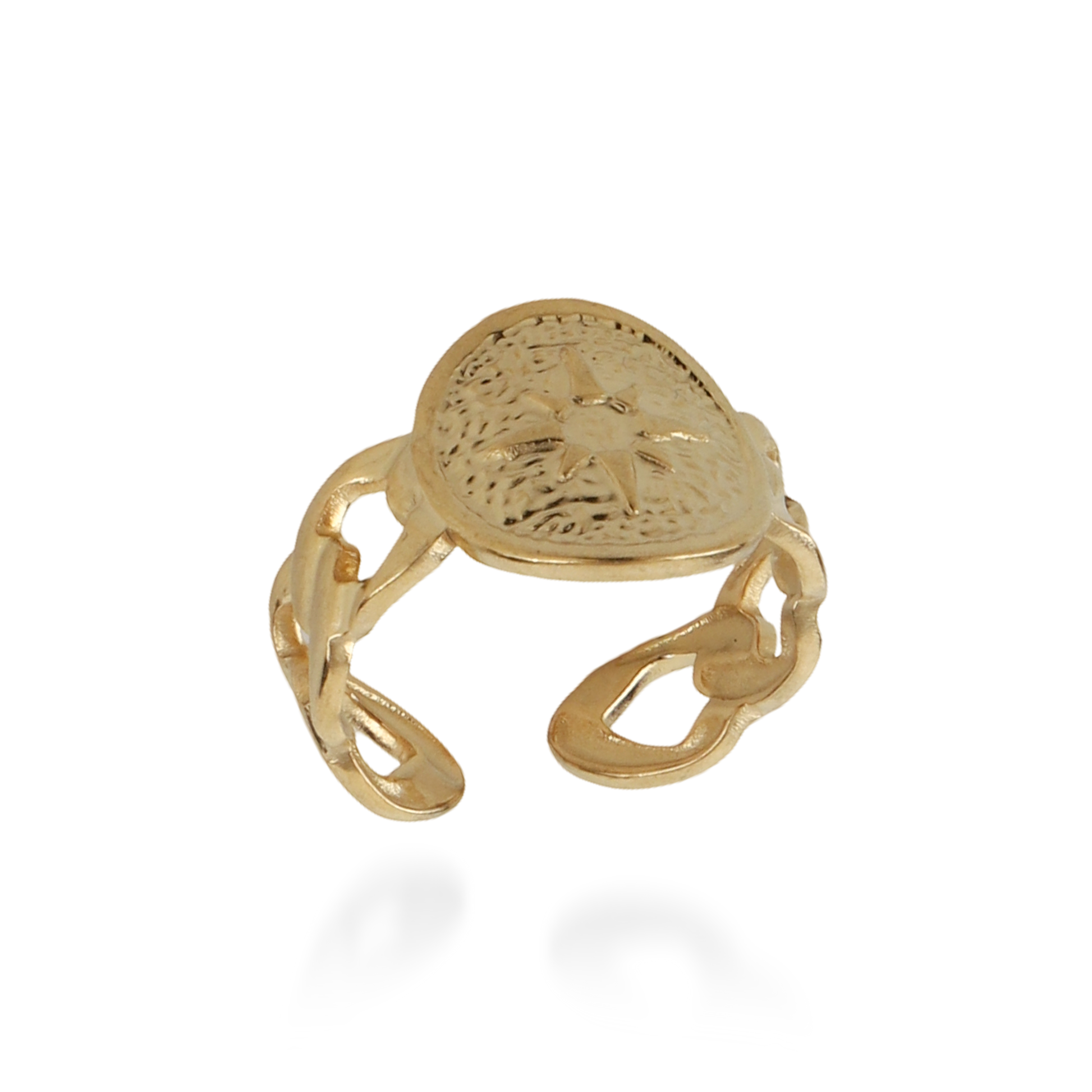 Αναδείξτε τη λάμψη και την κομψότητά σας με αυτό το εκλεπτυσμένο γυναικείο δαχτυλίδι από ανοξείδωτο ατσάλι της συλλογής Mar and Mar, σε λαμπερή χρυσή απόχρωση. Ο μοντέρνος σχεδιασμός του με στρογγυλή λεπτομέρεια στο κέντρο αποπνέει απλότητα και διακριτική πολυτέλεια, προσδίδοντας μια κομψή και θηλυκή πινελιά σε κάθε σας εμφάνιση. Ιδανικό για κάθε περίσταση από τις casual στιγμές έως τις πιο επίσημες εξόδους το δαχτυλίδι αυτό συνδυάζει τη σύγχρονη αισθητική με τη διαχρονική φινέτσα. Η ανθεκτική κατασκευή από ανοξείδωτο ατσάλι εξασφαλίζει μακροχρόνια λάμψη και αντοχή, κάνοντάς το ένα διαχρονικό και κομψό κόσμημα που ολοκληρώνει κάθε look με απλότητα και στυλ