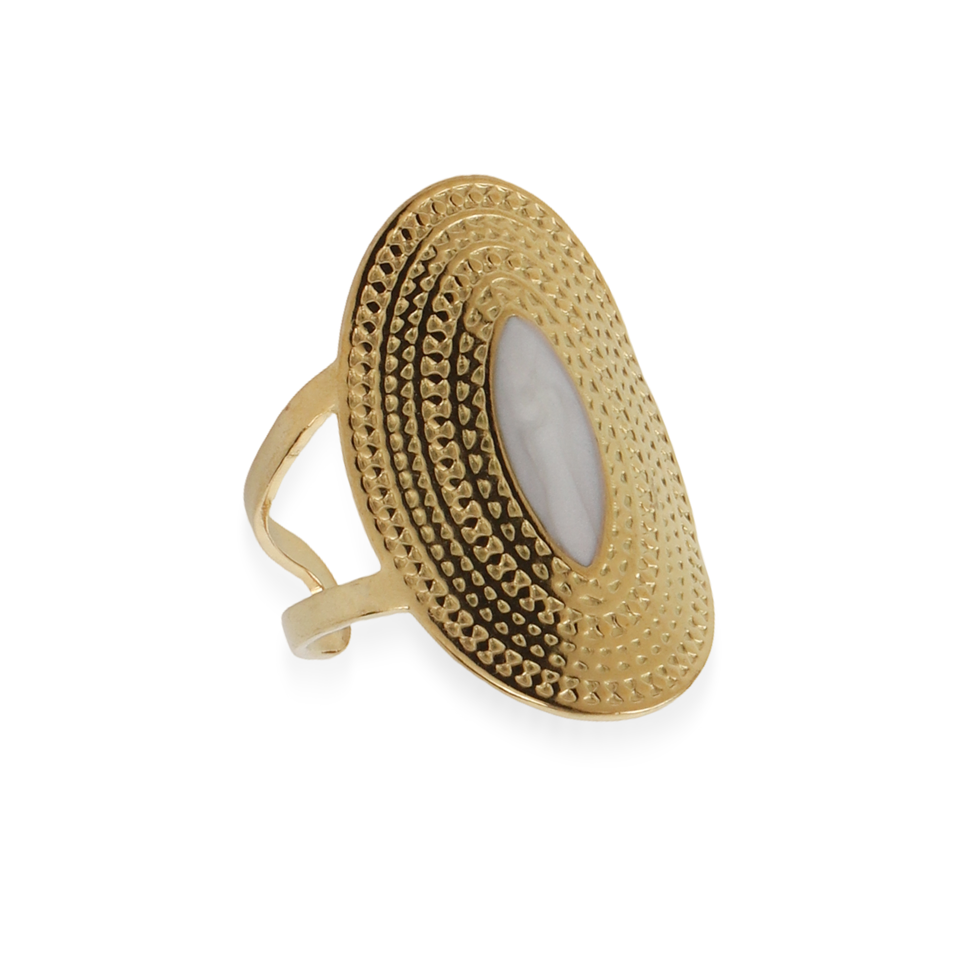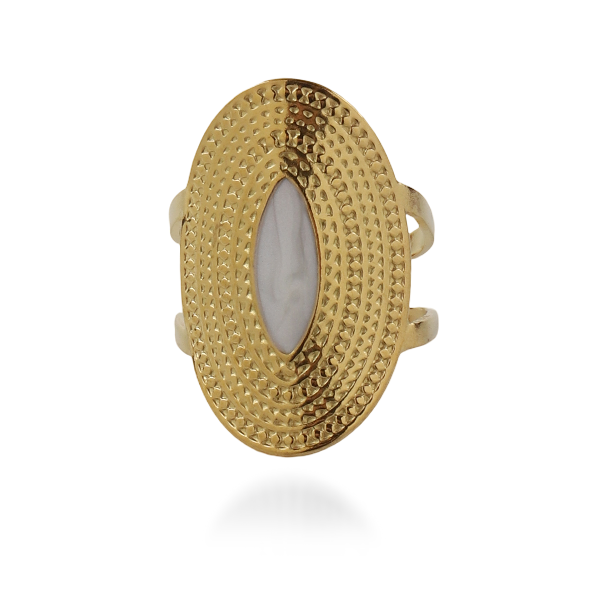 Αναδείξτε τη θηλυκότητα και την κομψότητά σας με αυτό το εκλεπτυσμένο γυναικείο δαχτυλίδι από ανοξείδωτο ατσάλι της συλλογής Mar and Mar, σε λαμπερή χρυσή απόχρωση, με οβάλ λευκή πέτρα στο κέντρο που προσφέρει διακριτική λάμψη και ρομαντική αίσθηση. Ο κομψός και μοντέρνος σχεδιασμός του συνδυάζει πολυτέλεια και φινέτσα, καθιστώντας το ιδανικό για κάθε περίσταση, από τις καθημερινές εμφανίσεις έως τις πιο επίσημες εξόδους. Η ανθεκτική κατασκευή του εξασφαλίζει μακροχρόνια λάμψη και σταθερότητα, ενώ ο συνδυασμός του μετάλλου με την φωτεινή οβάλ πέτρα αποπνέει κομψότητα και διακριτική πολυτέλεια. Ένα λαμπερό και εκλεπτυσμένο κόσμημα που θα αναβαθμίσει κάθε σας look με στυλ και φινέτσα.