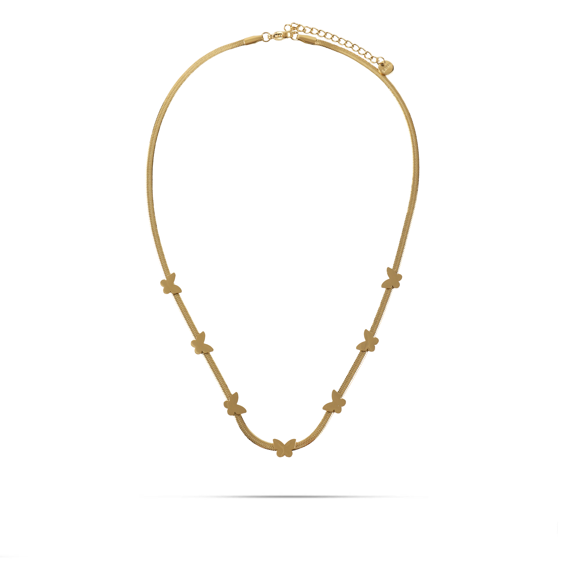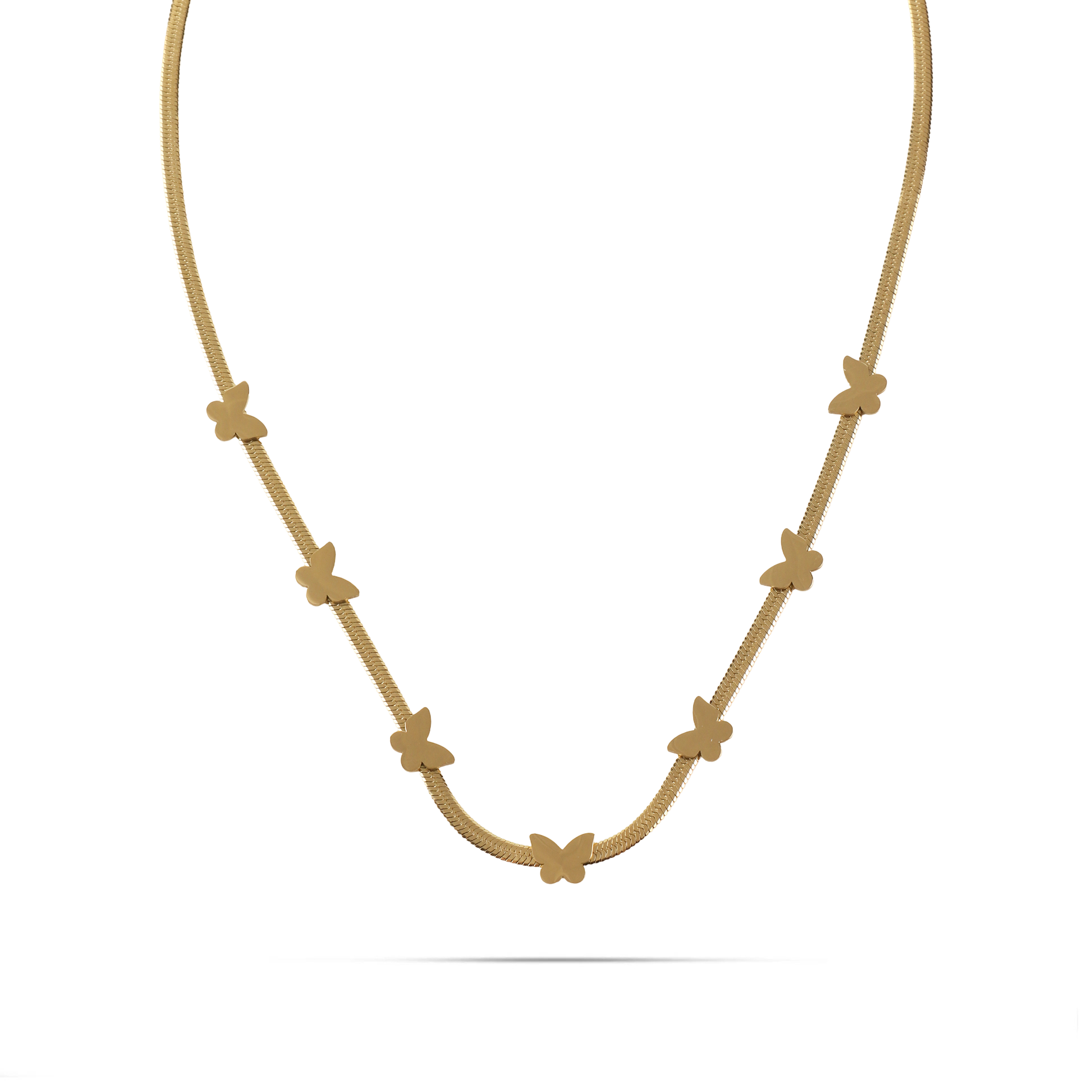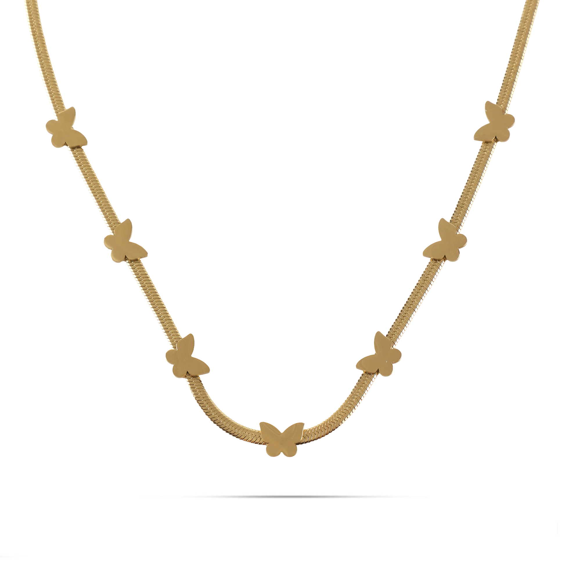 Κολιέ από ανοξείδωτο ατσάλι σε χρυσό χρώμα με Flat Snake αλυσίδα, διακοσμημένη με κομψές πεταλούδες που προσθέτουν θηλυκότητα και παιχνιδιάρικη κομψότητα. Το μοναδικό σχέδιο χαρίζει μία ξεχωριστή πινελιά σε κάθε εμφάνιση, ιδανικό για κάθε στυλ.
