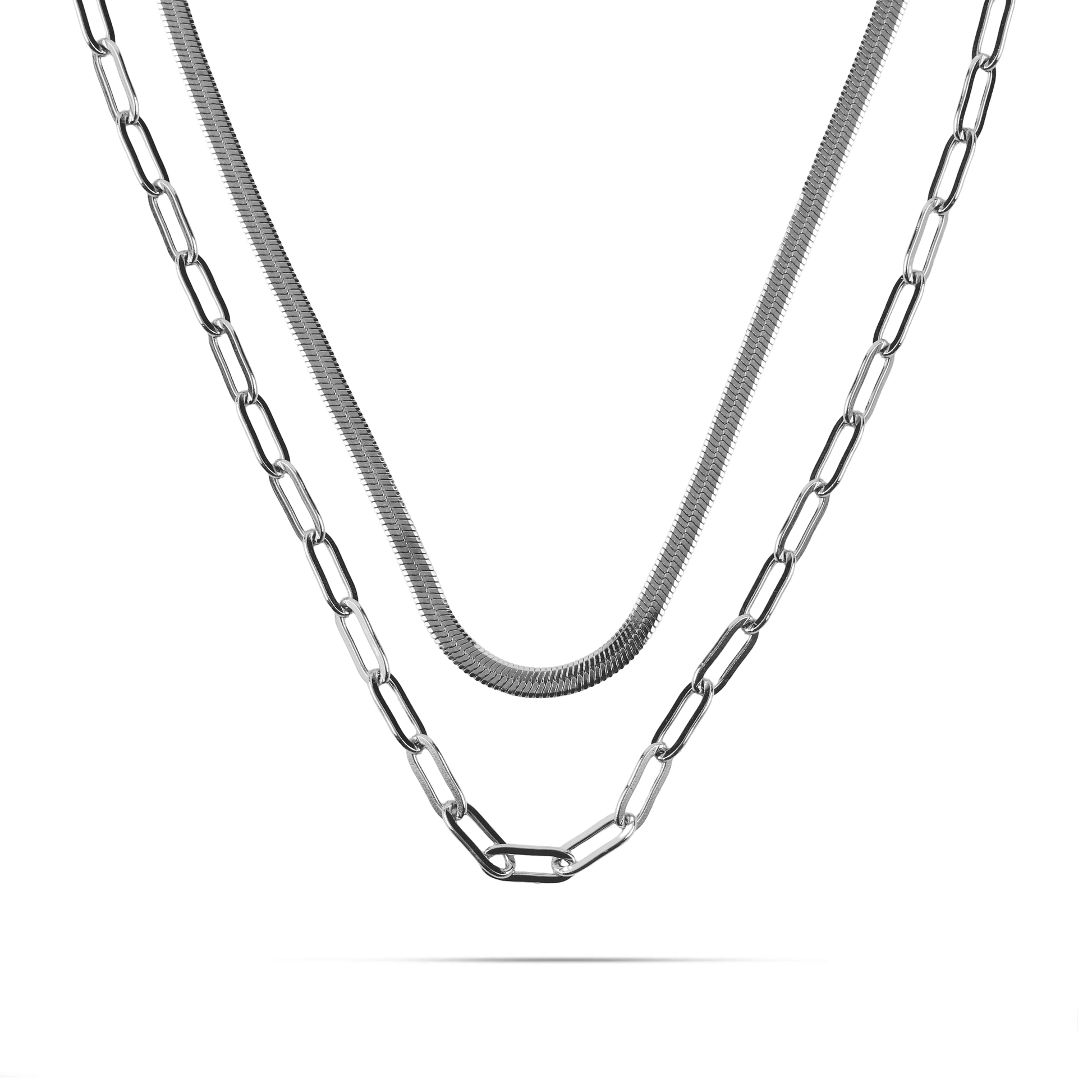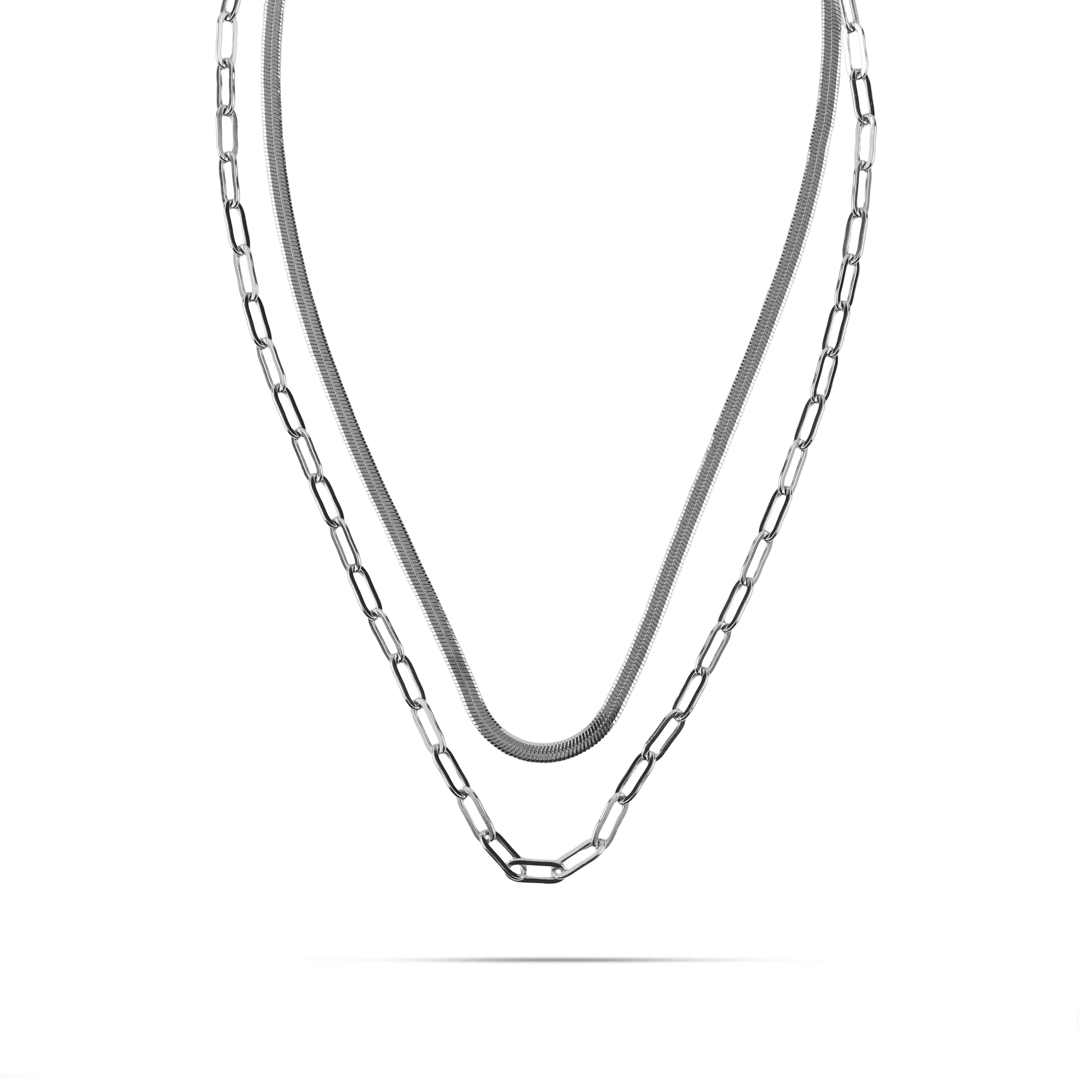 Το κολιέ Mar and Mar Maelis από ανοξείδωτο ατσάλι σε ασημί χρώμα διαθέτει διπλή αλυσίδα λαιμού, συνδυάζοντας μια flat snake αλυσίδα με μια κλασική αλυσίδα. Ο συνδυασμός αυτός προσφέρει μοντέρνο και κομψό αποτέλεσμα, ιδανικό για layering ή για να φορεθεί μόνο του. Η ασημένια απόχρωση εξασφαλίζει διαχρονικότητα και λάμψη, ενώ η λεπτή αλλά εντυπωσιακή κατασκευή το καθιστά κατάλληλο για καθημερινές εμφανίσεις αλλά και πιο επίσημες περιστάσεις. ✨