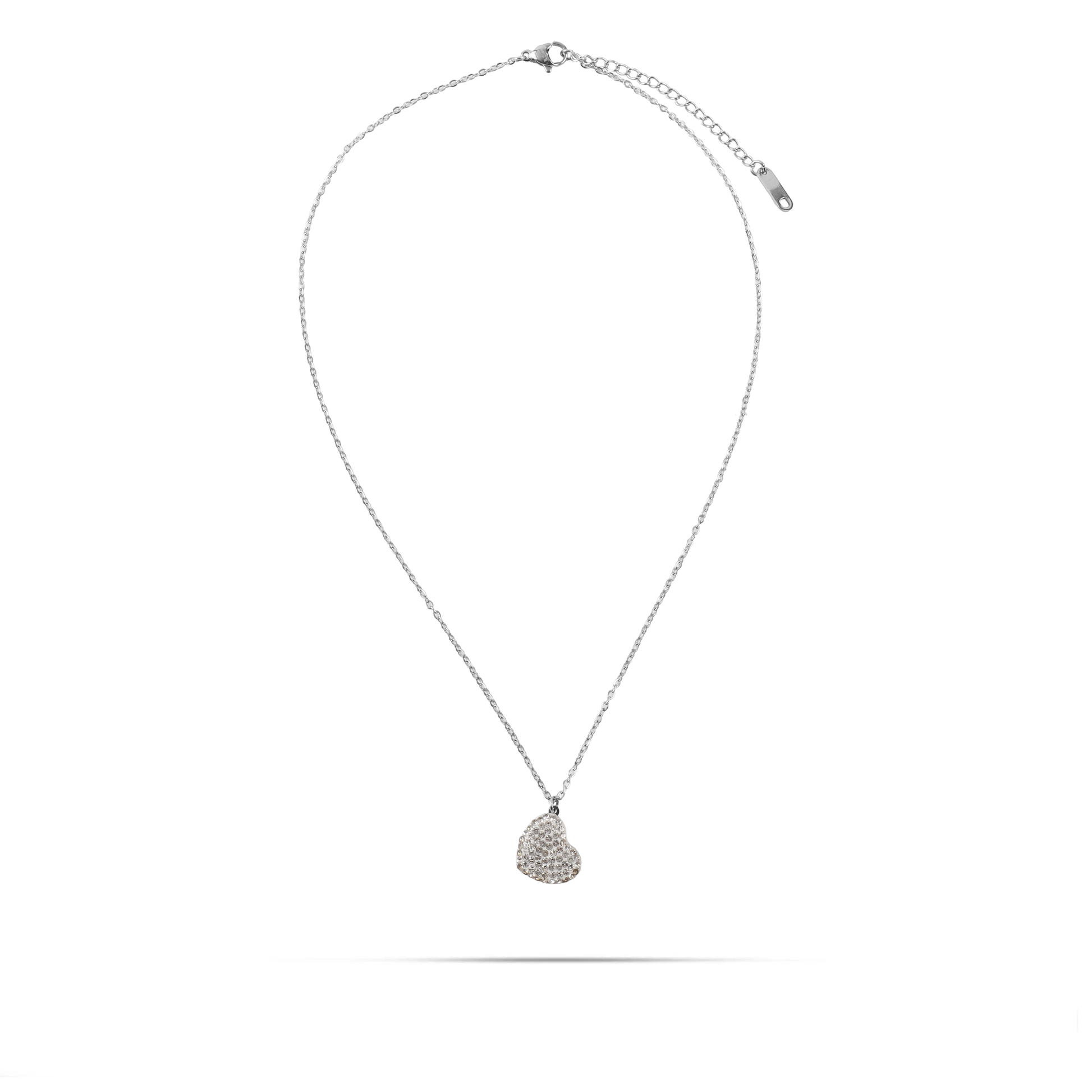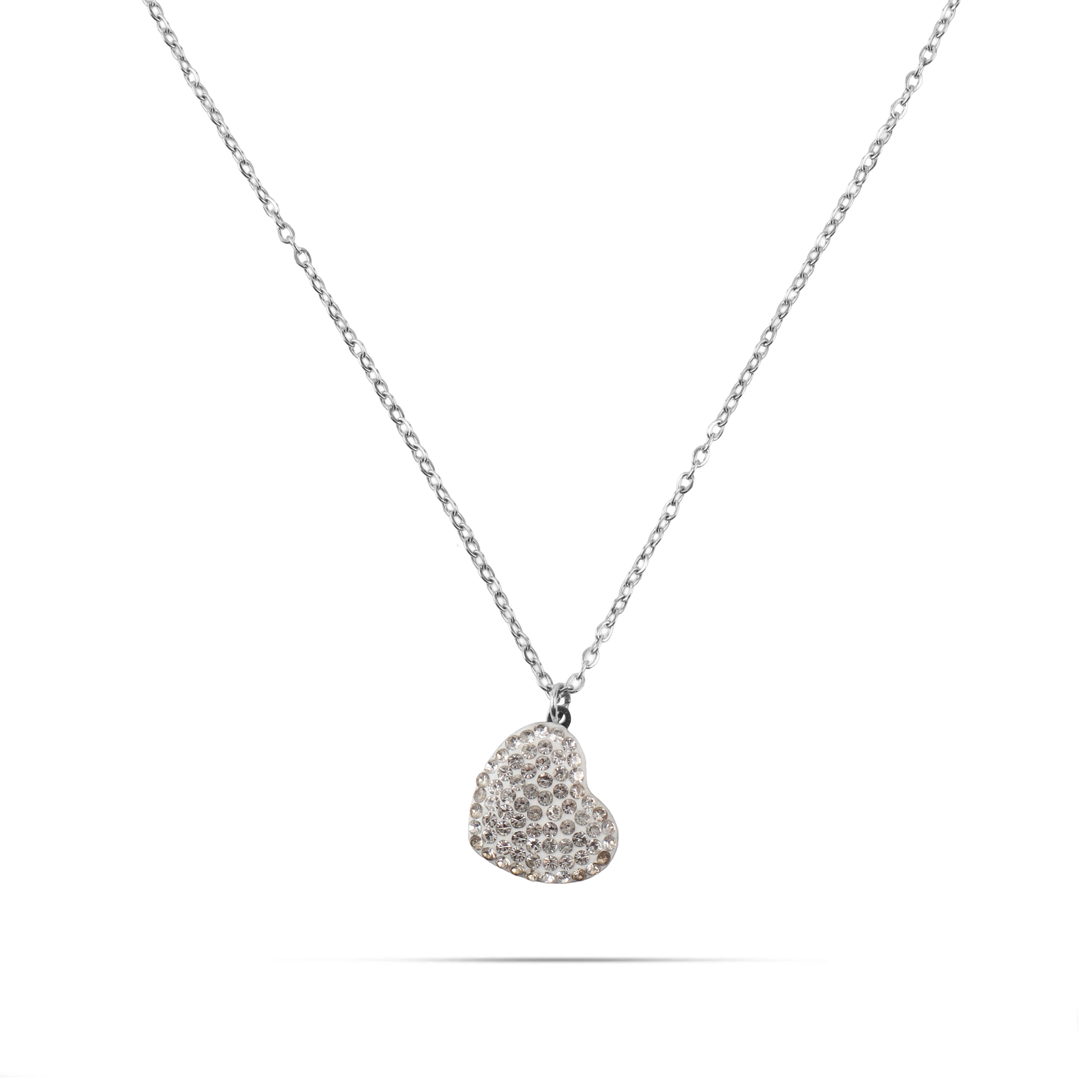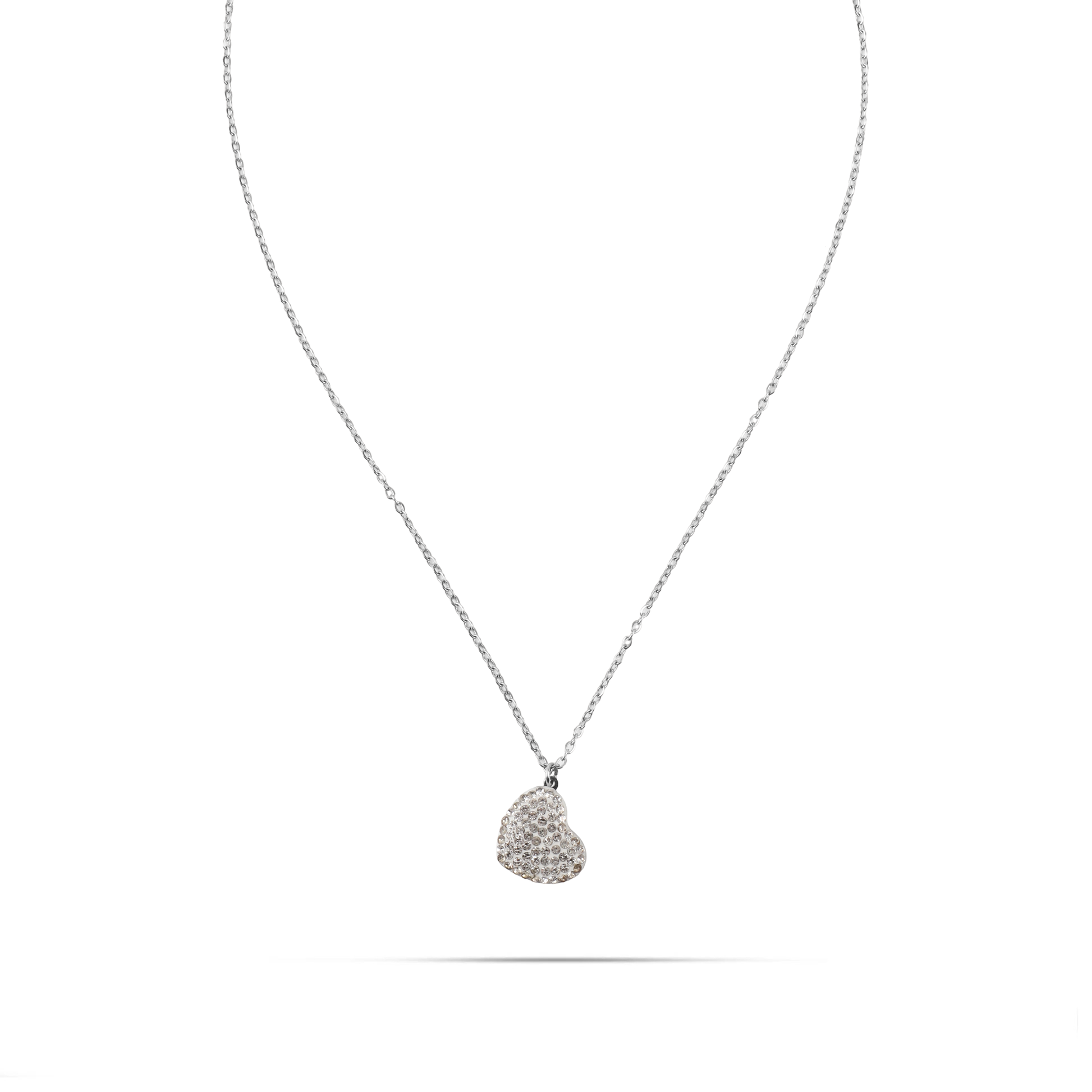 Χαρίστε στο στυλ σας μια παιχνιδιάρικη και κομψή πινελιά με αυτό το υπέροχο κολιέ καρδιά. Κατασκευασμένο από ανοξείδωτο ατσάλι σε ασημί χρώμα, διαθέτει καρδιά διακοσμημένη με λαμπερές λευκές πέτρες Zircon, που χαρίζει εκλεπτυσμένη λάμψη χωρίς να είναι υπερβολικό.