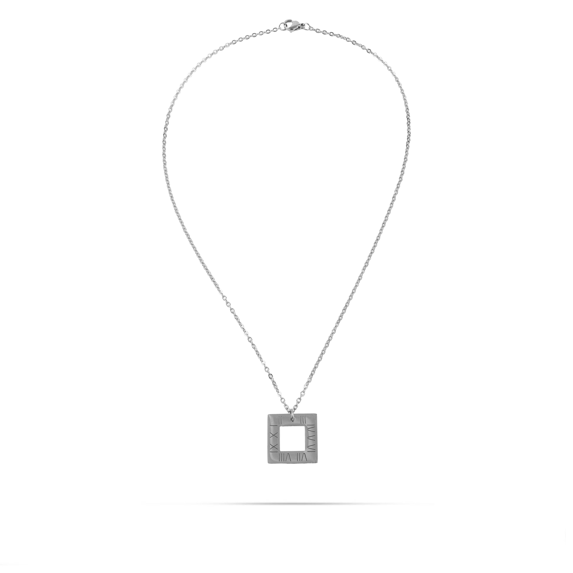 Κολιέ από ανοξείδωτο ατσάλι σε ασημί χρώμα με τετράγωνο μενταγιόν, διακοσμημένο με χαραγμένους λατινικούς αριθμούς, ένα μοντέρνο και κομψό κόσμημα. Η κατασκευή από ανοξείδωτο ατσάλι εξασφαλίζει αντοχή, είναι φιλική προς το δέρμα και ανθεκτική στη φθορά, προσφέροντας διαχρονική ποιότητα. Ιδανικό για καθημερινή χρήση αλλά και για πιο ιδιαίτερες περιστάσεις, μπορεί να φορεθεί μόνο του ή σε συνδυασμό με άλλα κοσμήματα, δημιουργώντας ένα εντυπωσιακό και εκλεπτυσμένο αποτέλεσμα.