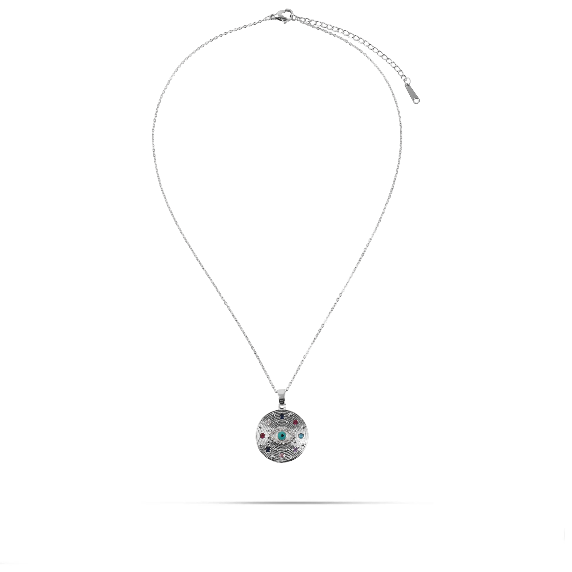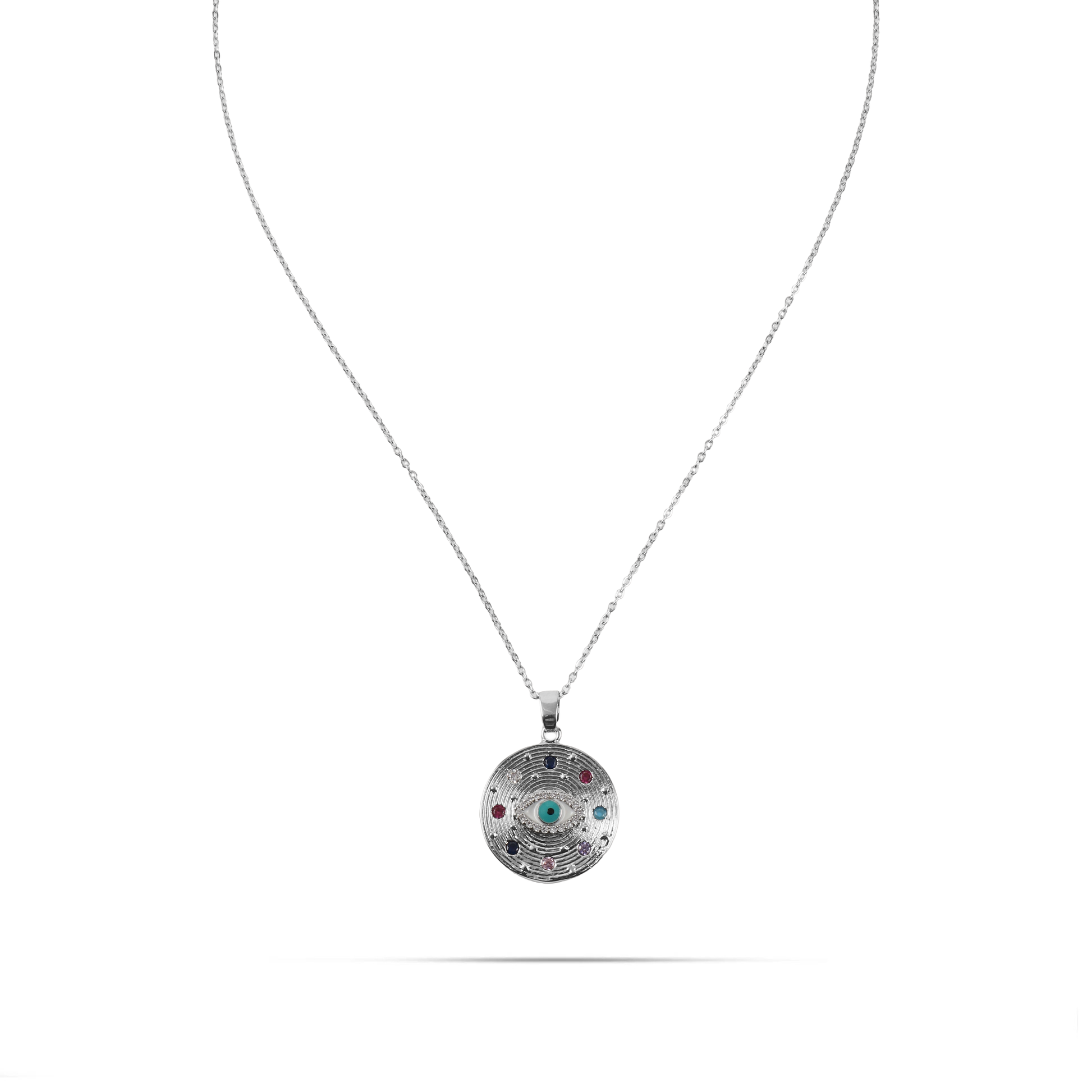 Δώστε μια παιχνιδιάρικη και μοντέρνα πινελιά στην εμφάνισή σας με αυτό το κολιέ με στρογγυλό μενταγιόν, που απεικονίζει ένα μάτι στο κέντρο και περιβάλλεται από πολύχρωμες πέτρες Zircon, δημιουργώντας ένα λαμπερό και εντυπωσιακό αποτέλεσμα.