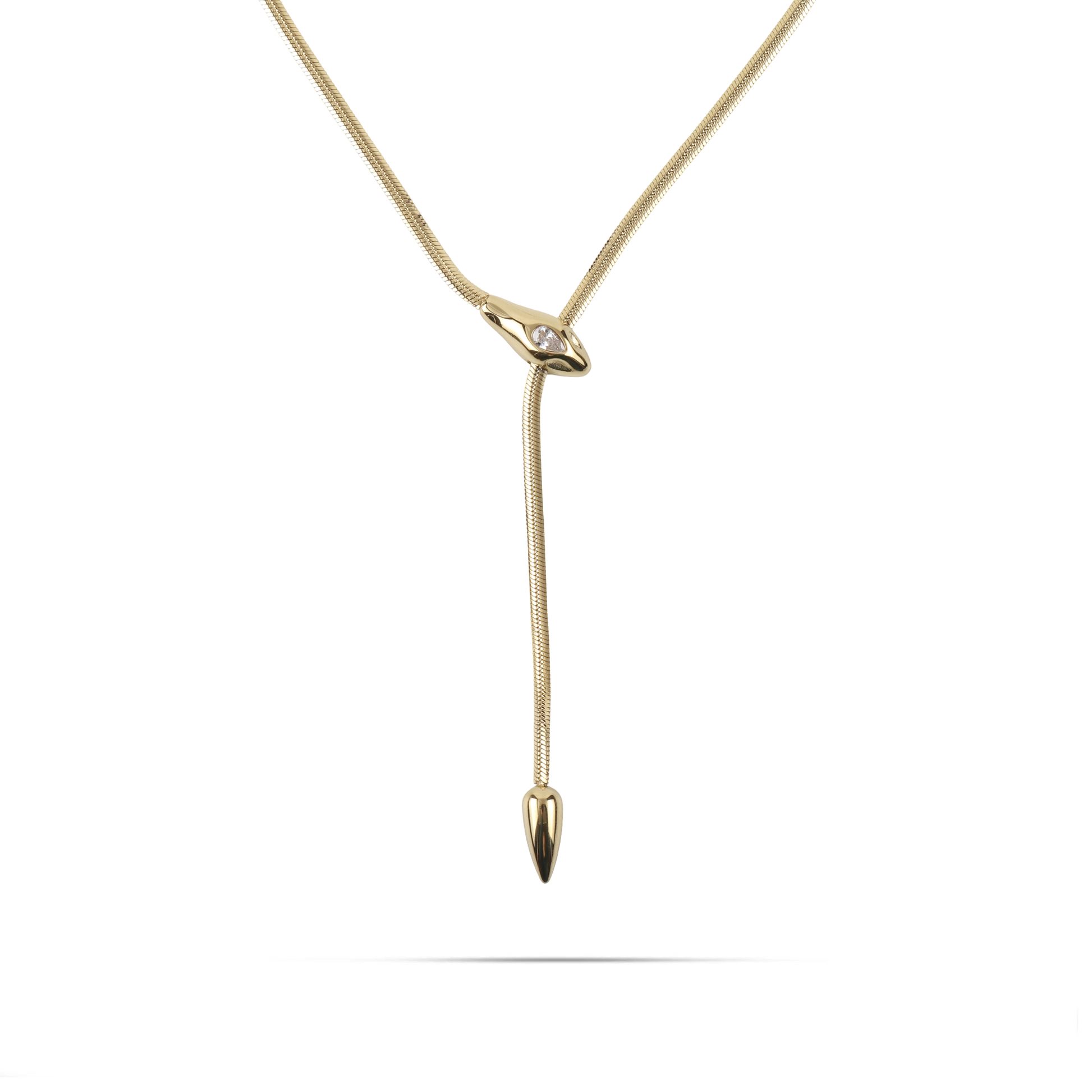 Το κολιέ Mar and Mar Ophira Tie από ανοξείδωτο ατσάλι σε χρυσό χρώμα διαθέτει flat snake αλυσίδα και εντυπωσιακό μενταγιόν σε σχήμα φιδιού διακοσμημένο με λευκά ζιργκόν. Το συνολικό μήκος της αλυσίδας είναι 45 cm, αλλά το Tie κλείσιμο επιτρέπει την προσαρμογή σε οποιοδήποτε μήκος ανάλογα με το στυλ σας. Η ζεστή χρυσή λάμψη προσθέτει πολυτέλεια και κομψότητα, ενώ το ιδιαίτερο σχέδιο του φιδιού χαρίζει μοντέρνο και δυναμικό χαρακτήρα σε κάθε εμφάνιση. ✨