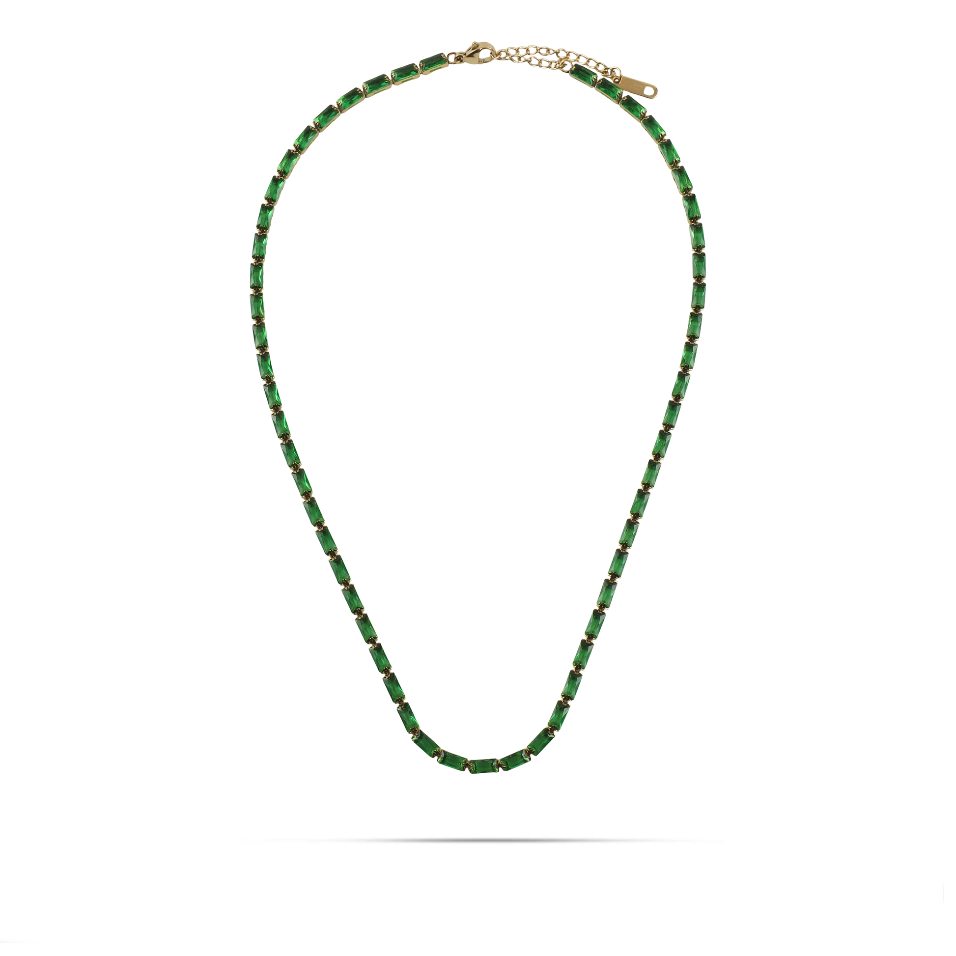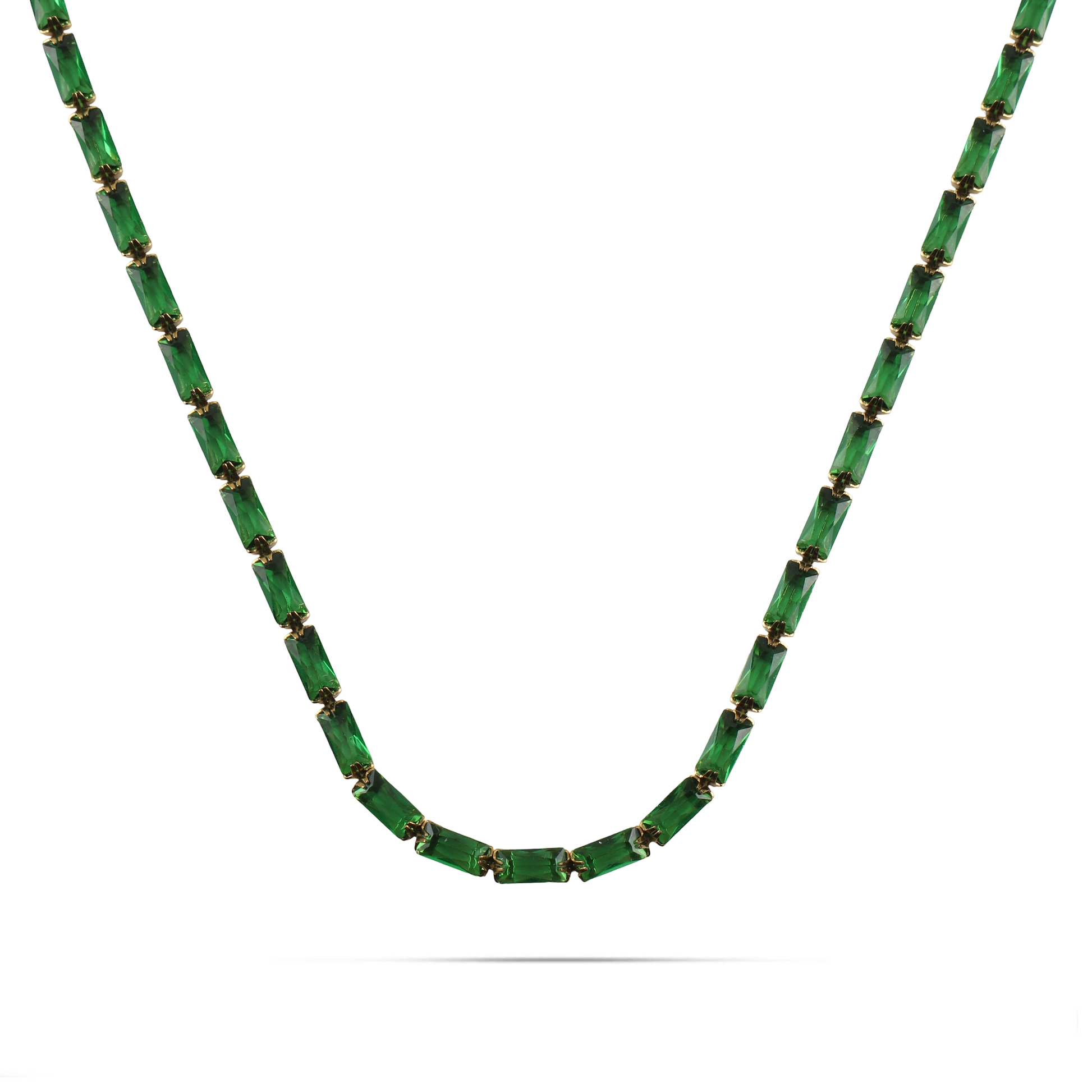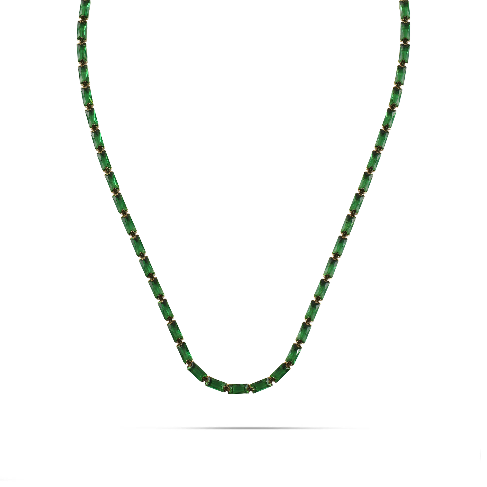 Κολιέ αλυσίδα λαιμού από ανοξείδωτο ατσάλι σε χρυσό χρώμα, διακοσμημένο με λαμπερές πράσινες πέτρες Baguette Zircon που προσδίδουν πολυτέλεια και ζωντάνια στο κόσμημα. Η λεπτή και εκλεπτυσμένη αλυσίδα χαρίζει διακριτική κομψότητα, ενώ η ανθεκτική κατασκευή από ανοξείδωτο ατσάλι εξασφαλίζει διαχρονική λάμψη και αντοχή για καθημερινή χρήση. Ένα εντυπωσιακό και σικάτο κόσμημα που φοριέται εύκολα μόνο του ή σε συνδυασμό με άλλα αξεσουάρ, ολοκληρώνοντας κάθε εμφάνιση με απαράμιλλη φινέτσα.