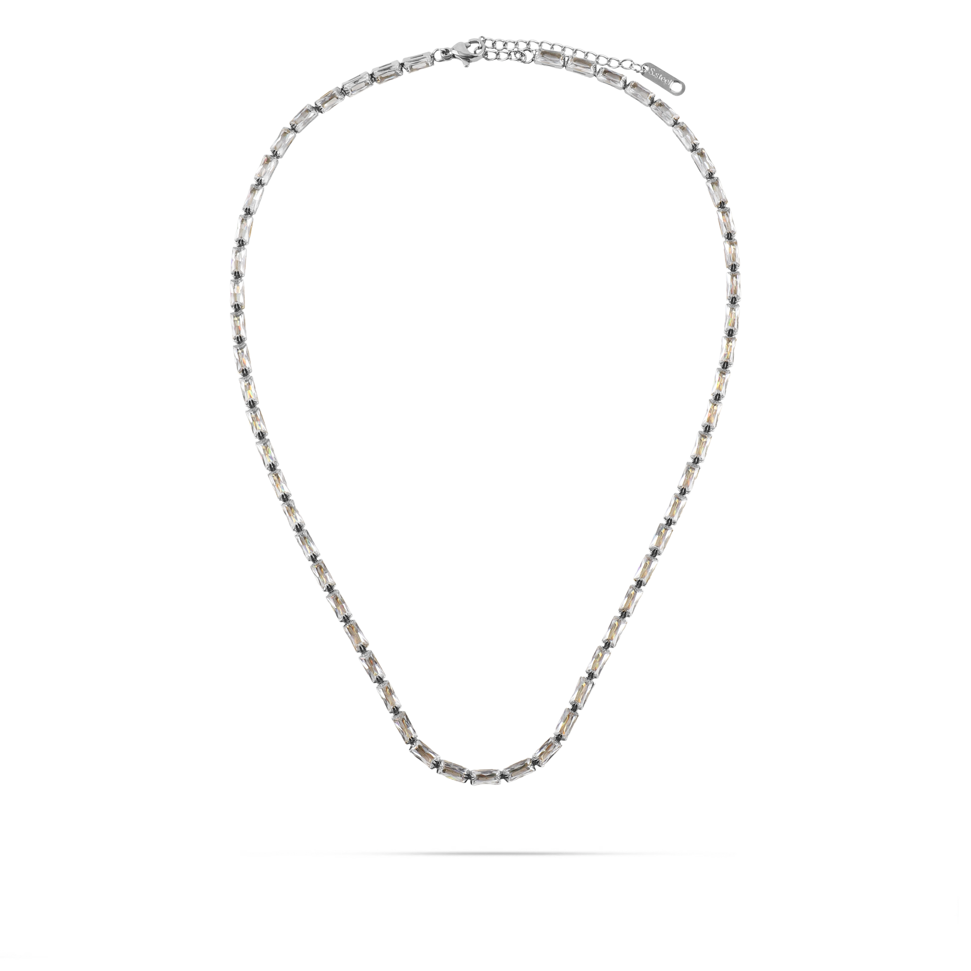 Κολιέ αλυσίδα λαιμού από ανοξείδωτο ατσάλι σε ασημί χρώμα, διακοσμημένο με λαμπερές λευκές πέτρες Baguette Zircon που χαρίζουν εκθαμβωτική λάμψη και κομψότητα στο κόσμημα. Η λεπτή αλυσίδα λαιμού προσφέρει διακριτική φινέτσα, ενώ η ανθεκτική κατασκευή από ανοξείδωτο ατσάλι εξασφαλίζει διαχρονική λάμψη και καθημερινή χρήση. Ένα εκλεπτυσμένο κόσμημα που μπορεί να φορεθεί μόνο του ή να συνδυαστεί με άλλα αξεσουάρ, ολοκληρώνοντας κάθε εμφάνιση με στυλ και διακριτική πολυτέλεια.