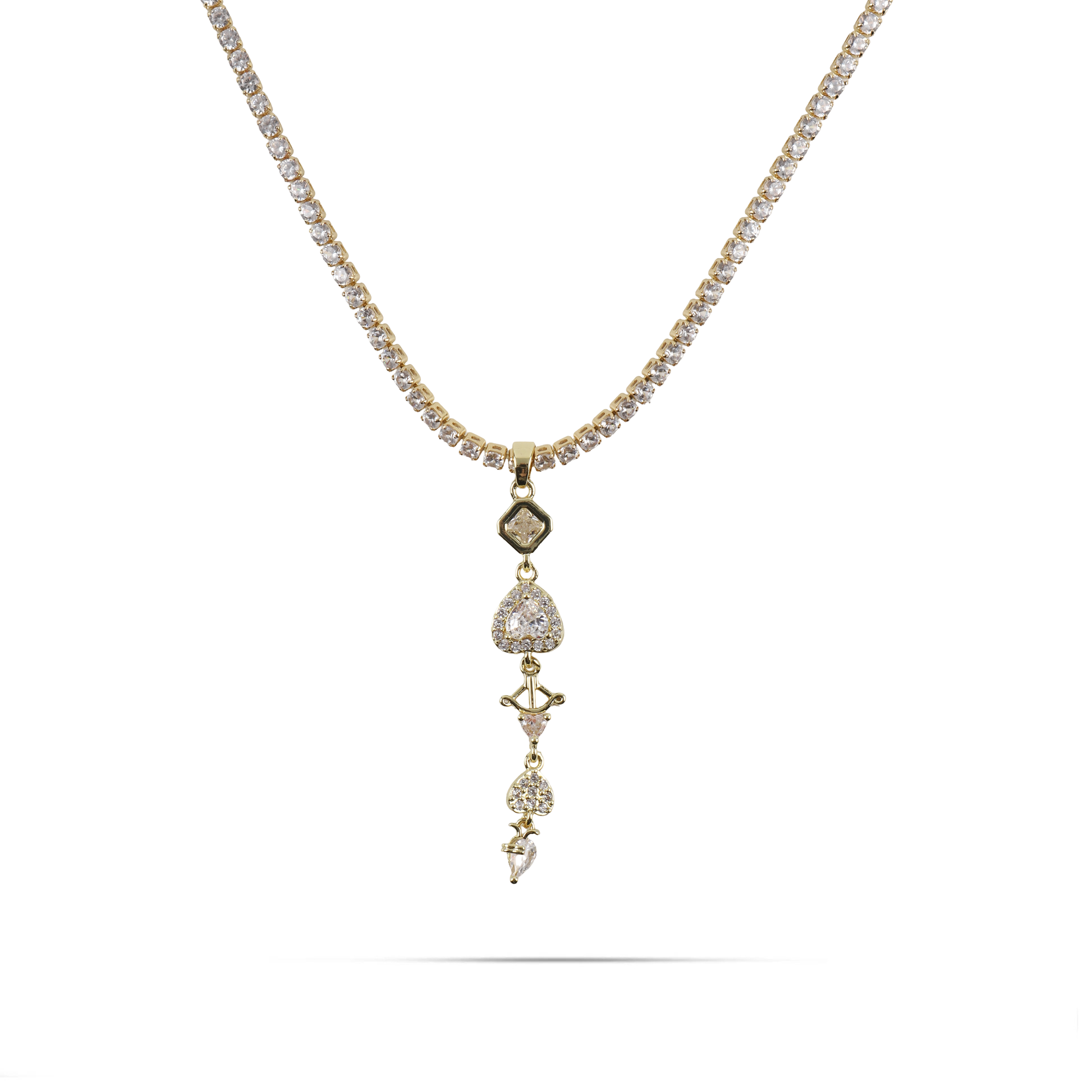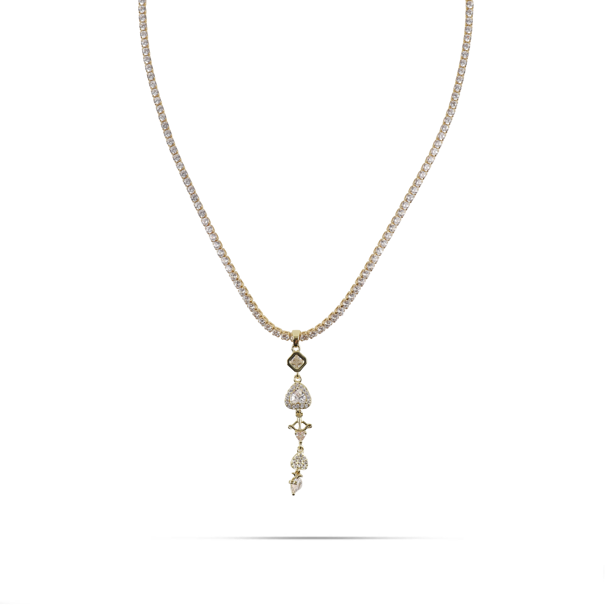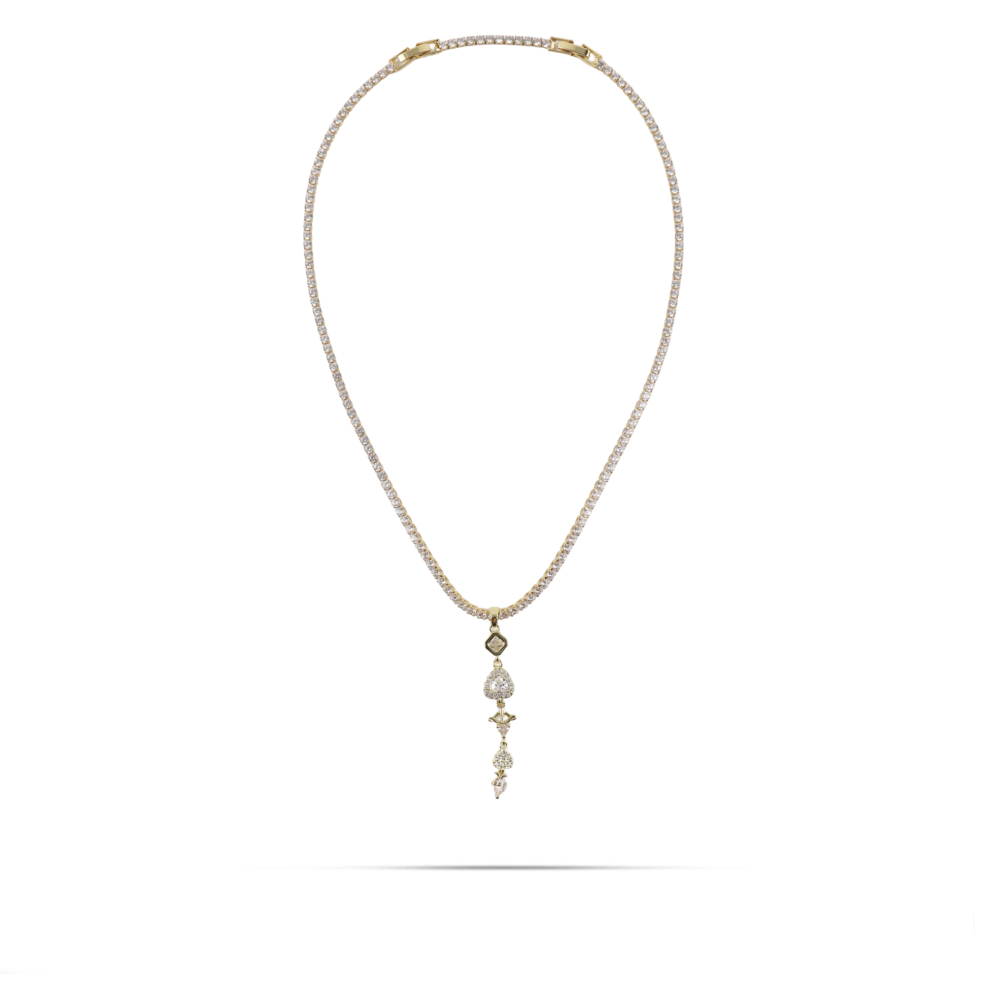 Το κολιέ Mar and Mar Selica σε χρυσό χρώμα αποτελεί την επιτομή της αριστοκρατικής πολυτέλειας, με τον σχεδιασμό του να θυμίζει ένα πολύτιμο "Y" κειμήλιο που αιχμαλωτίζει το βλέμμα. Η λεπτή αλυσίδα "tennis", στολισμένη με μια συνεχή σειρά από αστραφτερά ζιργκόν, καταλήγει σε ένα εντυπωσιακό κρεμαστό στοιχείο από κρυστάλλους σε διαφορετικά γεωμετρικά σχήματα που ρέουν αρμονικά προς τα κάτω. Κατασκευασμένο από υψηλής ποιότητας ανοξείδωτο ατσάλι για μέγιστη ανθεκτικότητα και αναλλοίωτη χρυσή λάμψη, είναι η ιδανική επιλογή για τη γυναίκα που αναζητά ένα "high-end" statement κόσμημα με σοφιστικέ αισθητική και εκτυφλωτική λάμψη. ✨