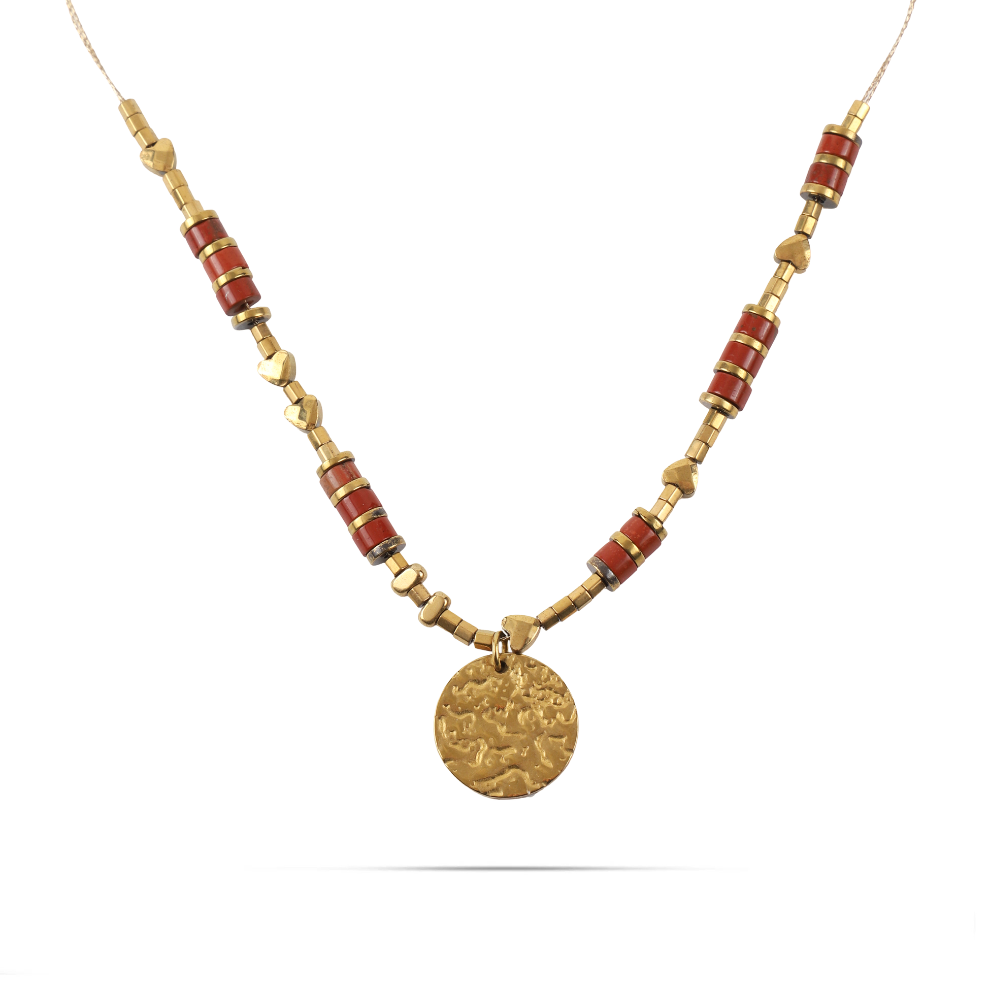 Το κολιέ Mar and Mar Cytherea συνδυάζει τη γοητεία του vintage στυλ με μοντέρνες λεπτομέρειες. Διαθέτει μπορντό χάντρες και μενταγιόν σε σχήμα σφυρηλάτου φλουριού, δημιουργώντας ένα κόσμημα με έντονη προσωπικότητα και ρομαντική αισθητική.