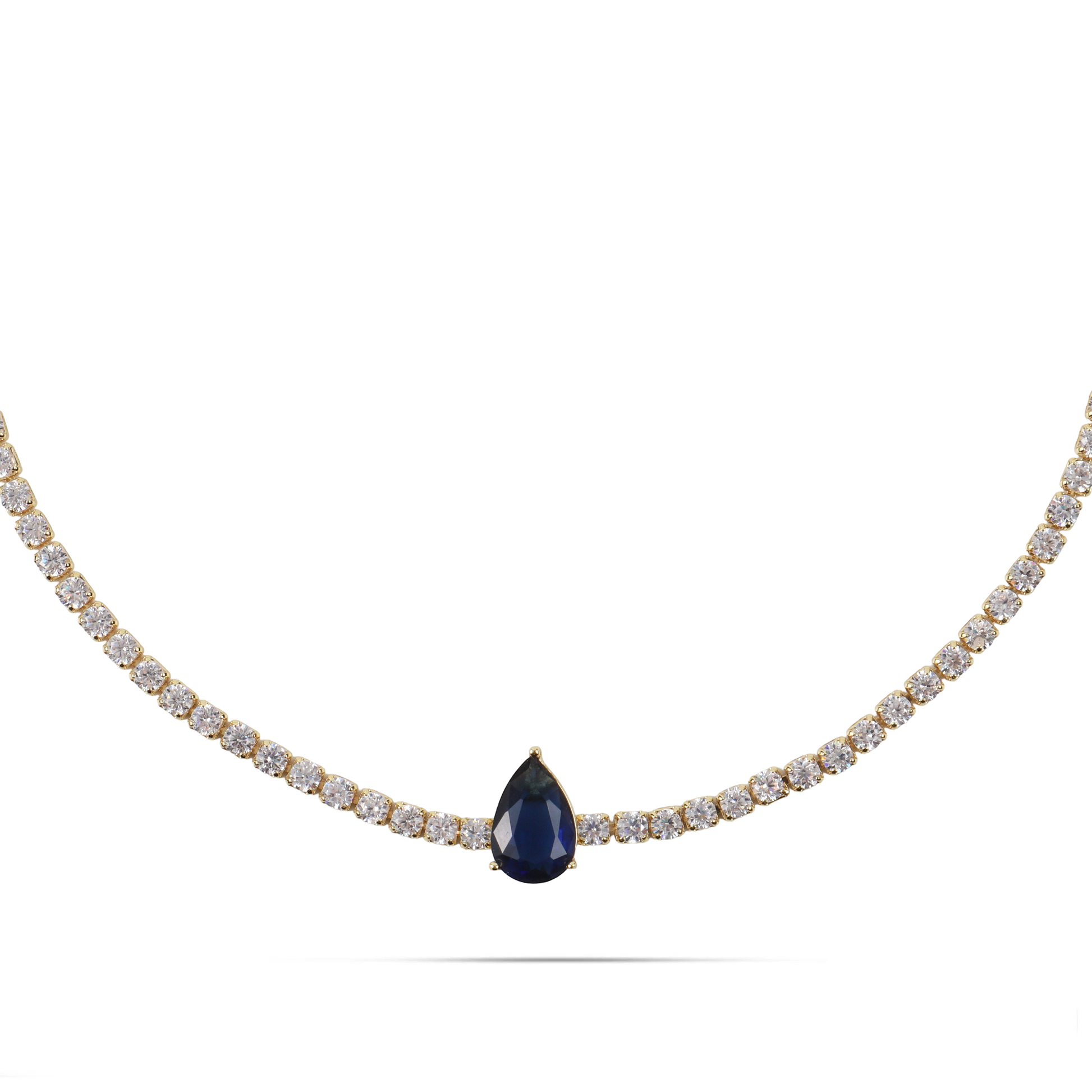 Κολιέ Choker Tennis Riviera σε χρυσό χρώμα, διακοσμημένο με μικρές λαμπερές λευκές πέτρες Zircon που προσδίδουν κομψή λάμψη και αναδεικνύουν τη μεγάλη μπλε Zircon σε σχήμα δάκρυ στο κέντρο. Ο συνδυασμός του ζεστού χρυσού με τη φωτεινότητα των λευκών πετρών και τη βαθιά μπλε απόχρωση δημιουργεί ένα εκθαμβωτικό και πολυτελές κόσμημα. Ιδανικό για επίσημες εκδηλώσεις, βραδινές εμφανίσεις ή ιδιαίτερες περιστάσεις, αυτό το choker χαρίζει μοναδική λάμψη και στυλ, ολοκληρώνοντας κάθε εμφάνιση με φινέτσα.
