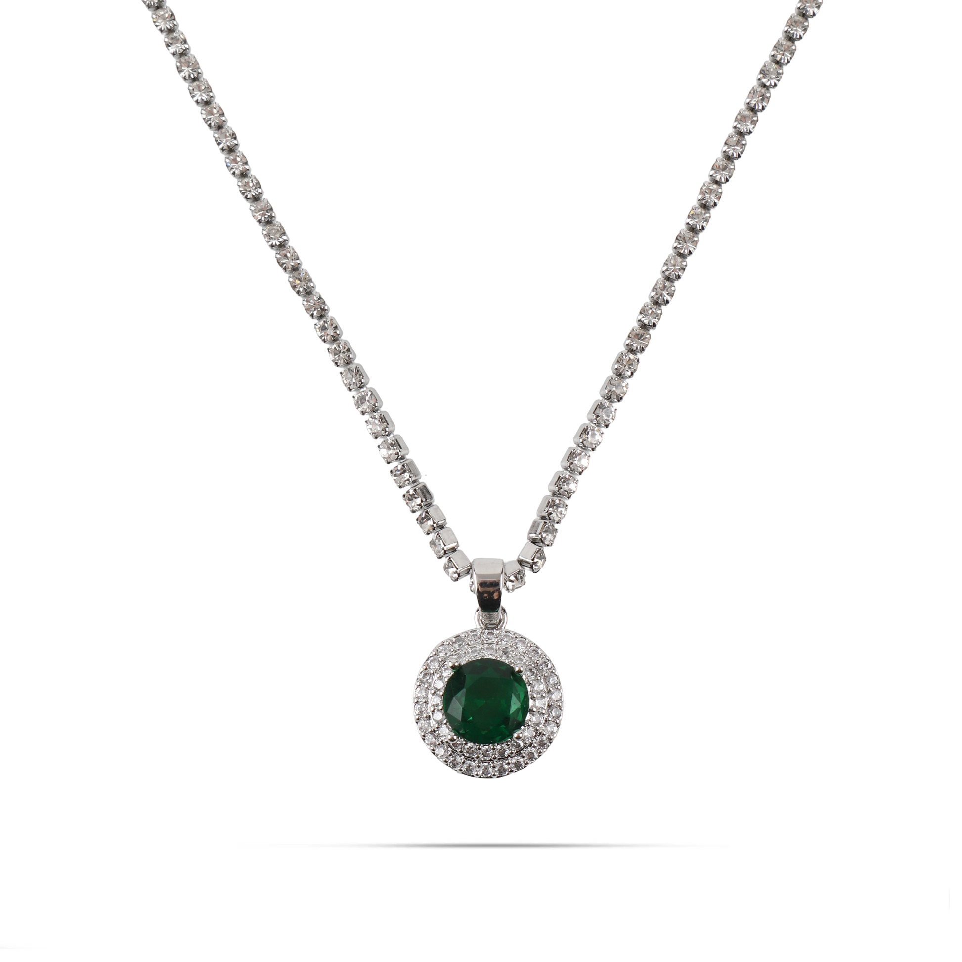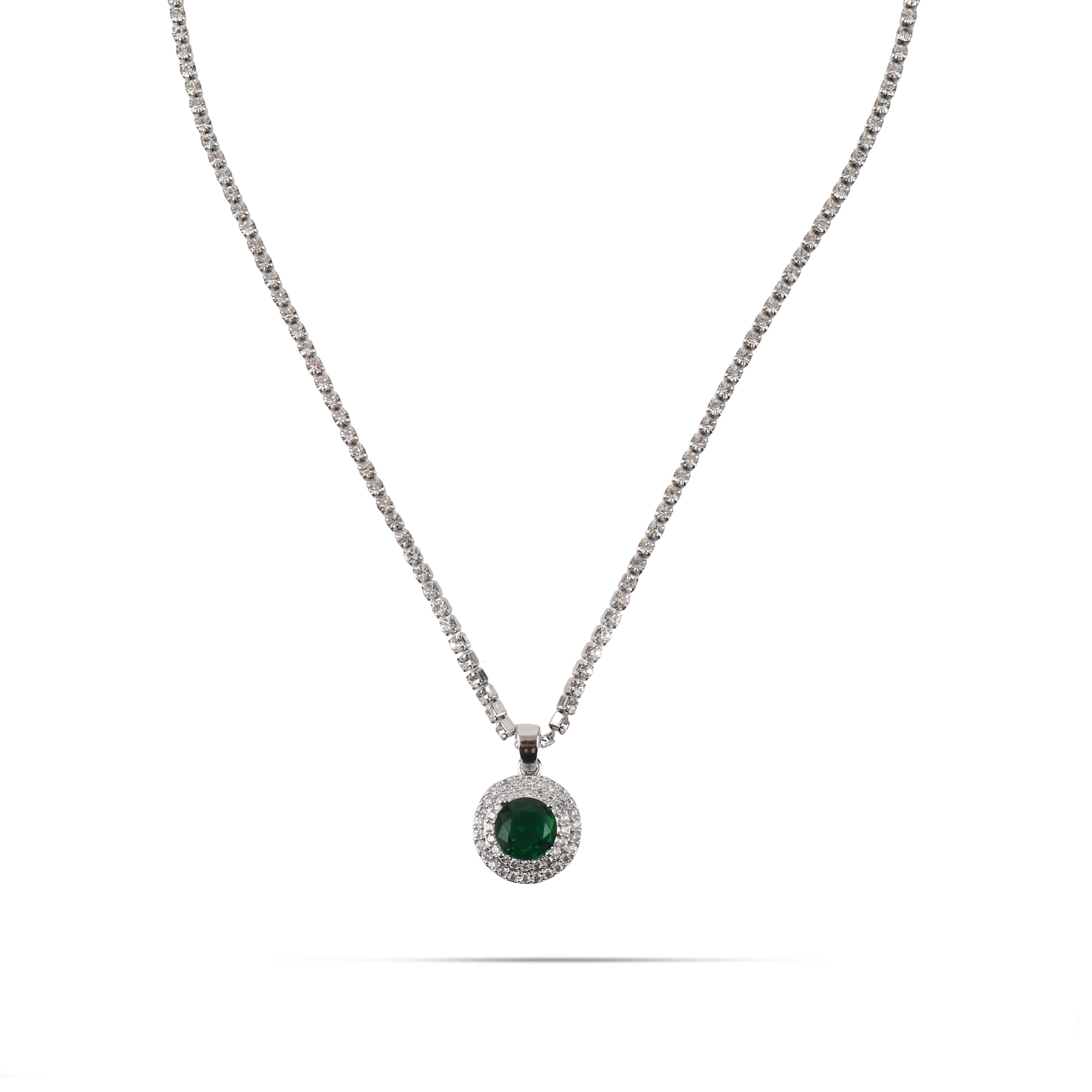 Κολιέ Tennis Riviera λαιμού σε ασημί χρώμα, διακοσμημένο με λαμπερές λευκές πέτρες Zircon που προσδίδουν εκθαμβωτική λάμψη, ενώ το κεντρικό μενταγιόν φιλοξενεί μία εντυπωσιακή πράσινη πέτρα Zircon που τραβάει τα βλέμματα. Ο συνδυασμός της φωτεινότητας των λευκών πετρών με την ζωντανή πράσινη απόχρωση δημιουργεί ένα κόσμημα με κομψό και μοντέρνο χαρακτήρα. Ιδανικό για βραδινές εμφανίσεις, ειδικές περιστάσεις ή για να δώσετε μια λαμπερή πινελιά στο καθημερινό σας στυλ.
