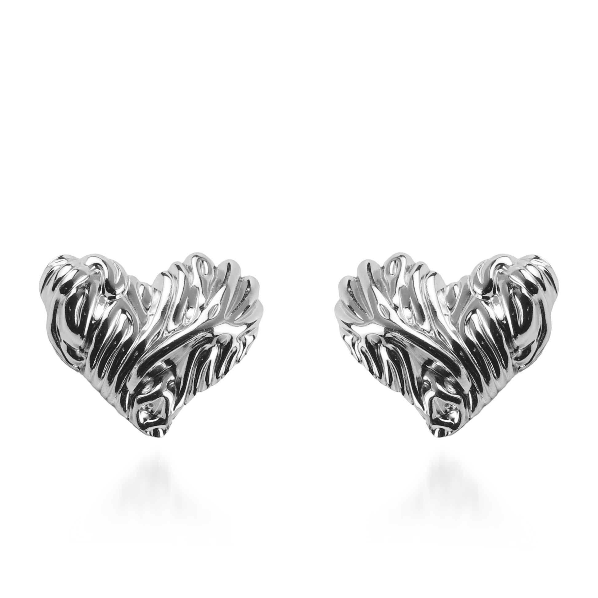 Τα σκουλαρίκια καρφωτά Mar and Mar Kalanthe σε ασημί χρώμα αποτελούν ένα άκρως εντυπωσιακό statement κόσμημα, με τον επιβλητικό τους σχεδιασμό σε σχήμα καρδιάς και το μεγάλο τους μέγεθος να μαγνητίζουν το βλέμμα. Η έντονη ανάγλυφη υφή τους, που θυμίζει ρέον μέταλλο ή σμιλεμένο φτερό, δημιουργεί ένα μοναδικό τρισδιάστατο εφέ και ένα δυναμικό παιχνίδισμα με το φως, προσφέροντας έναν αέρα "high fashion" και καλλιτεχνικής δημιουργίας.