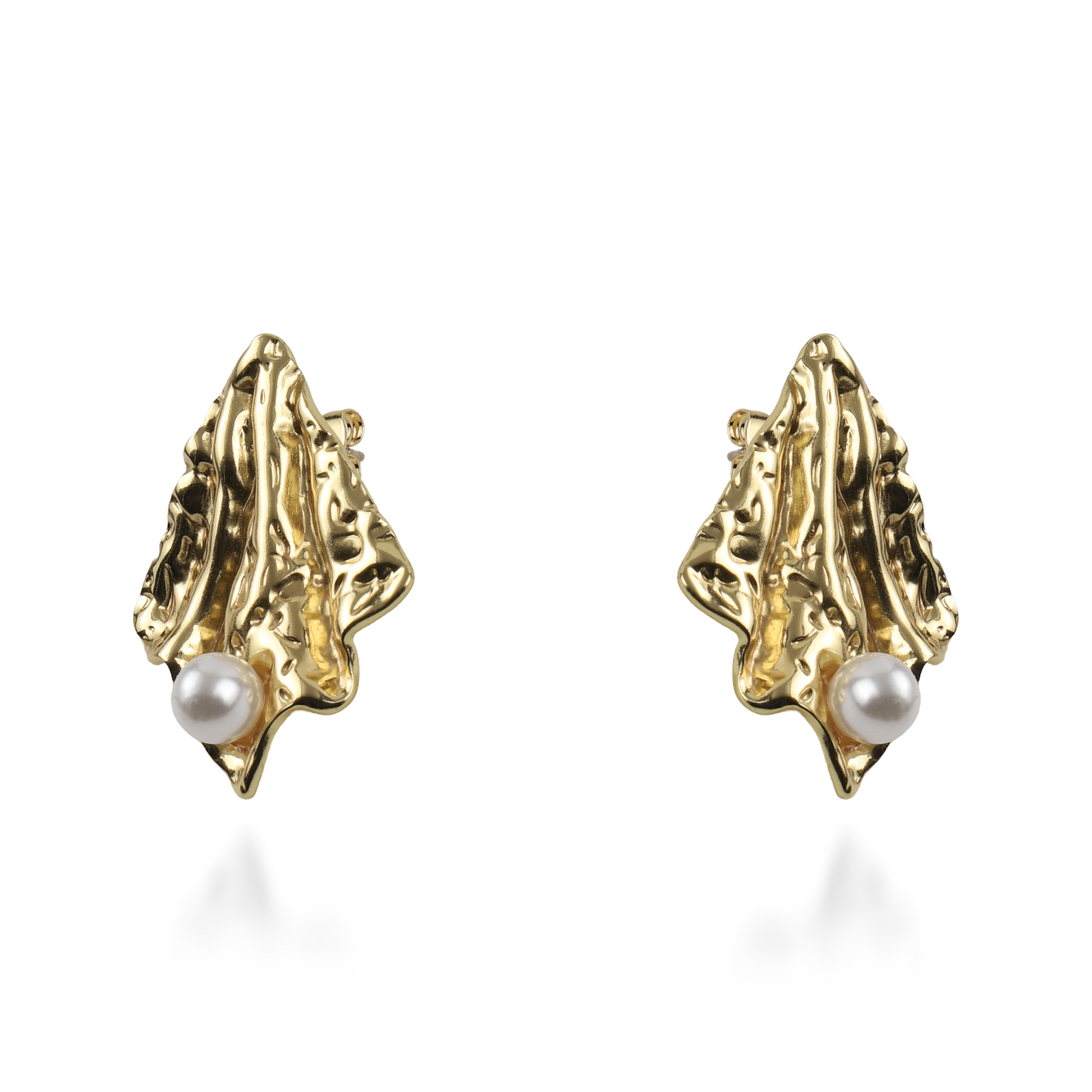 Τα σκουλαρίκια καρφωτά Mar and Mar Nereis σε χρυσό χρώμα αποτελούν ένα κόσμημα υψηλής αισθητικής, με τον οργανικό, σφυρήλατο σχεδιασμό τους να θυμίζει σπάνιο κοχύλι που αναδύεται από τον βυθό. Η ακανόνιστη, ανάγλυφη επιφάνειά τους δημιουργεί ένα εντυπωσιακό παιχνίδισμα με το φως, το οποίο ολοκληρώνεται με μια διακριτική πέρλα στη βάση, προσδίδοντας μια νότα κλασικής πολυτέλειας. Κατασκευασμένα από ανοξείδωτο ατσάλι για μέγιστη ανθεκτικότητα και αναλλοίωτη λάμψη, αποτελούν ένα «sculptural» statement αξεσουάρ που συνδυάζει τη μοντέρνα τέχνη με τη διαχρονική θηλυκότητα. ✨