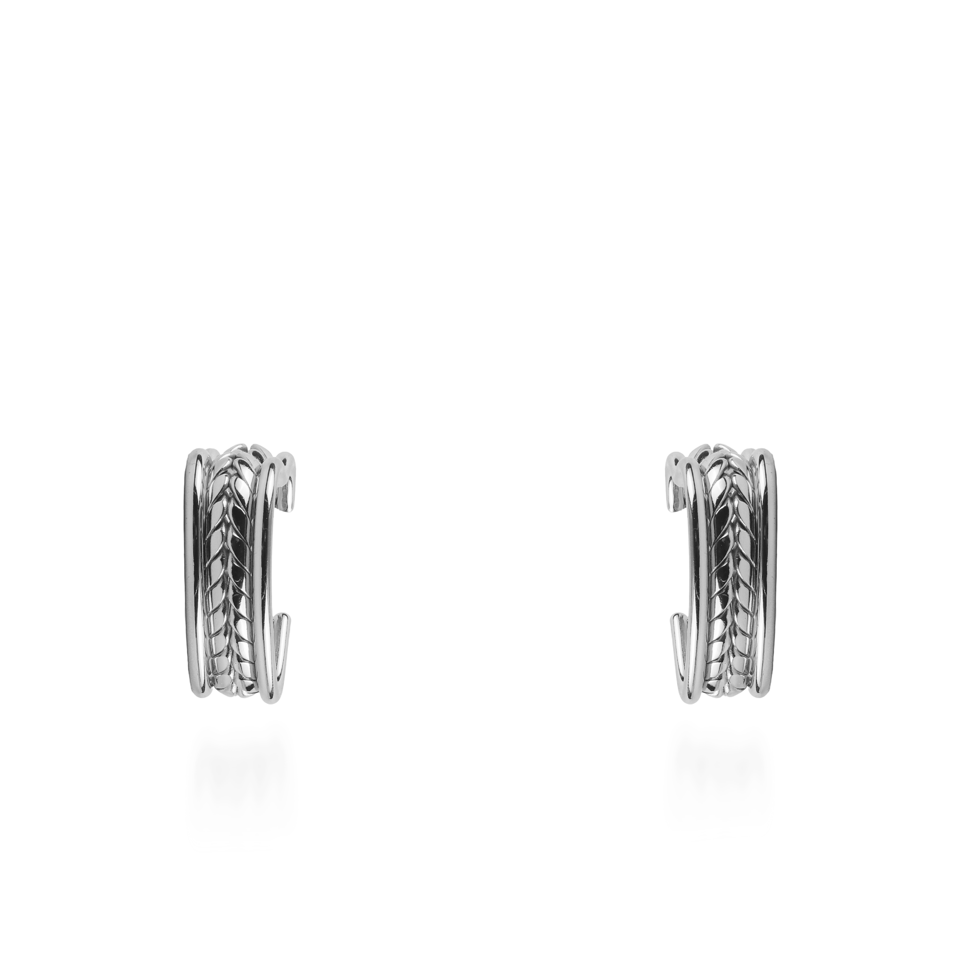 Τα σκουλαρίκια κρίκοι Mar and Mar Amora σε ασημί χρώμα επαναπροσδιορίζουν τον ρομαντισμό με μια σύγχρονη, αρχιτεκτονική ματιά, καθώς ο σχεδιασμός τους σχηματίζει μια διακριτική και κομψή καρδιά. Οι τρεις παράλληλες σειρές τους —με τις εξωτερικές να είναι λείες και την κεντρική να διαθέτει μια περίτεχνη, ανάγλυφη πλέξη— δημιουργούν ένα εντυπωσιακό παιχνίδισμα με το φως και μια αίσθηση «industrial chic» πολυτέλειας. Κατασκευασμένα από υψηλής ποιότητας ανοξείδωτο ατσάλι για μέγιστη ανθεκτικότητα και ψυχρή, καθαρή λάμψη, αποτελούν ένα μοναδικό statement κόσμημα που συνδυάζει τον δυναμισμό με τη θηλυκότητα, ιδανικό για να προσθέσετε χαρακτήρα σε κάθε σας εμφάνιση. 💎