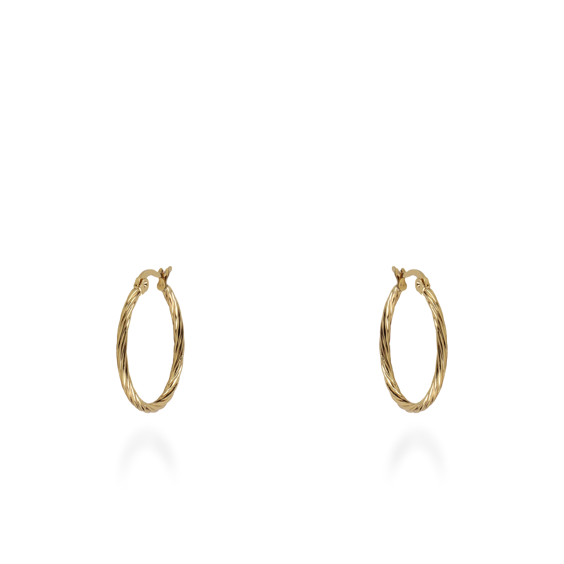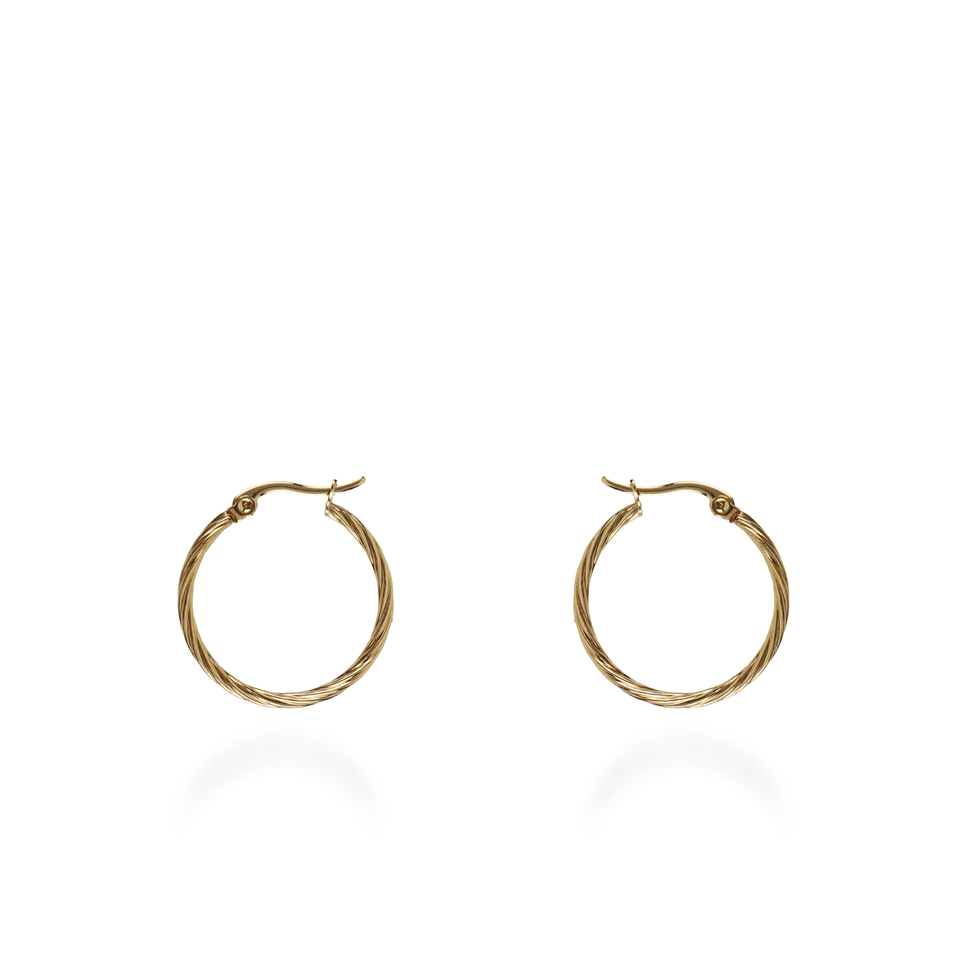 Τα σκουλαρίκια κρίκοι Mar and Mar Jayla σε χρυσό χρώμα αποπνέουν διακριτική πολυτέλεια και κομψότητα. Κατασκευασμένα από ανοξείδωτο ατσάλι, διαθέτουν διάμετρο 2,5 cm και στριφογυριστό σχέδιο που προσθέτει κίνηση και λάμψη στο στυλ σας.