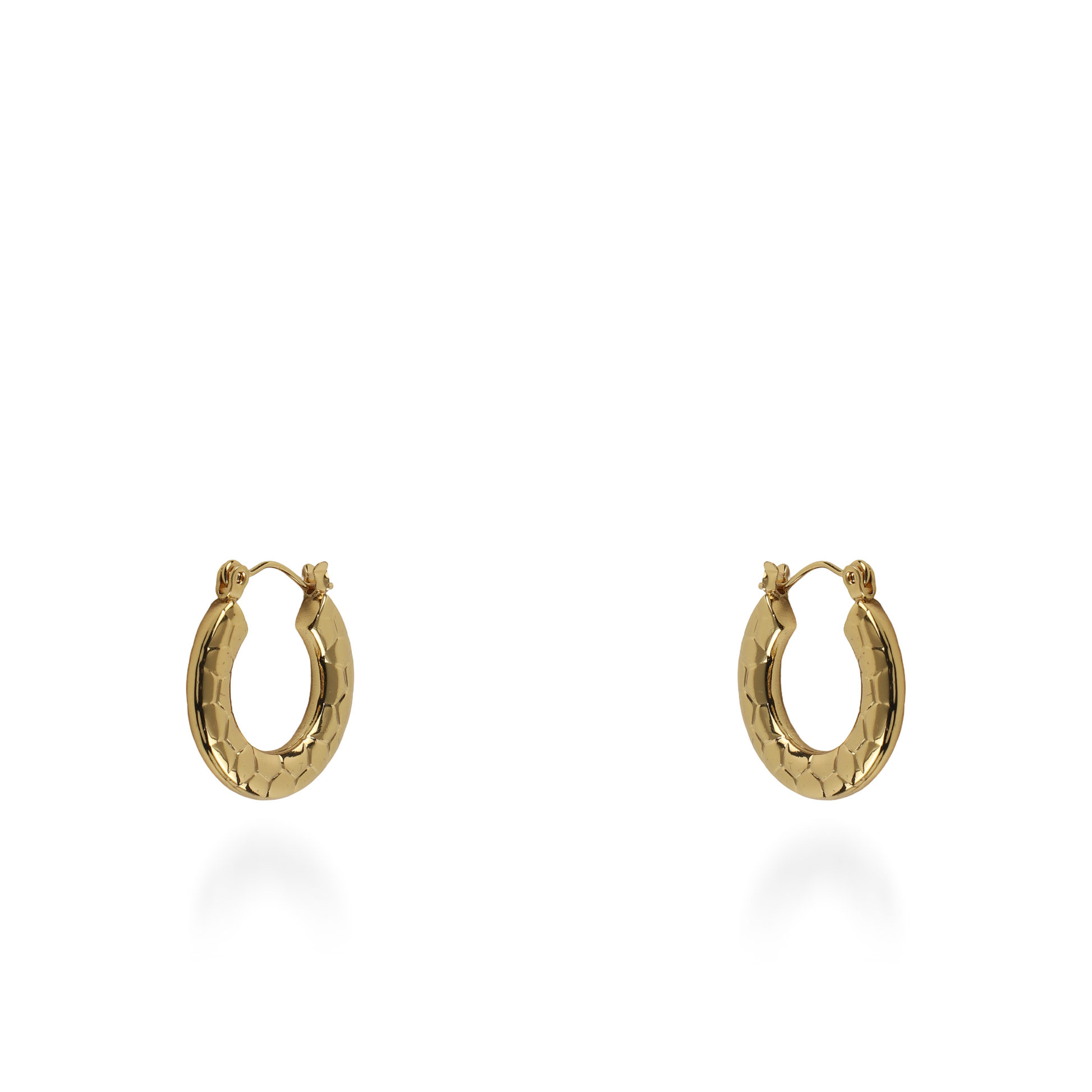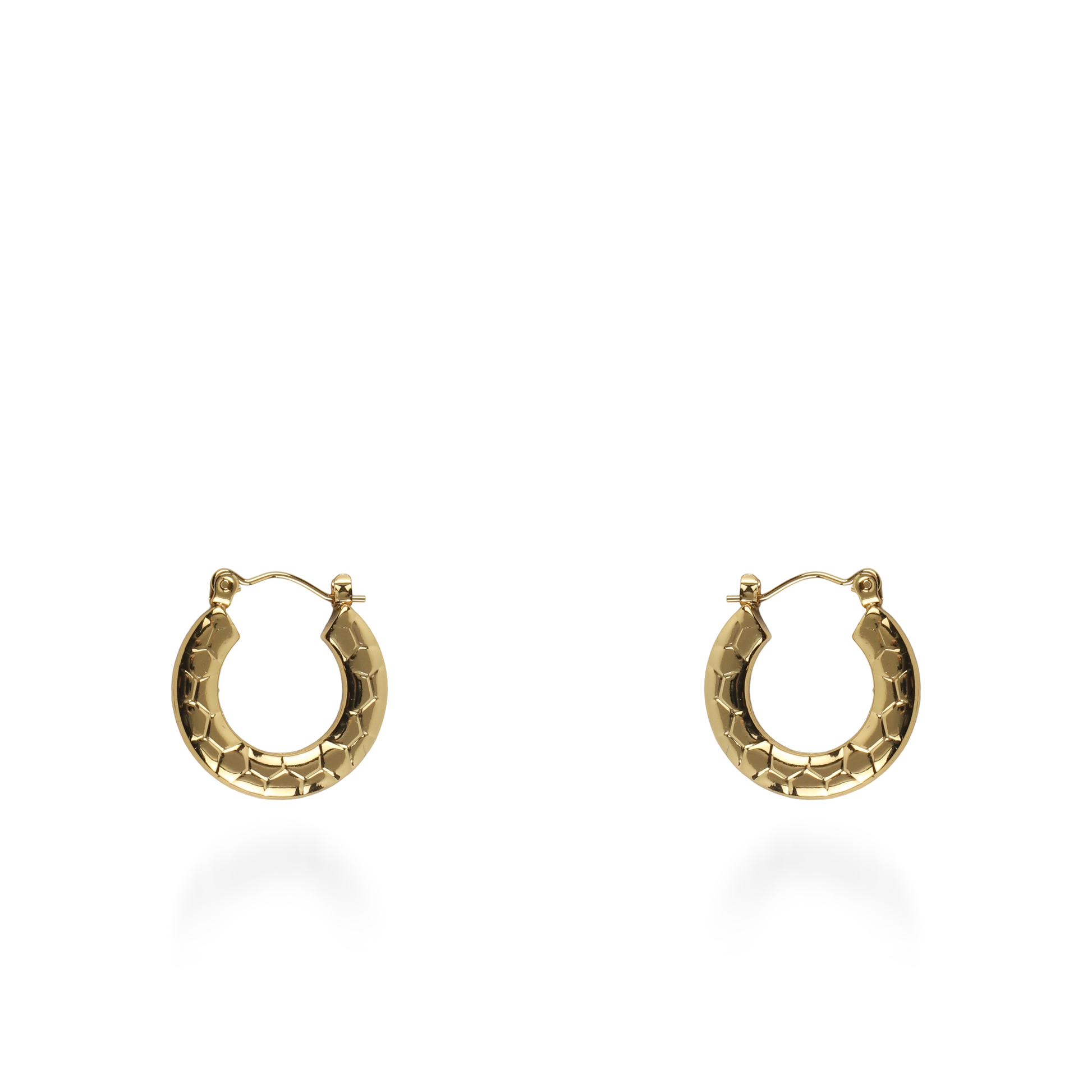 Τα σκουλαρίκια κρίκοι Mar and Mar Kyble σε χρυσό χρώμα ξεχωρίζουν για τον ιδιαίτερο, "honeycomb" σχεδιασμό τους, με την ανάγλυφη επιφάνειά τους να θυμίζει περίτεχνη κερήθρα. Το γεωμετρικό αυτό μοτίβο δημιουργεί ένα εντυπωσιακό παιχνίδισμα με το φως, προσφέροντας έναν διακριτικό όγκο και μια αίσθηση σύγχρονης πολυτέλειας. Κατασκευασμένα από υψηλής ποιότητας ανοξείδωτο ατσάλι για μέγιστη ανθεκτικότητα και αναλλοίωτη λάμψη, αποτελούν ένα minimal αλλά σοφιστικέ statement κόσμημα, ιδανικό για να προσθέσετε μια πινελιά αρχιτεκτονικής φινέτσας και δυναμισμού σε κάθε σας εμφάνιση. ✨