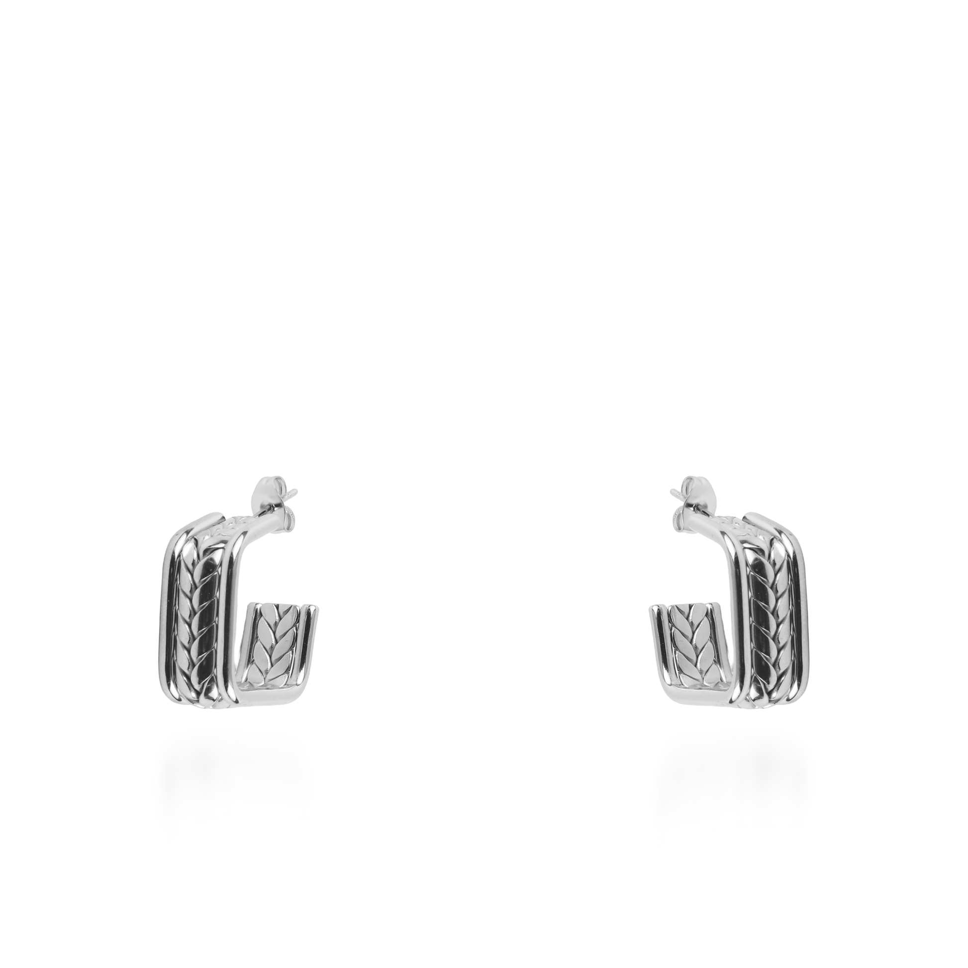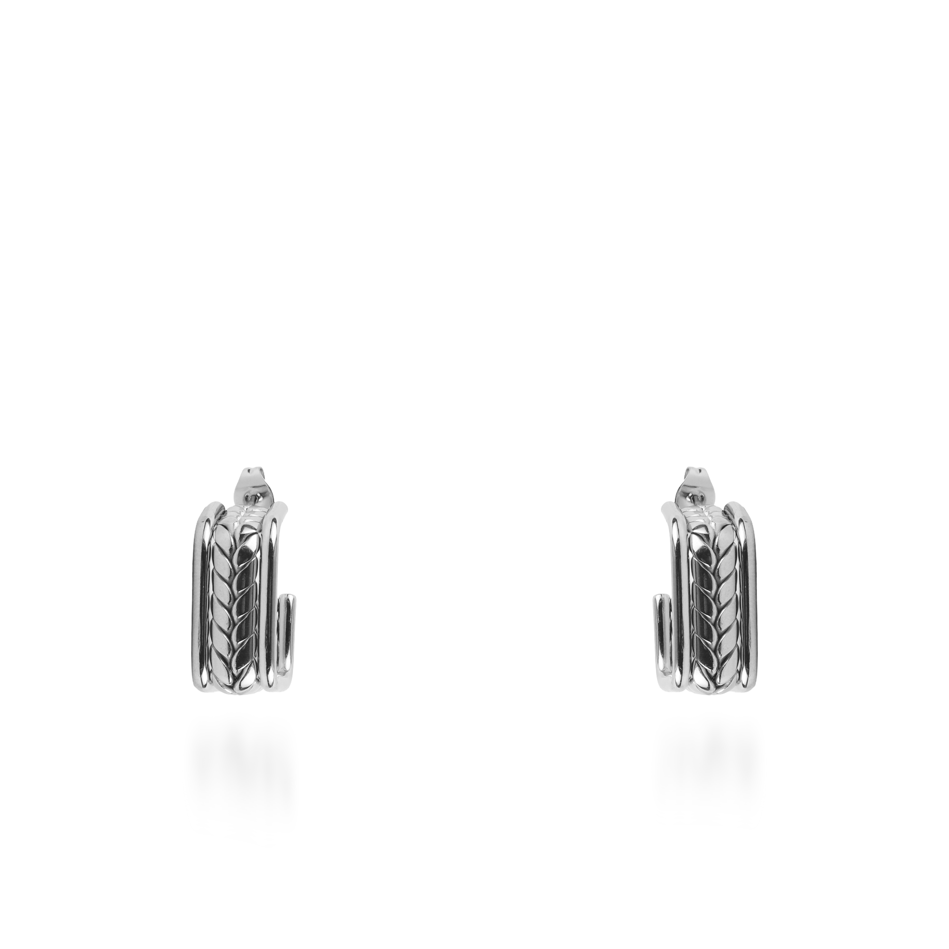 Τα σκουλαρίκια κρίκοι Mar and Mar Vespera σε ασημί χρώμα εντυπωσιάζουν με τον ιδιαίτερο, τετραγωνισμένο σχεδιασμό τους που συνδυάζει την "industrial" αισθητική με την κλασική κομψότητα. Η κεντρική, ανάγλυφη πλέξη τους θυμίζει περίτεχνη πλεξούδα ή στάχυ, προσδίδοντας μια μοναδική υφή και έναν σοφιστικέ χαρακτήρα στο κόσμημα. Κατασκευασμένα από υψηλής ποιότητας ανοξείδωτο ατσάλι για μέγιστη ανθεκτικότητα και ψυχρή, κρυστάλλινη λάμψη, αποτελούν ένα μοντέρνο statement αξεσουάρ με αρχιτεκτονική γραμμή, ιδανικό για να προσθέσετε μια πινελιά δυναμισμού και σύγχρονης φινέτσας σε κάθε σας εμφάνιση. 💎