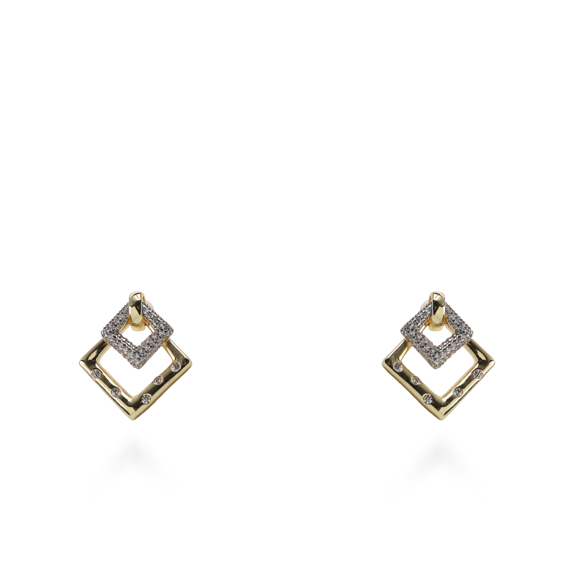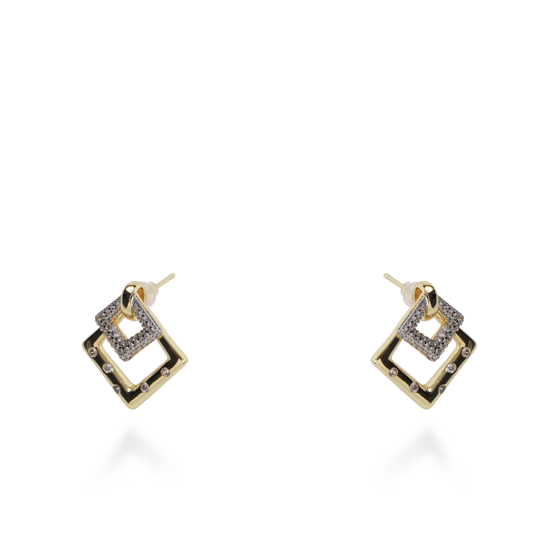 Τα σκουλαρίκια κρεμαστά Mar and Mar Estia σε χρυσό χρώμα αποτελούν ένα κόσμημα με σύγχρονη γεωμετρική αισθητική, που συνδυάζει την πολυτέλεια με τις καθαρές γραμμές. Ο ιδιαίτερος σχεδιασμός τους με τους δύο αλληλένδετους ρόμβους —ο ένας με λεία χρυσή επιφάνεια και ο άλλος πυκνά στολισμένος με αστραφτερά ζιργκόν— δημιουργεί ένα εντυπωσιακό παιχνίδισμα με το φως και μια αίσθηση βάθους. Κατασκευασμένα από υψηλής ποιότητας ορείχαλκο για αναλλοίωτη λάμψη, αποτελούν το ιδανικό statement αξεσουάρ που προσθέτει μια νότα αρχιτεκτονικής κομψότητας και λάμψης σε κάθε σας εμφάνιση. ✨