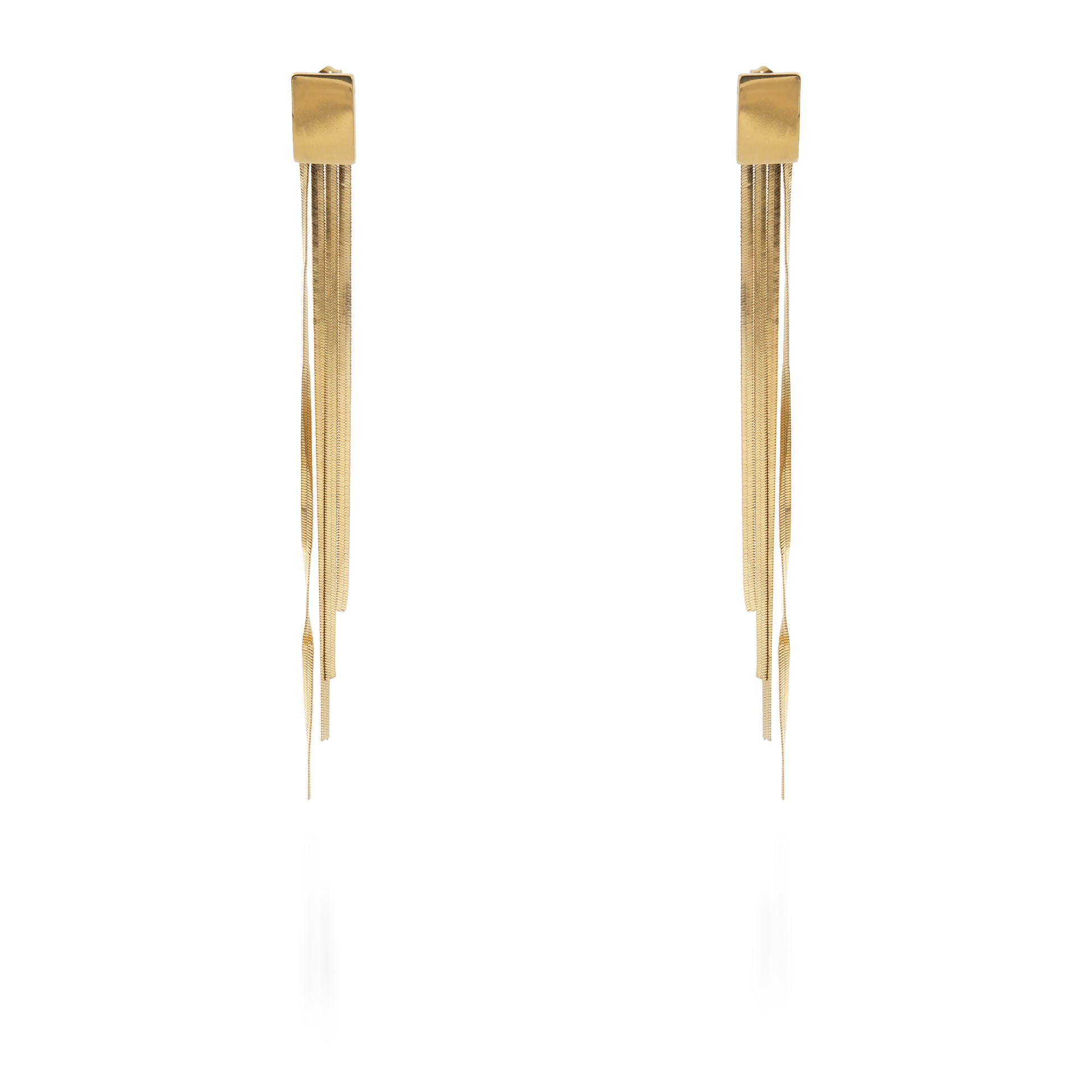 Σκουλαρίκια κρεμαστά από ανοξείδωτο ατσάλι σε χρυσό χρώμα, με ορθογώνιο σχήμα και κομψά Flat Snake αλυσιδάκια, που χαρίζουν κίνηση και λάμψη σε κάθε σας εμφάνιση. Η διαχρονική ασημένια απόχρωση και η αντοχή του ανοξείδωτου ατσαλιού τα καθιστούν ιδανική επιλογή για καθημερινή χρήση αλλά και για ιδιαίτερες περιστάσεις.