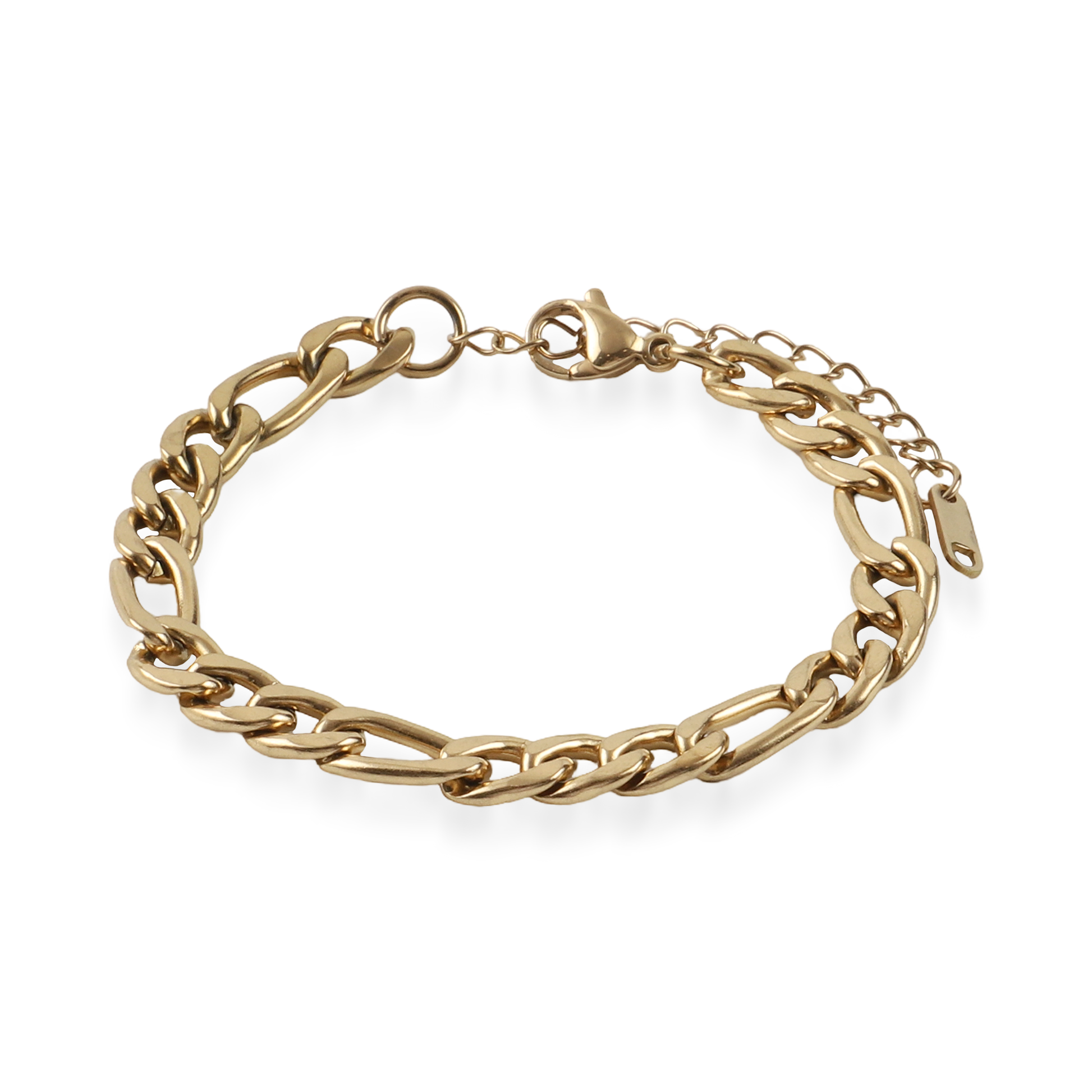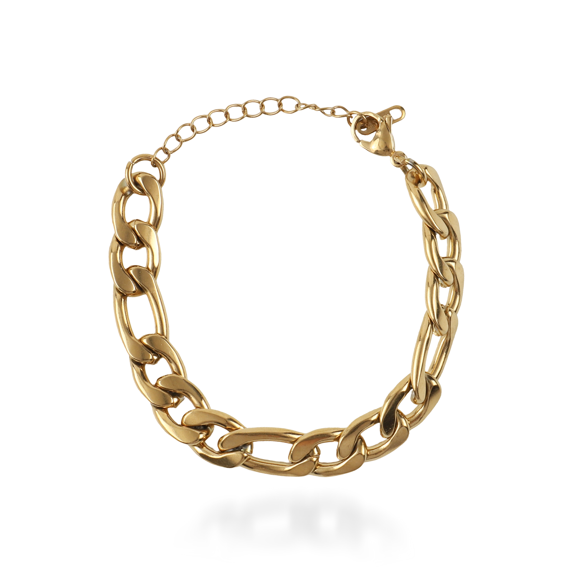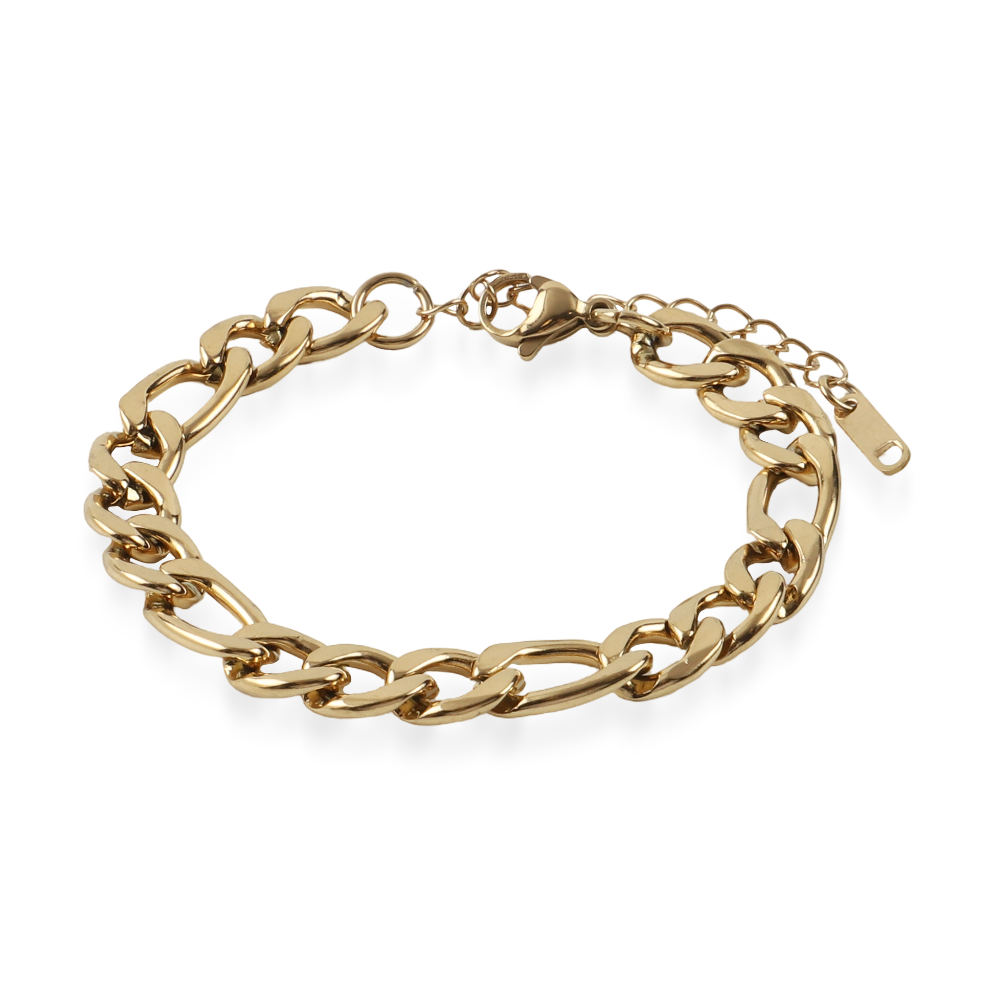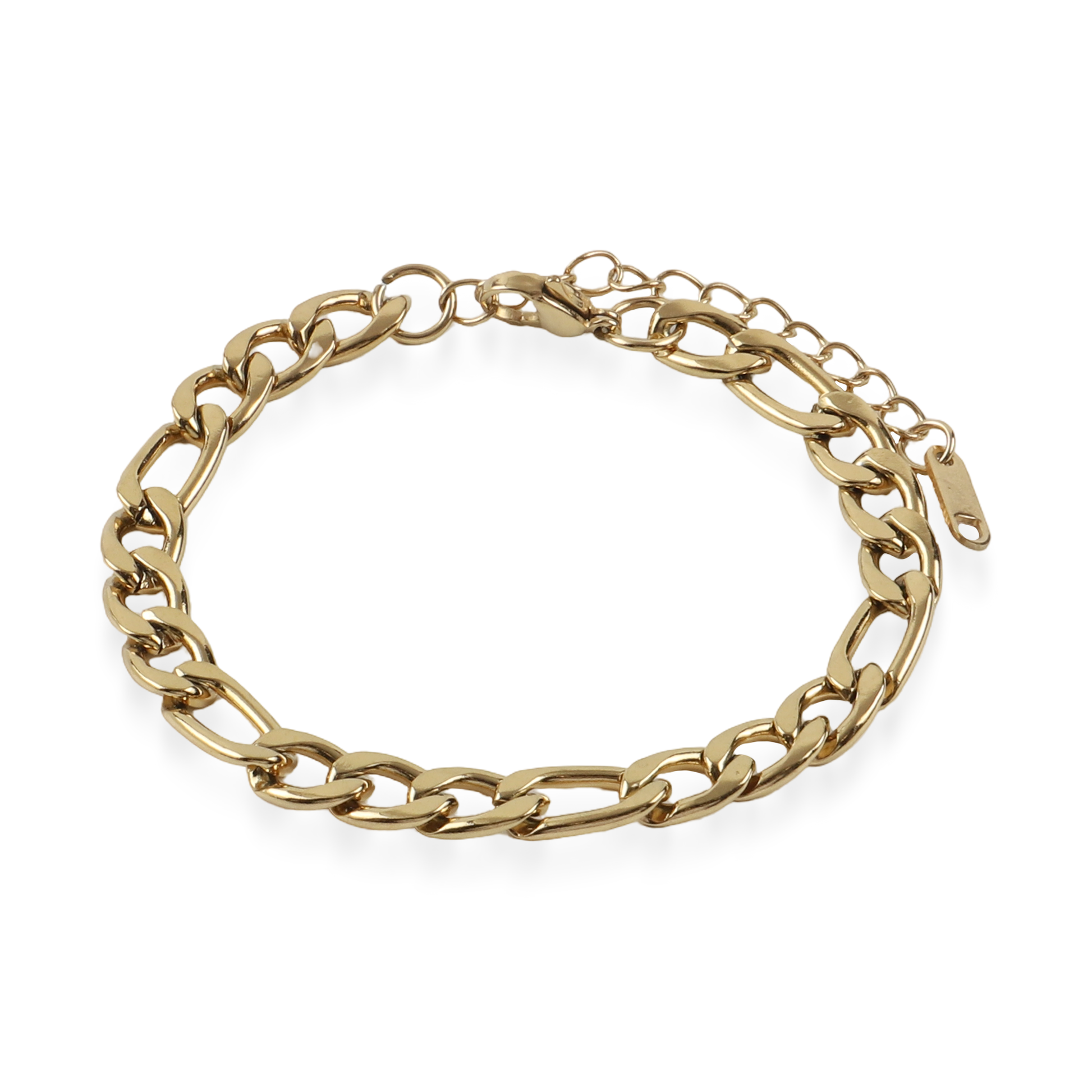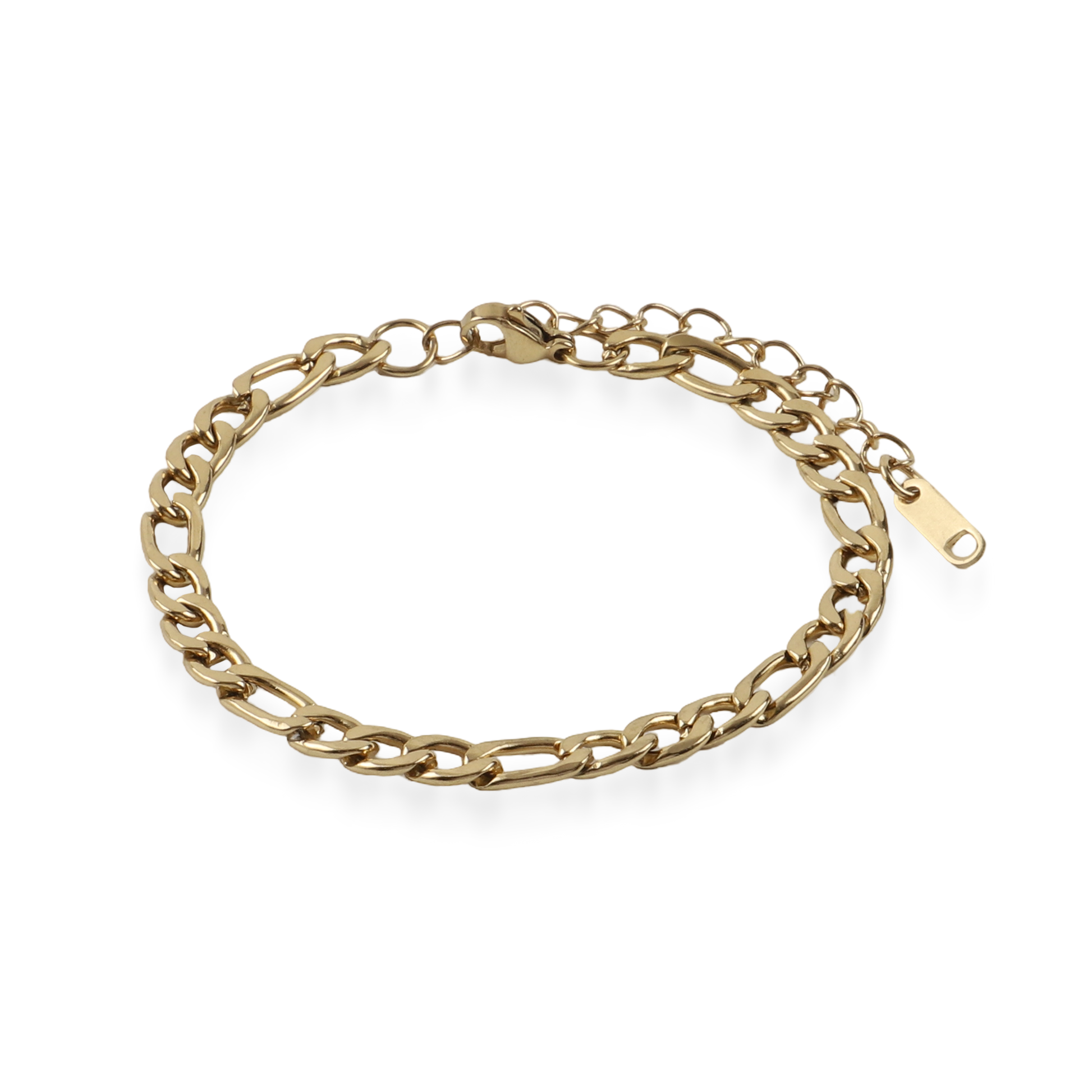 Η αλυσίδα χεριού Figaro σε χρυσό χρώμα από ανοξείδωτο ατσάλι αποτελεί ένα κομψό και διαχρονικό κόσμημα. Ο χαρακτηριστικός σχεδιασμός Figaro, με την εναλλαγή μεγάλων και μικρών κρίκων, προσδίδει έναν ιδιαίτερο ρυθμό και κομψότητα στο βραχιόλι. Η ανοξείδωτη κατασκευή εξασφαλίζει αντοχή και μακροχρόνια χρήση, ενώ το χρυσό φινίρισμα διατηρεί τη λάμψη του χωρίς να αλλοιώνεται με τον χρόνο. Ιδανικό για καθημερινή εμφάνιση, φοριέται άνετα μόνο του ή σε συνδυασμό με άλλα βραχιόλια.