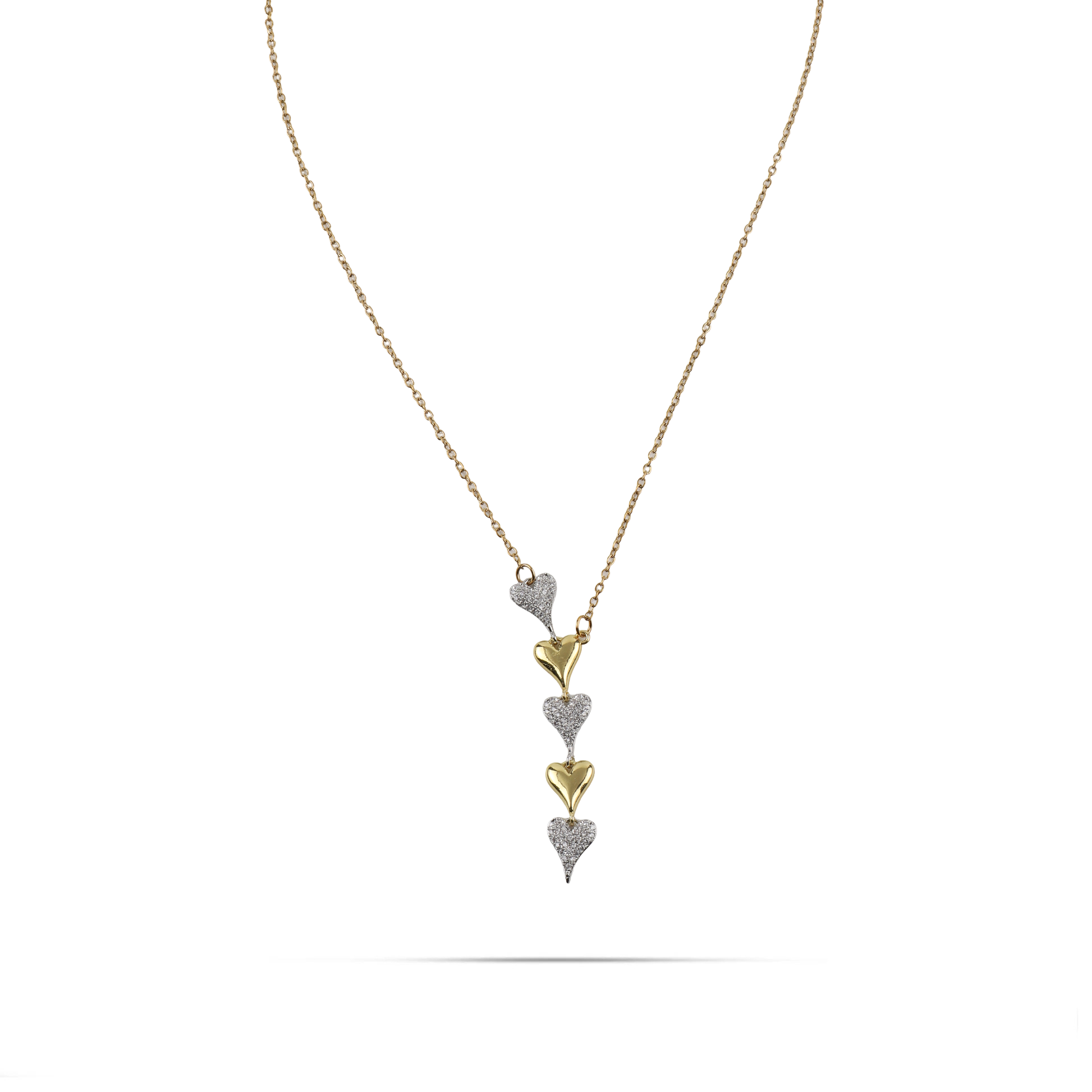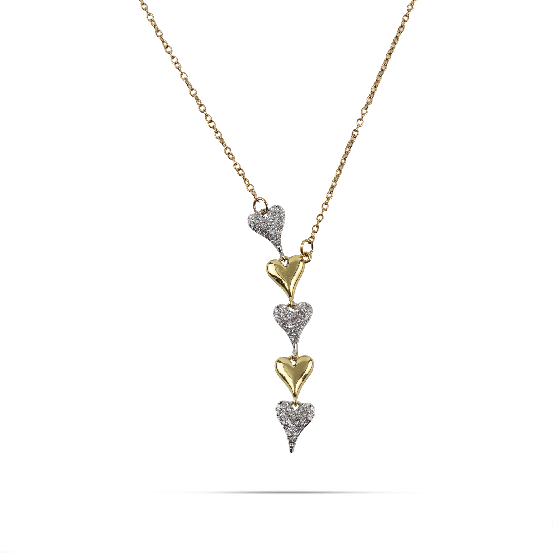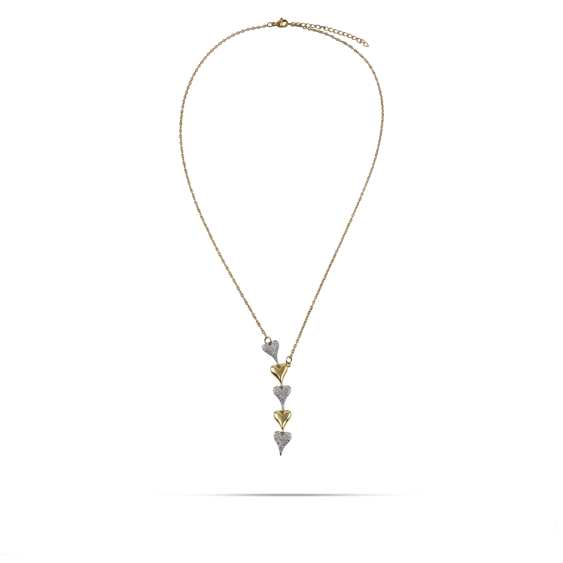 Το κολιέ Mar and Mar Amaris σε χρυσό χρώμα αποτελεί μια ωδή στον ρομαντισμό, με τις πέντε κάθετα διατεταγμένες καρδιές να δημιουργούν μια εντυπωσιακή και ρέουσα σιλουέτα. Η εναλλαγή ανάμεσα στις λείες, χρυσές καρδιές και εκείνες που είναι πυκνά στολισμένες με αστραφτερά ζιργκόν προσφέρει ένα πολυτελές παιχνίδισμα με το φως και μια αίσθηση διαρκούς κίνησης. Κατασκευασμένο από υψηλής ποιότητας ανοξείδωτο ατσάλι για μέγιστη ανθεκτικότητα και αναλλοίωτη λάμψη, είναι η ιδανική επιλογή για να προσθέσετε μια νότα εκλεπτυσμένης θηλυκότητας και λάμψης σε κάθε σας εμφάνιση. ✨