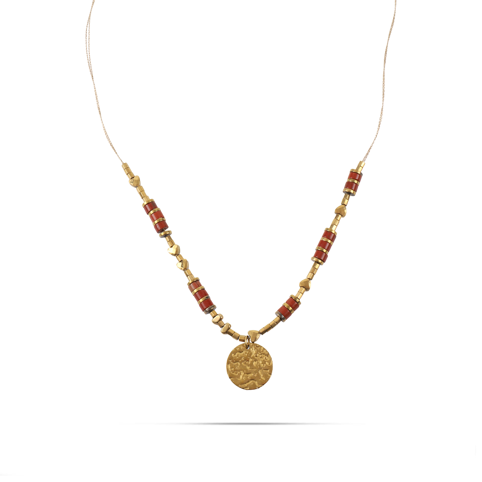 Το κολιέ Mar and Mar Cytherea συνδυάζει τη γοητεία του vintage στυλ με μοντέρνες λεπτομέρειες. Διαθέτει μπορντό χάντρες και μενταγιόν σε σχήμα σφυρηλάτου φλουριού, δημιουργώντας ένα κόσμημα με έντονη προσωπικότητα και ρομαντική αισθητική.