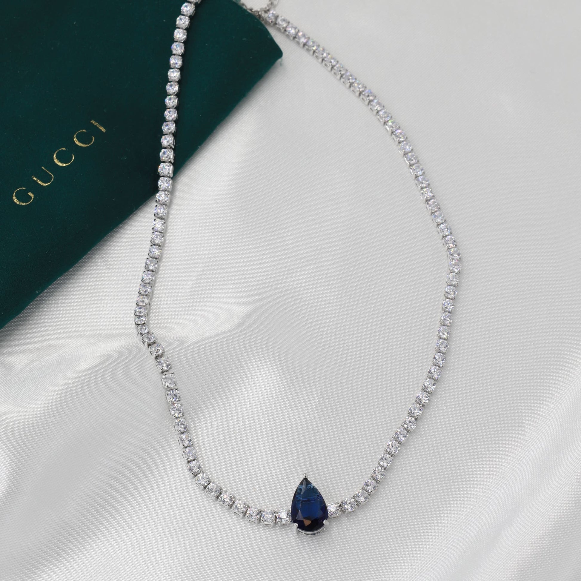 Κολιέ Choker Tennis Riviera σε ασημί χρώμα, διακοσμημένο με μικρές λαμπερές λευκές πέτρες Zircon που προσθέτουν κομψή λάμψη και αναδεικνύουν τη μεγάλη μπλε Zircon σε σχήμα δάκρυ στο κέντρο. Ο συνδυασμός του ασημί μετάλλου με τη φωτεινότητα των λευκών πετρών και τη βαθιά μπλε απόχρωση δημιουργεί ένα εκθαμβωτικό κόσμημα με διαχρονικό χαρακτήρα. Ιδανικό για βραδινές εμφανίσεις, επίσημες εκδηλώσεις ή ειδικές περιστάσεις, το choker αυτό προσφέρει λάμψη, φινέτσα και μοναδικό στυλ σε κάθε εμφάνιση.