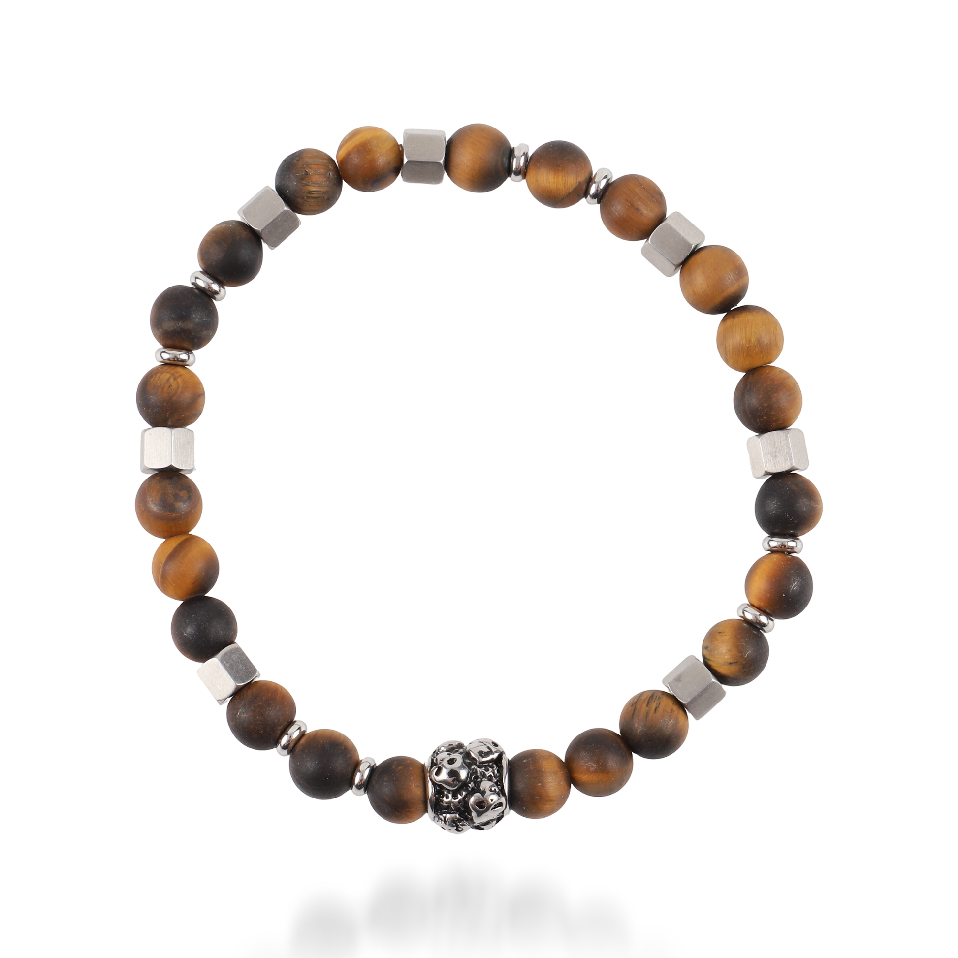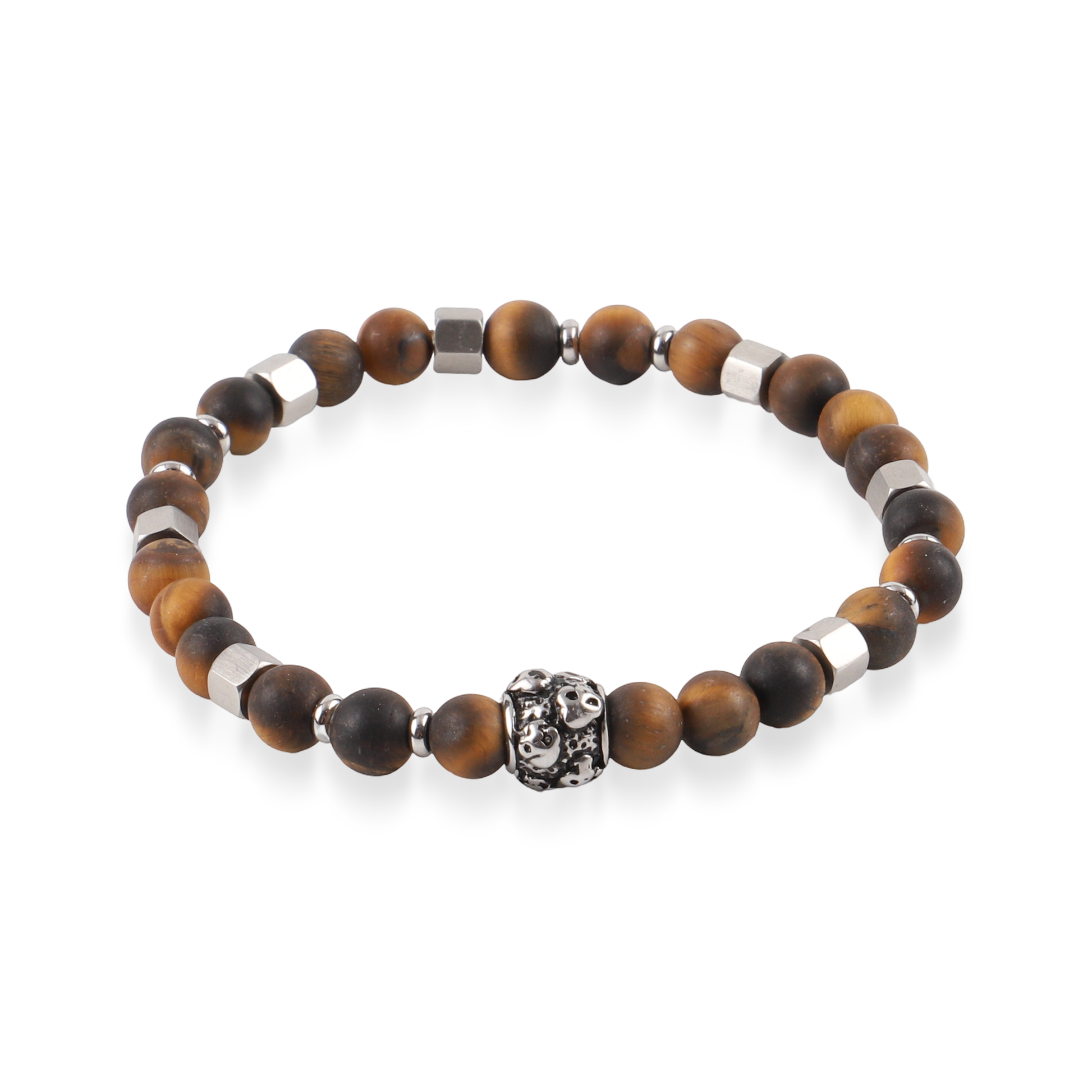 Το ανδρικό χειροποίητο βραχιόλι Mar and Mar Gavin Skulls συνδυάζει δυναμισμό και εκλεπτυσμένο στυλ. Κατασκευασμένο με φυσικές ορυκτές πέτρες Μάτι Τίγρης σε γήινες καφέ αποχρώσεις και λαμπερό Αιματίτη σε ασημί τόνο, αποπνέει ισορροπία και αυτοπεποίθηση. Η εντυπωσιακή λεπτομέρεια με νεκροκεφαλή από ανοξείδωτο ατσάλι ολοκληρώνει τον τολμηρό χαρακτήρα του βραχιολιού, καθιστώντας το ιδανικό για τον άνδρα που δεν φοβάται να ξεχωρίσει.