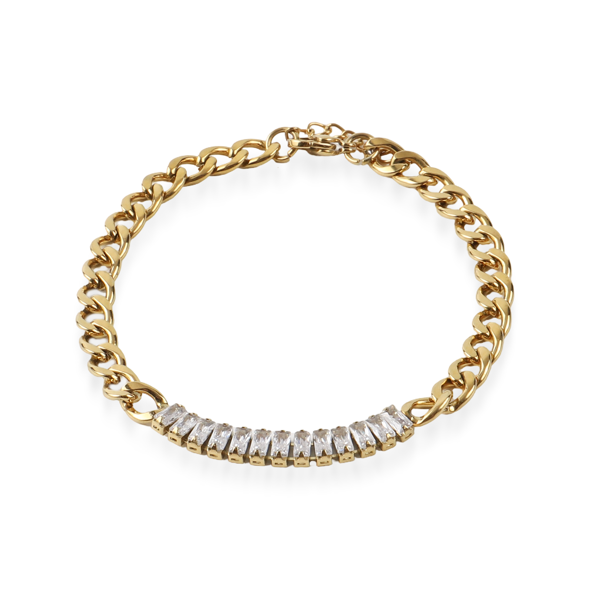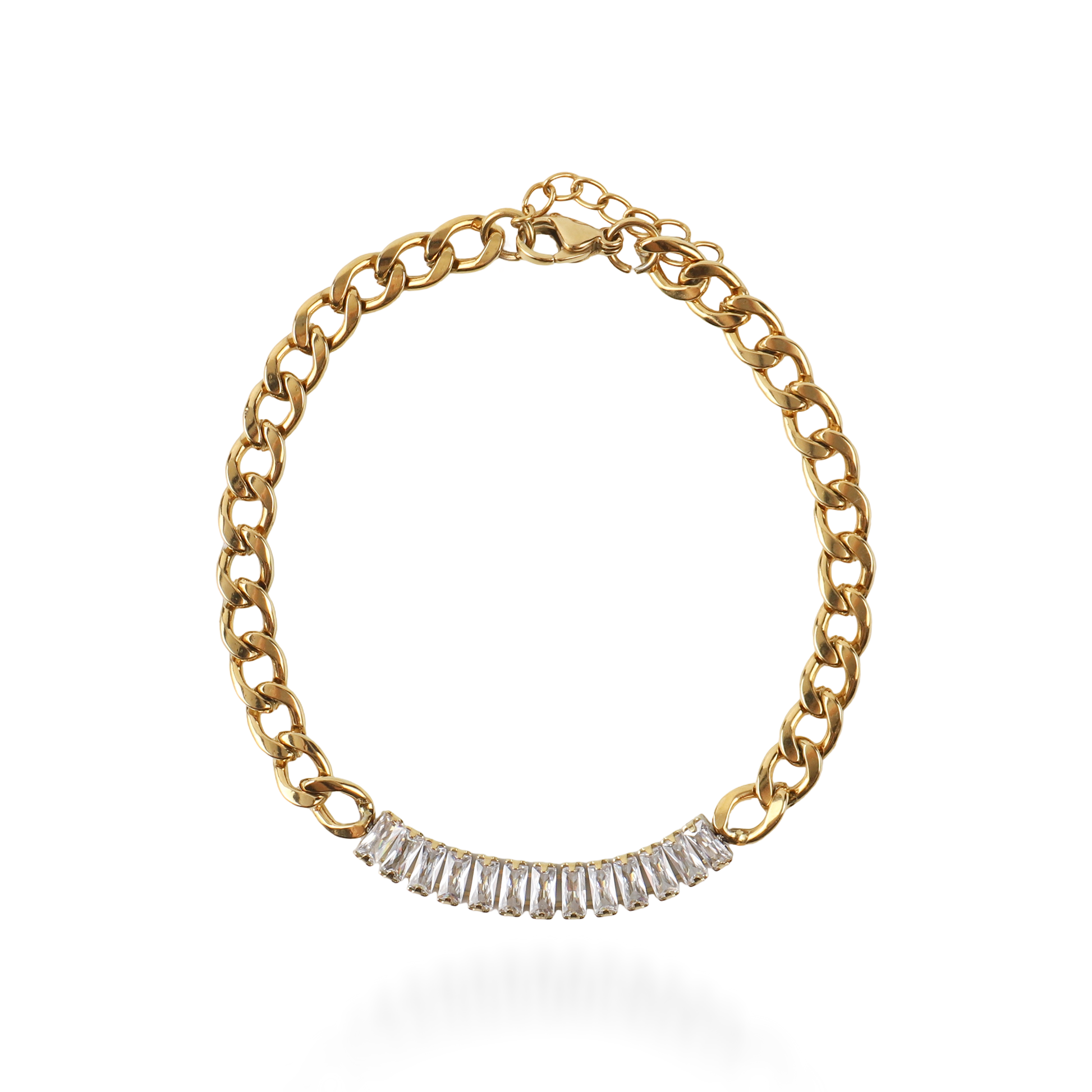 Η Riviera χεριού σε ασημί και διπλά επιχρυσωμένο 18Κ χρώμα, είναι μια λαμπερή και κομψή επιλογή. Η αλυσίδα διακοσμείται με λαμπερές πέτρες Baguette Zircon διαθέσιμο σε mix και λευκό χρώμα. Το σχέδιο με τις Baguette Zircon προσδίδει κομψότητα και φινέτσα στην αλυσίδα. Αυτό το κόσμημα φωτίζει τον καρπό σας, καθιστώντας το ιδανικό για ειδικές περιστάσεις και κομψές εμφανίσεις.