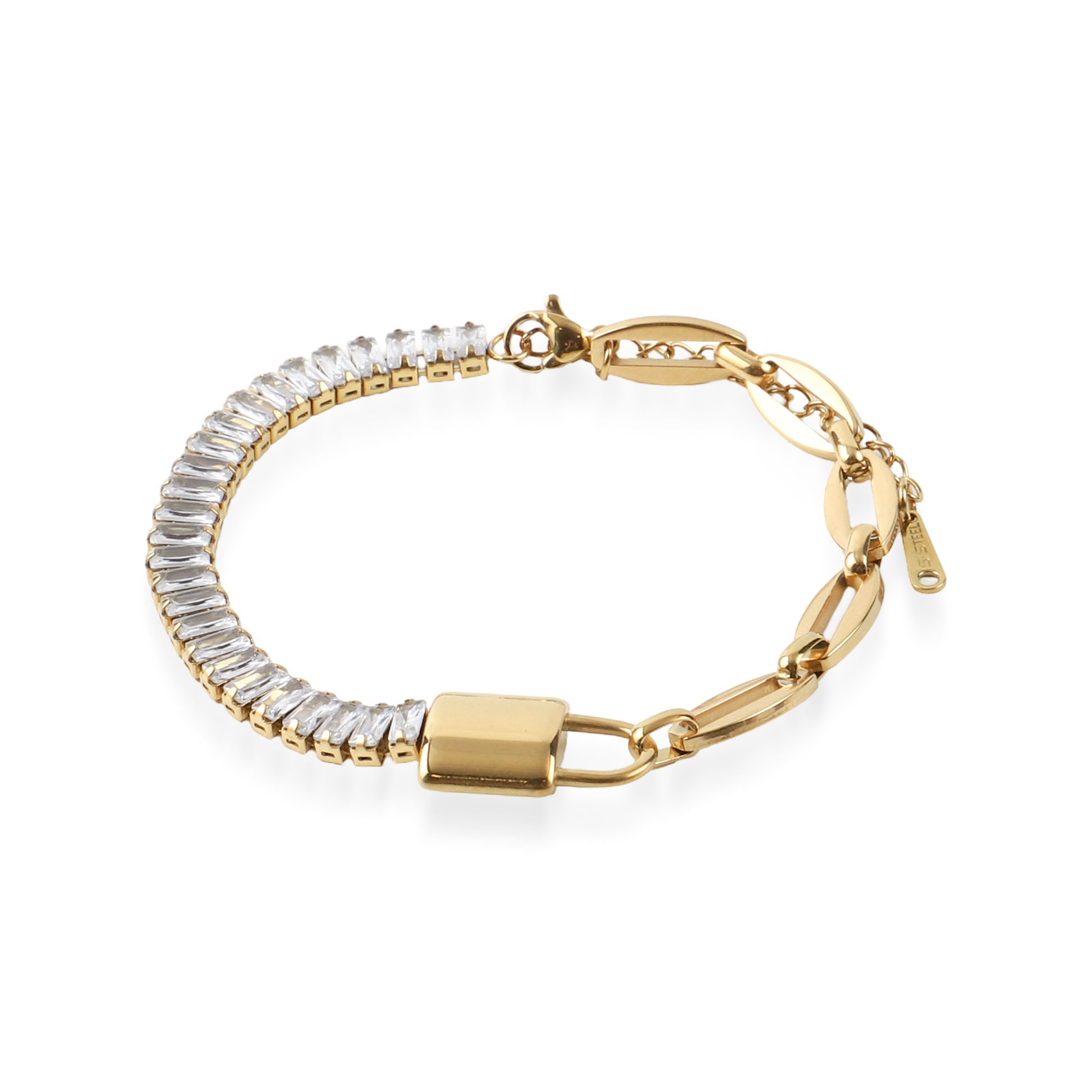Φωτίστε το χέρι σας με αυτήν την αλυσίδα από ορείχαλκο, με μενταγιόν κλειδαριά σε διπλά επιχρυσωμένο 18Κ χρώμα. Κάθε κρίκος είναι υπέροχα διακοσμημένος με λαμπερές πέτρες Zircon σε λευκό χρώμα, προσδίδοντας ένα μοναδικό και λαμπερό ύφος. Η εκλεπτυσμένη σχεδίαση και η λαμπερή λάμψη των πετρών προσφέρουν ένα κομψό αξεσουάρ που θα ξεχωρίσει σε κάθε σας εμφάνιση.