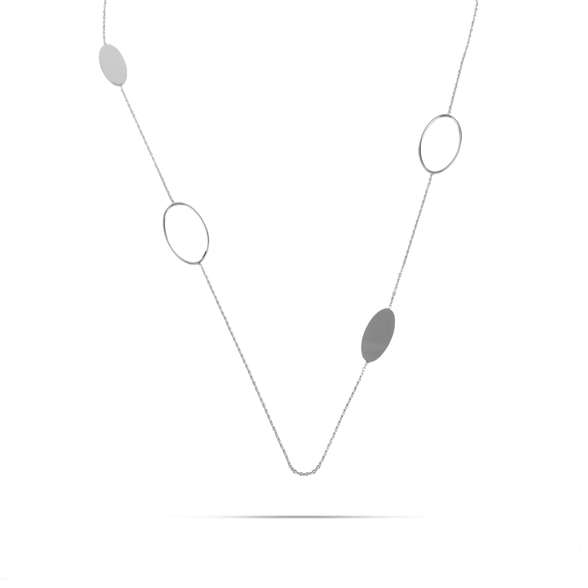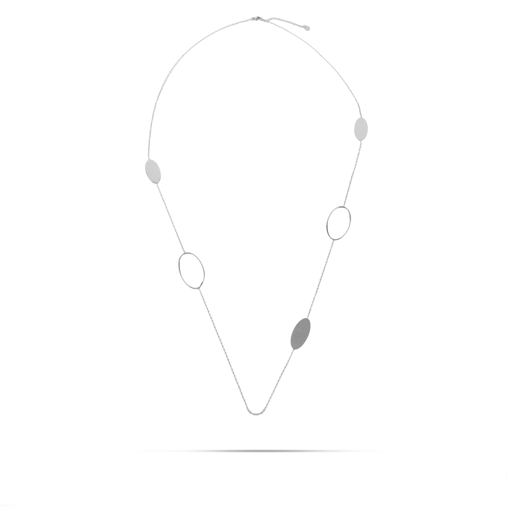 Αλυσίδα λαιμού από ανοξείδωτο ατσάλι σε ασημί χρώμα με κρικάκια σε σχήμα οβάλ ένα διακριτικό και κομψό κόσμημα. Τα οβάλ κρικάκια προσδίδουν μια ενδιαφέρουσα γεωμετρική πινελιά στην αλυσίδα, προσθέτοντας έναν μοντέρνο χαρακτήρα στο κόσμημα. Η ανοξείδωτη κατασκευή εξασφαλίζει αντοχή και ανθεκτικότητα, ενώ ο σχεδιασμός με οβάλ κρικάκια προσφέρει μια διακριτική και κομψή εμφάνιση. Αυτή η αλυσίδα είναι ιδανική για καθημερινή χρήση και μπορεί να φορεθεί εύκολα με διάφορα στυλ και εμφανίσεις.