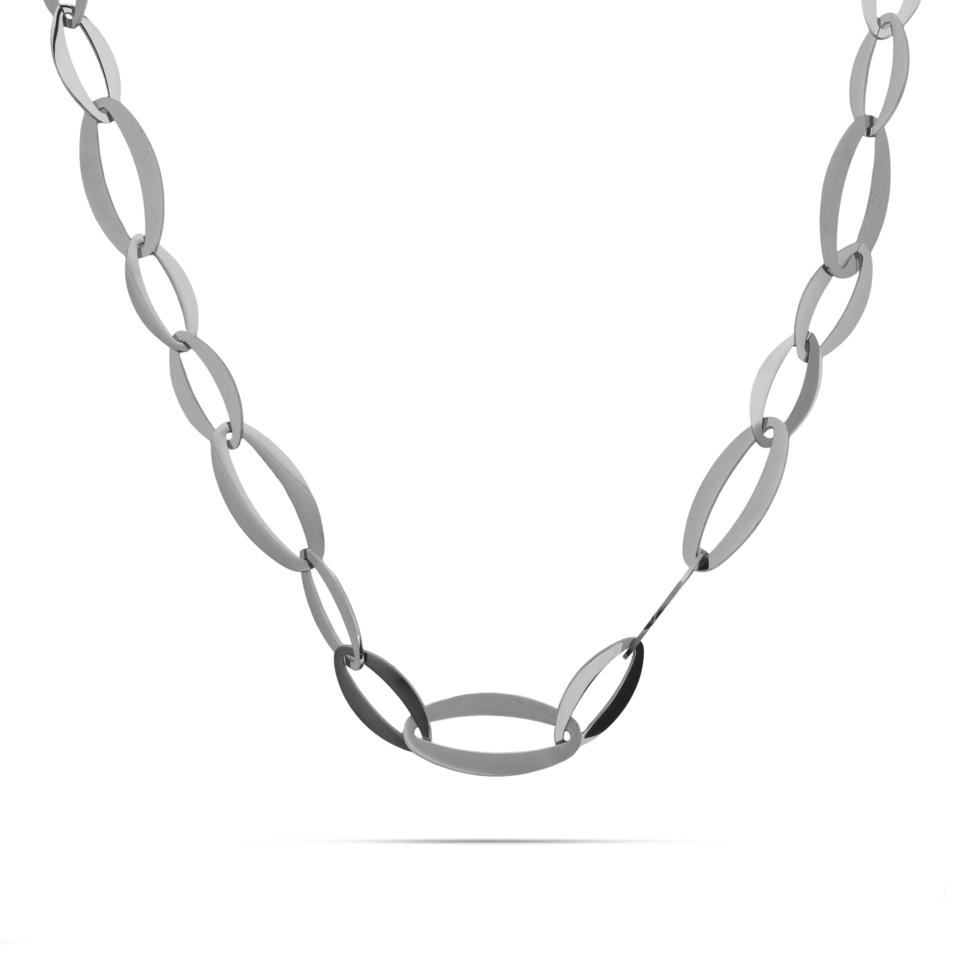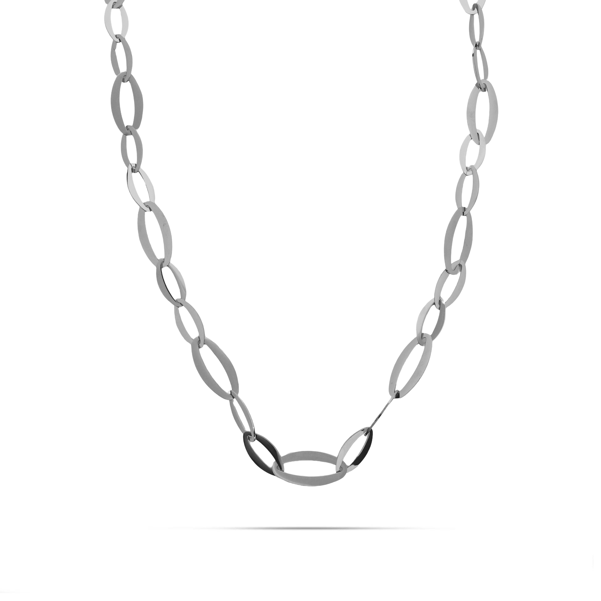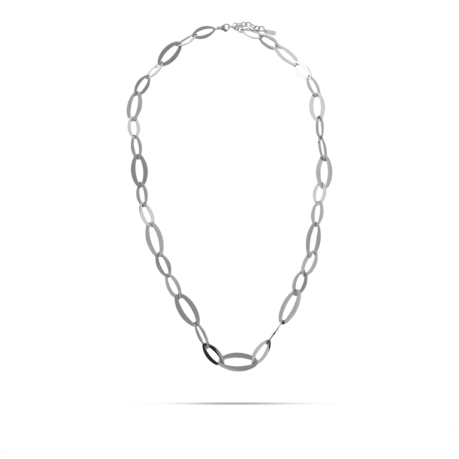 Αλυσίδα λαιμού από ανοξείδωτο ατσάλι σε ασημί χρώμα με εντυπωσιακό σχέδιο οβάλ κρίκων που δημιουργεί ένα κόσμημα που προκαλεί εντύπωση. Οι οβάλ κρίκοι δίνουν μια ιδιαίτερη διάσταση στην αλυσίδα, προσθέτοντας κομψότητα και σύγχρονο χαρακτήρα. Η ανοξείδωτη κατασκευή εξασφαλίζει αντοχή και διάρκεια ζωής, καθιστώντας την αλυσίδα κατάλληλη για καθημερινή χρήση. Αυτή η αλυσίδα μπορεί να φορεθεί μόνη της για ένα εντυπωσιακό στυλ ή να συνδυαστεί με άλλα κοσμήματα για να δημιουργήσετε ένα πιο πολύπλοκο σύνολο.