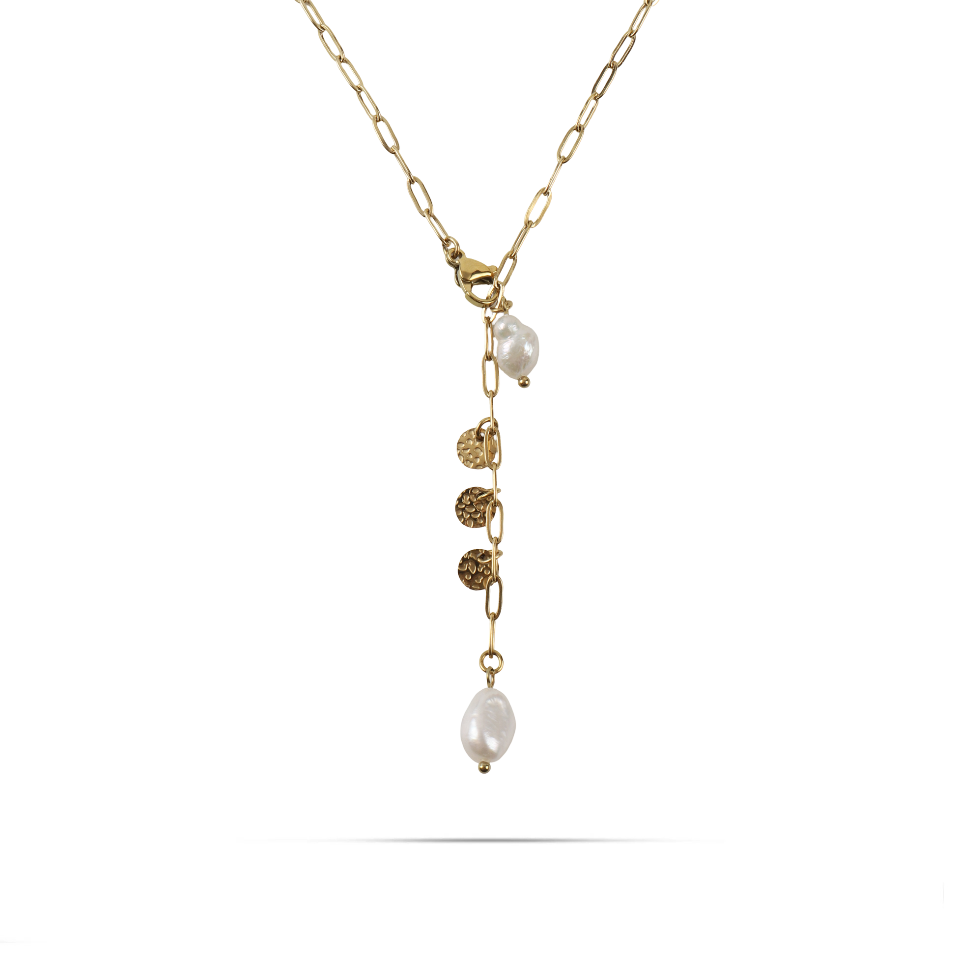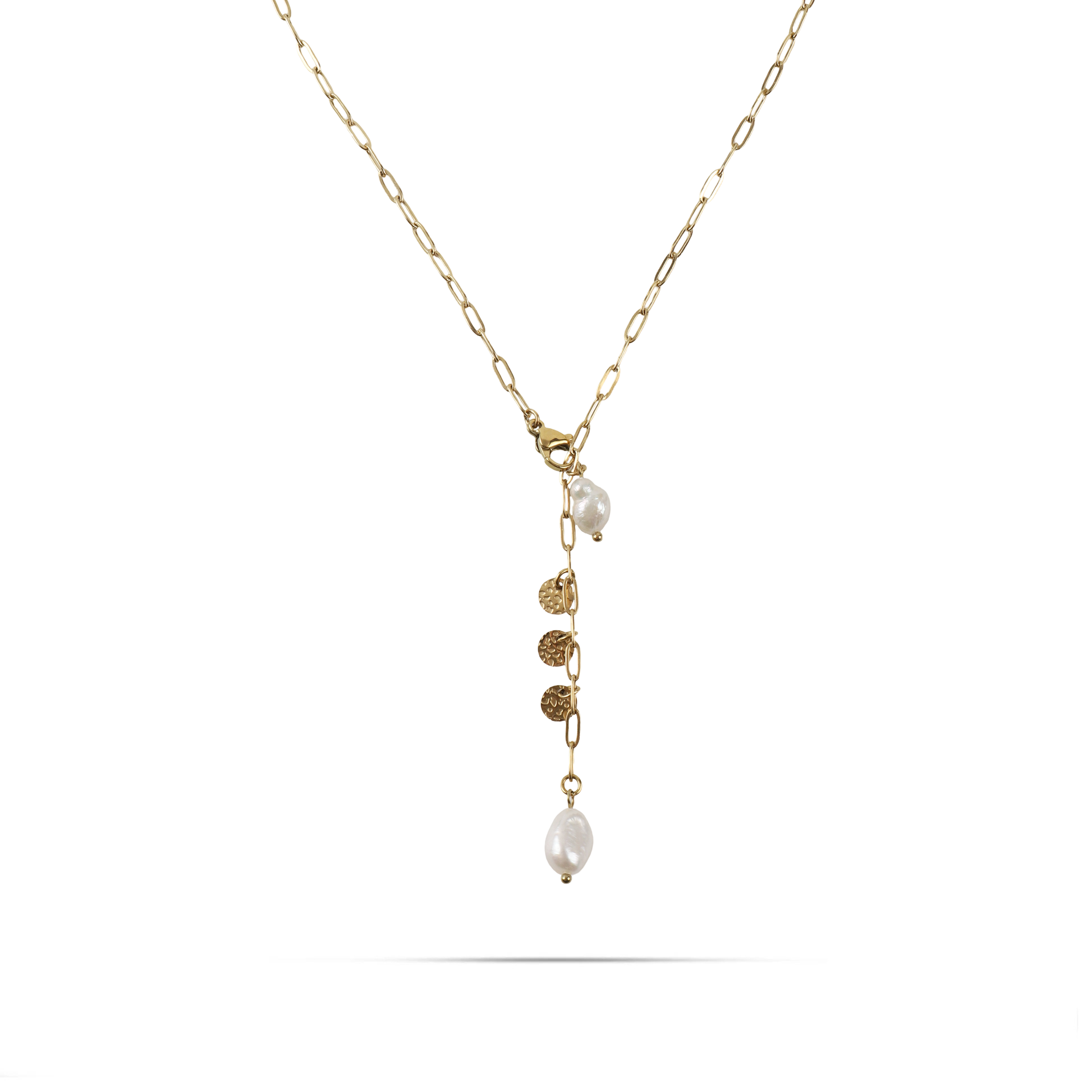 Κολιέ από ανοξείδωτο ατσάλι σε χρυσό χρώμα, διακοσμημένη με δύο λαμπερές λευκές πέρλες, που αντιπροσωπεύει την κομψότητα και την κλασική ομορφιά. Οι λευκές πέρλες προσθέτουν μια διακριτική λάμψη και εκφράζουν κομψότητα. Η ανοξείδωτη κατασκευή της αλυσίδας εξασφαλίζει ανθεκτικότητα και διάρκεια. Αυτό το κόσμημα είναι ιδανικό για καθημερινή χρήση ή για ειδικές περιστάσεις, προσδίδοντας έναν αέρα κομψότητας και φινέτσας σε κάθε εμφάνιση.