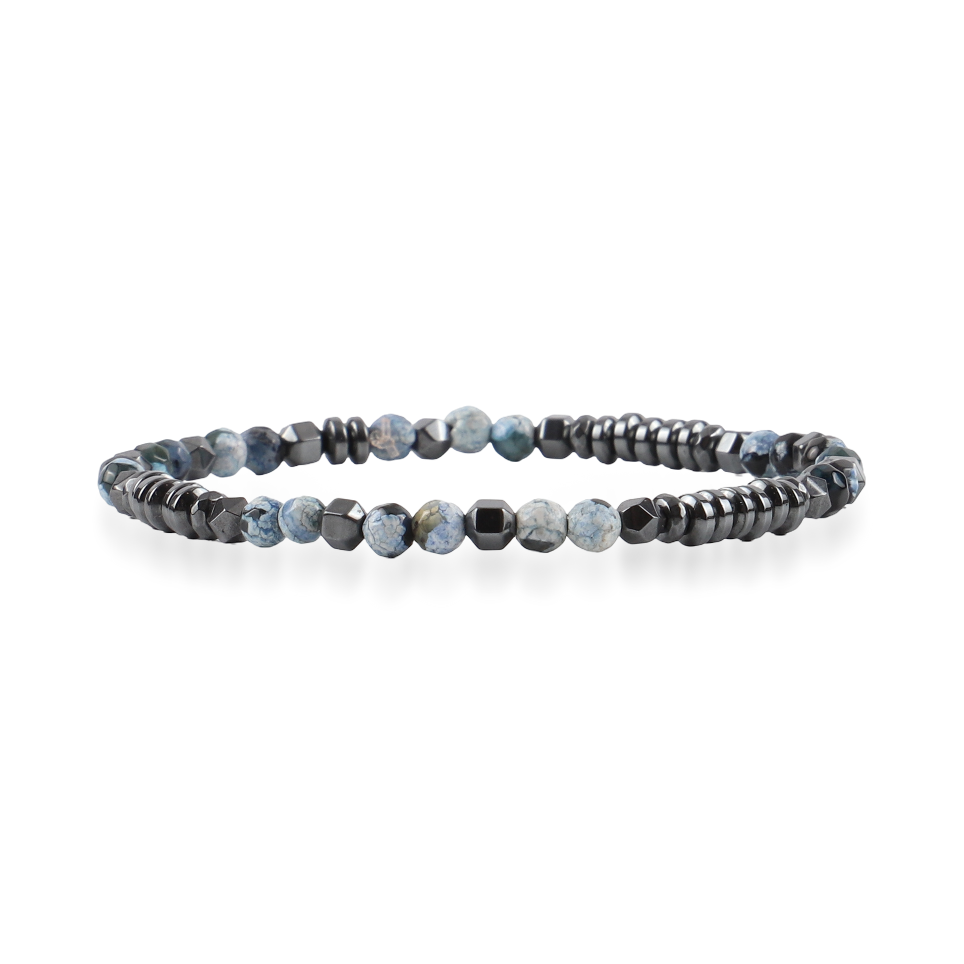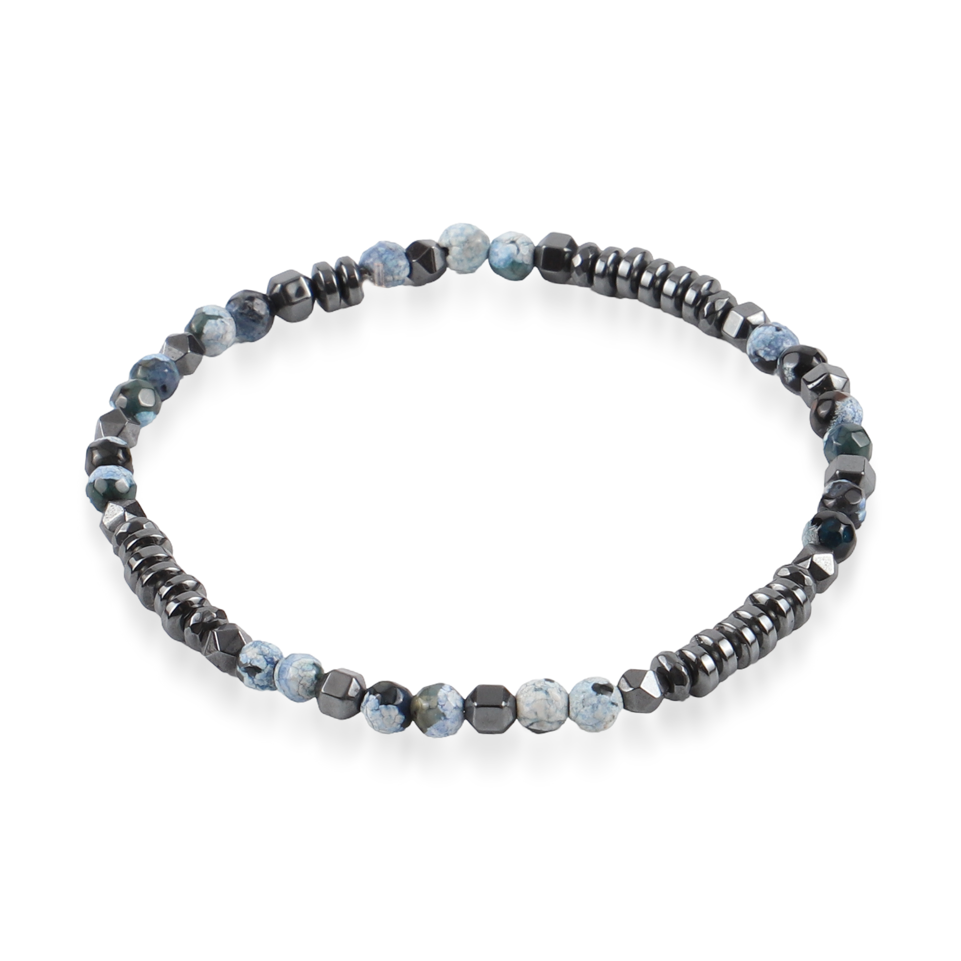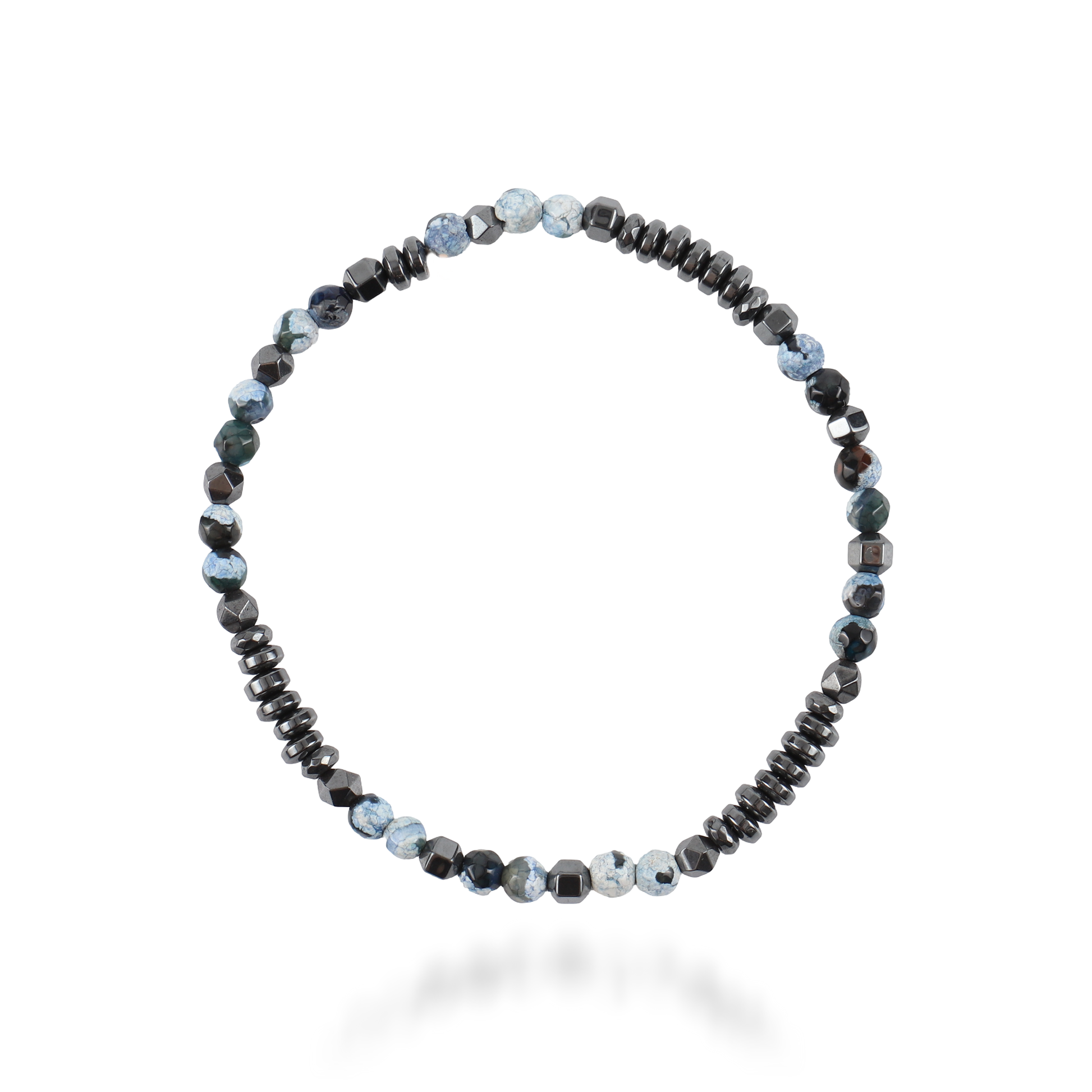 Ανδρικό χειροποίητο βραχιόλι με φυσικές ορυκτές πέτρες διακοσμημένο από ταγιέ μπλε αχάτη (0.4cm), ροδέλα αιματίτη (0.4cm) και ανθρακί ρόμβο αιματίτη (0.4 cm).