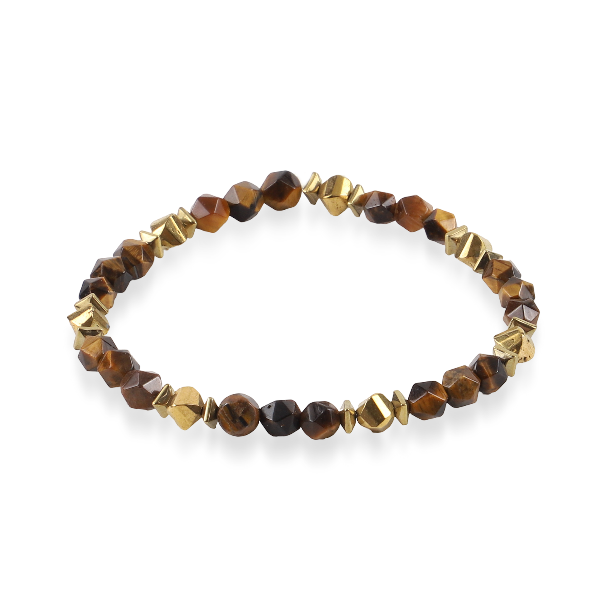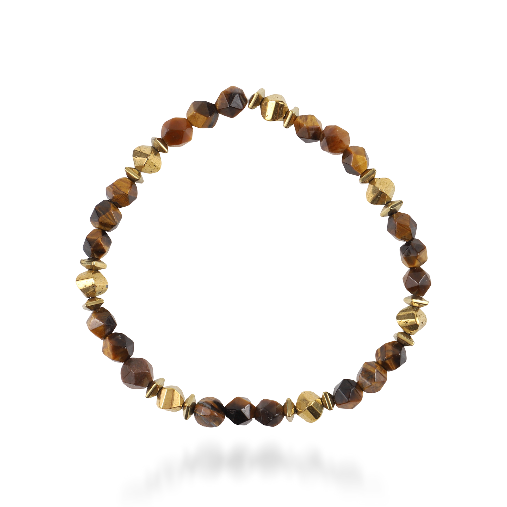 Ανδρικό χειροποίητο βραχιόλι με φυσικές ορυκτές πέτρες από μάτι τίγρης (0.6cm), χρυσούς πολυγωνικούς κύβους αιματίτη (0.5cm) και χρυσούς ρόμβους αιματίτη (0.4cm).