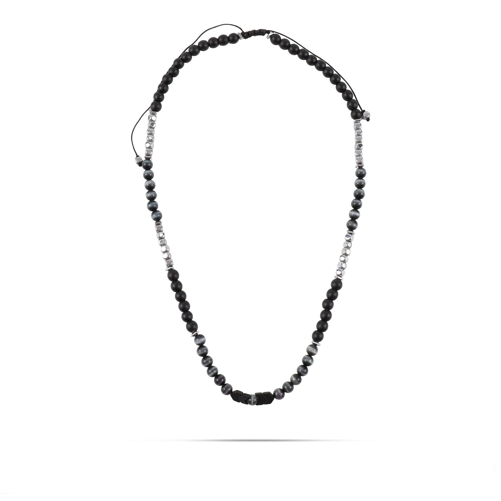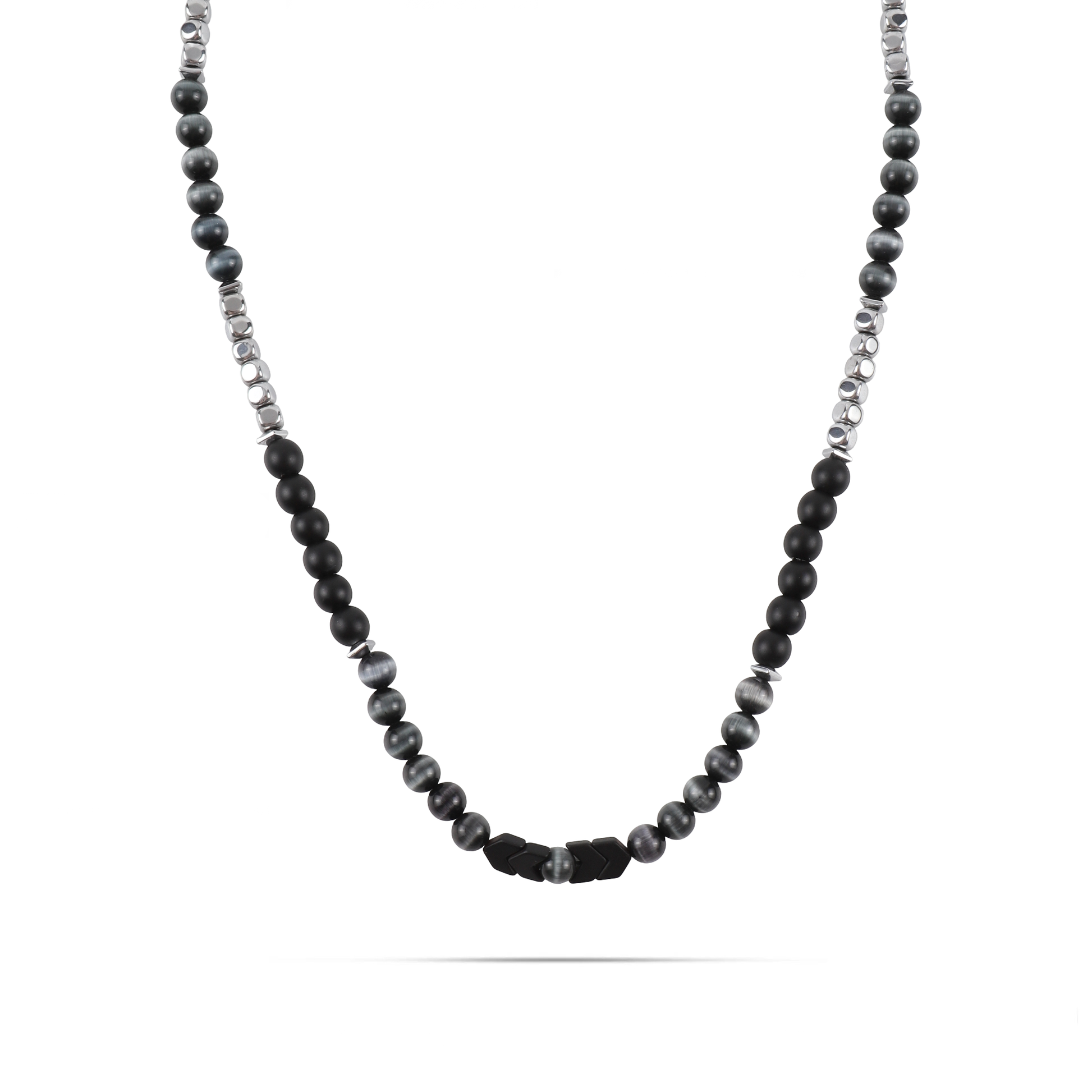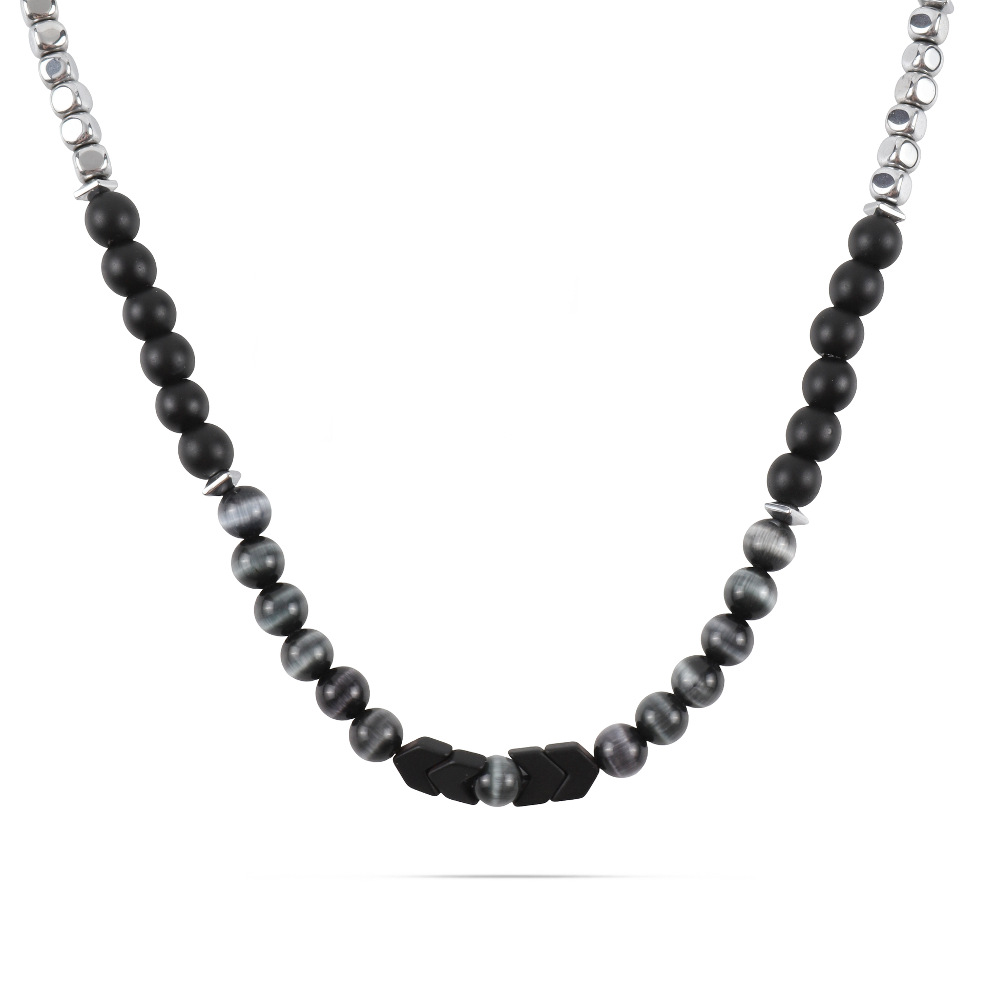 Ανδρικό χειροποίητο κολιέ με φυσικές ορυκτές πέτρες από γκρι μάτι γάτας (0,6cm), μαύρη ματ πέτρα όνυχα (0.6cm), μαύρα βέλη αιματίτη (0,6cm), ασημί ρόμβο αιματίτη (0,4cm) και ασημί κύβο αιματίτη (0.4cm).