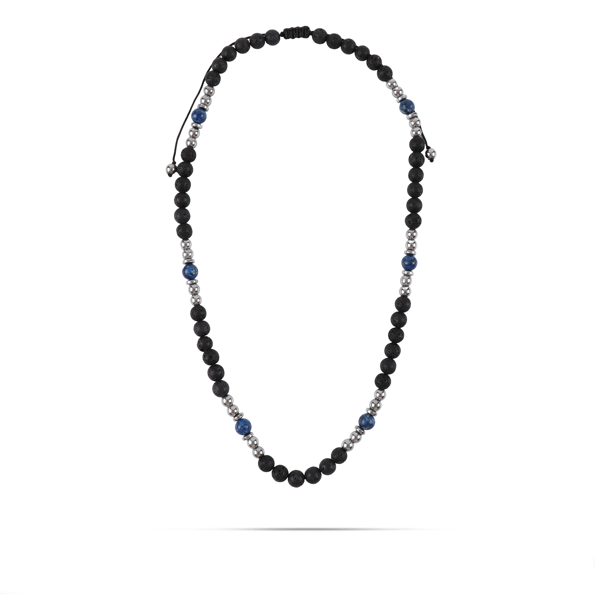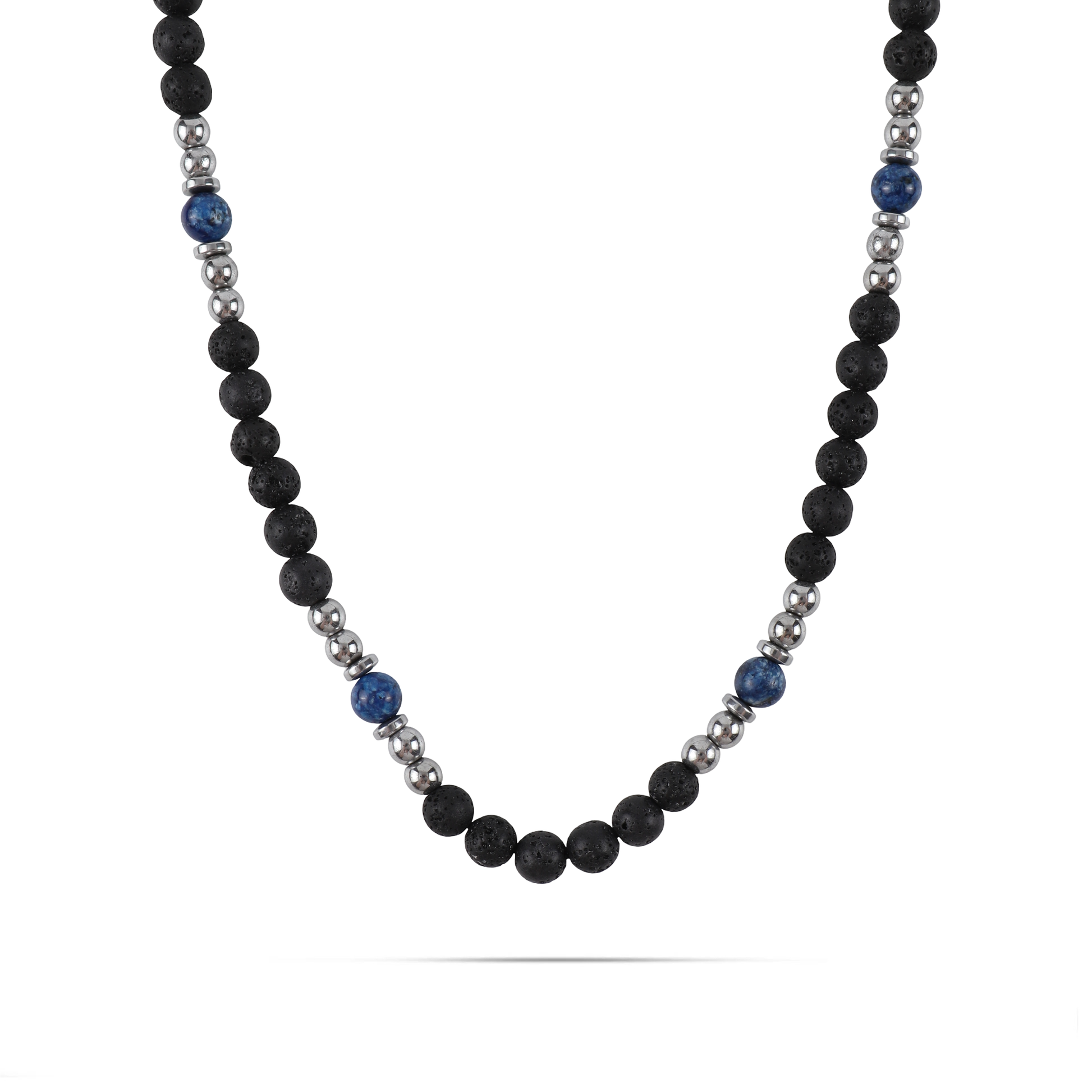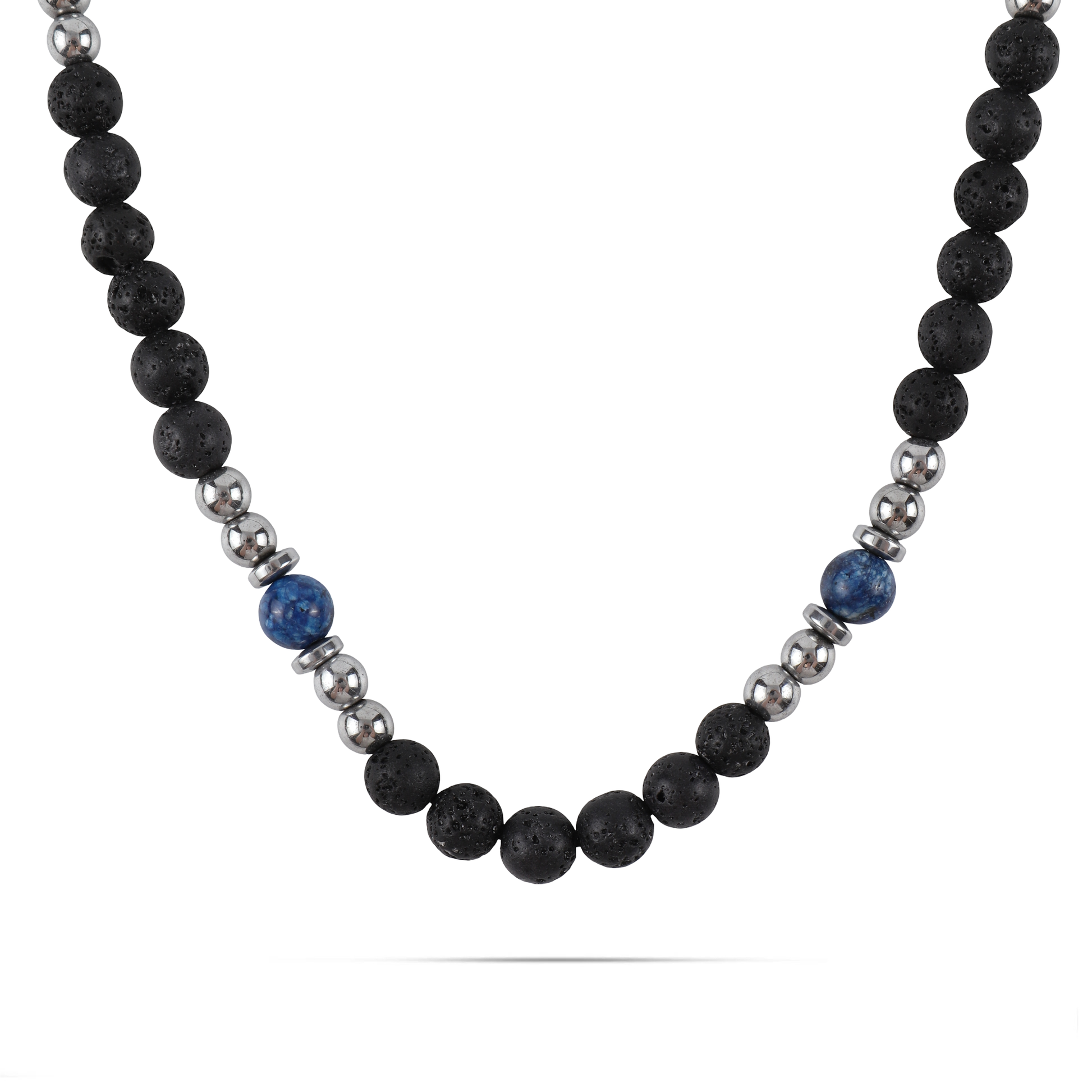 Ανδρικό χειροποίητο κολιέ με φυσικές ορυκτές πέτρες από μαύρη πέτρα λάβας (0,8cm), γυαλιστερό μπλε αχάτη (0,8cm), ασημί μπίλια αιματίτη (0,6cm) και ασημί ροδέλα αιματίτη (0,6cm).