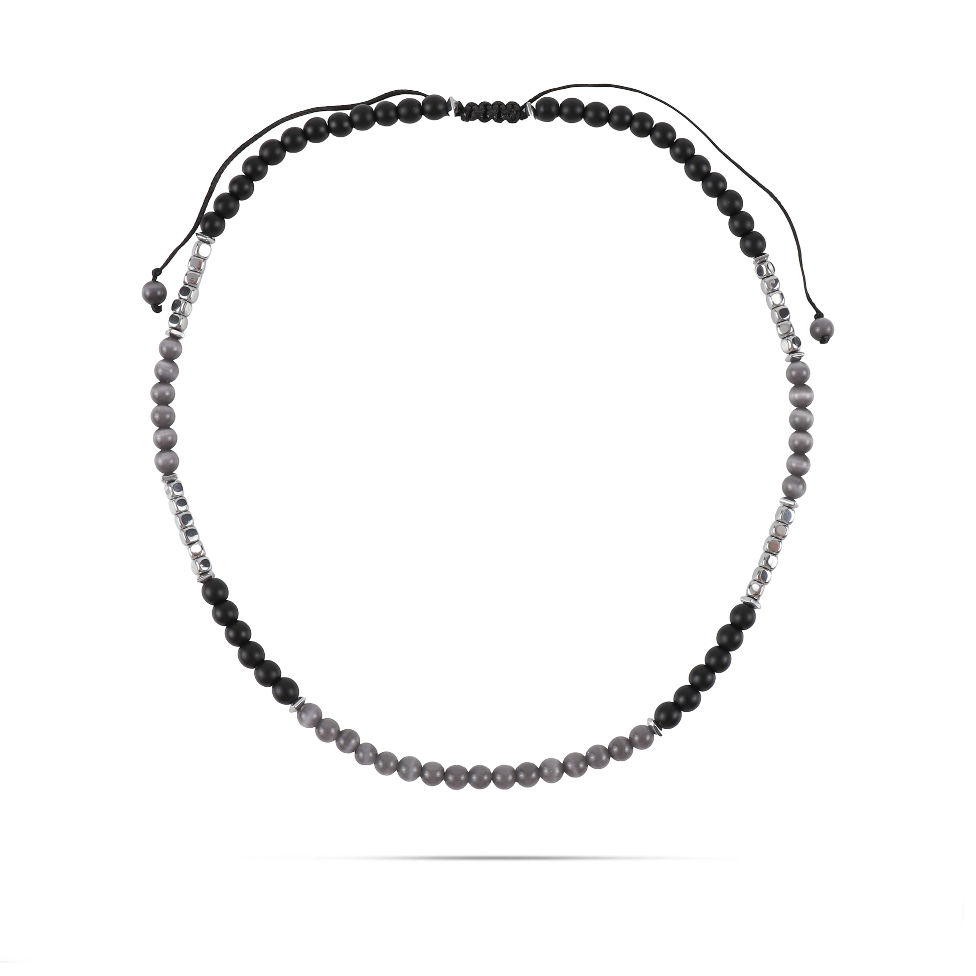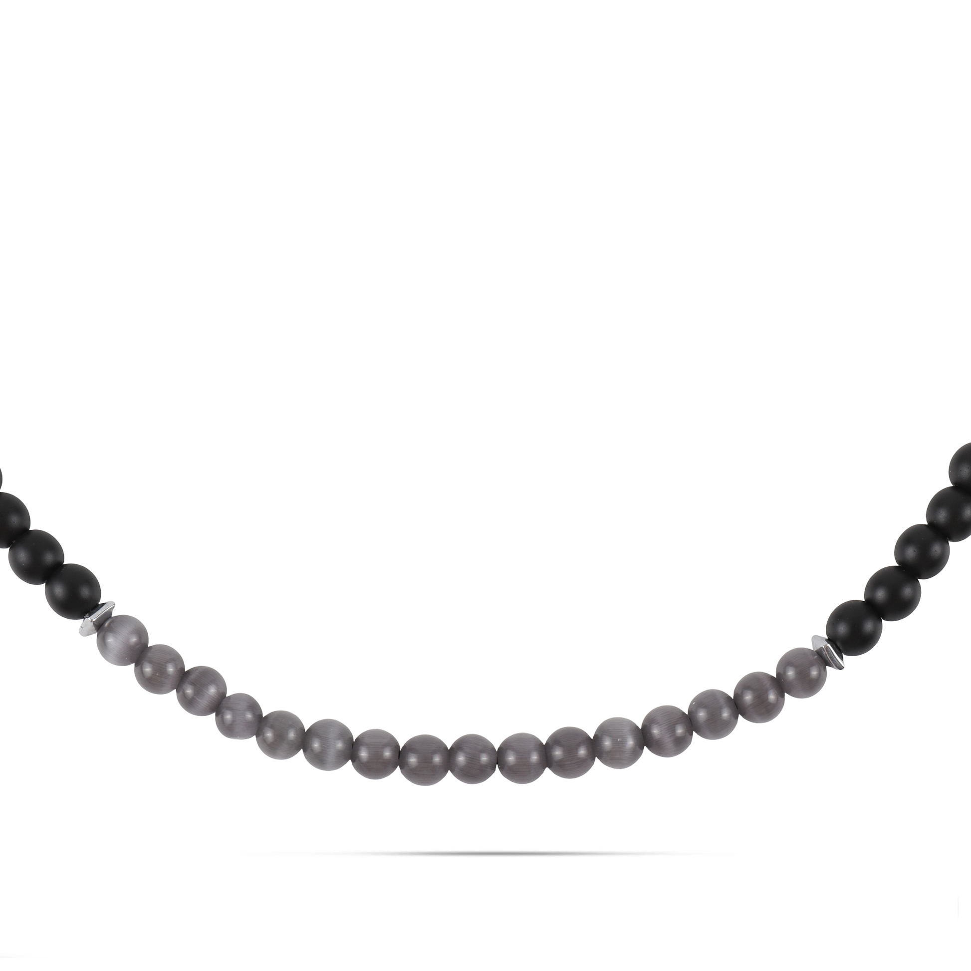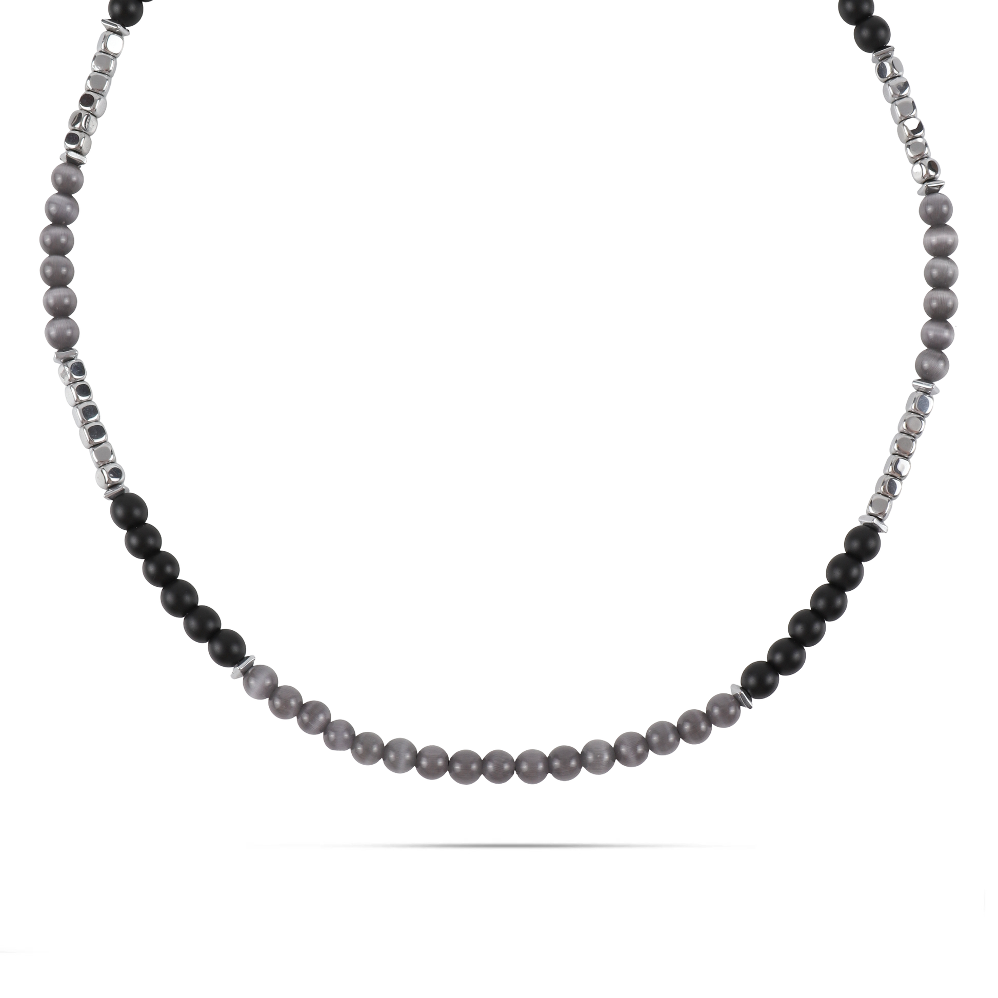 Ανδρικό χειροποίητο κολιέ με φυσικές ορυκτές πέτρες από γκρι μάτι γάτας (0,6cm), ματ πέτρα όνυχα (0.6cm), ασημί ρόμβο αιματίτη (0,4cm) και ασημί κύβο αιματίτη (0.4cm).