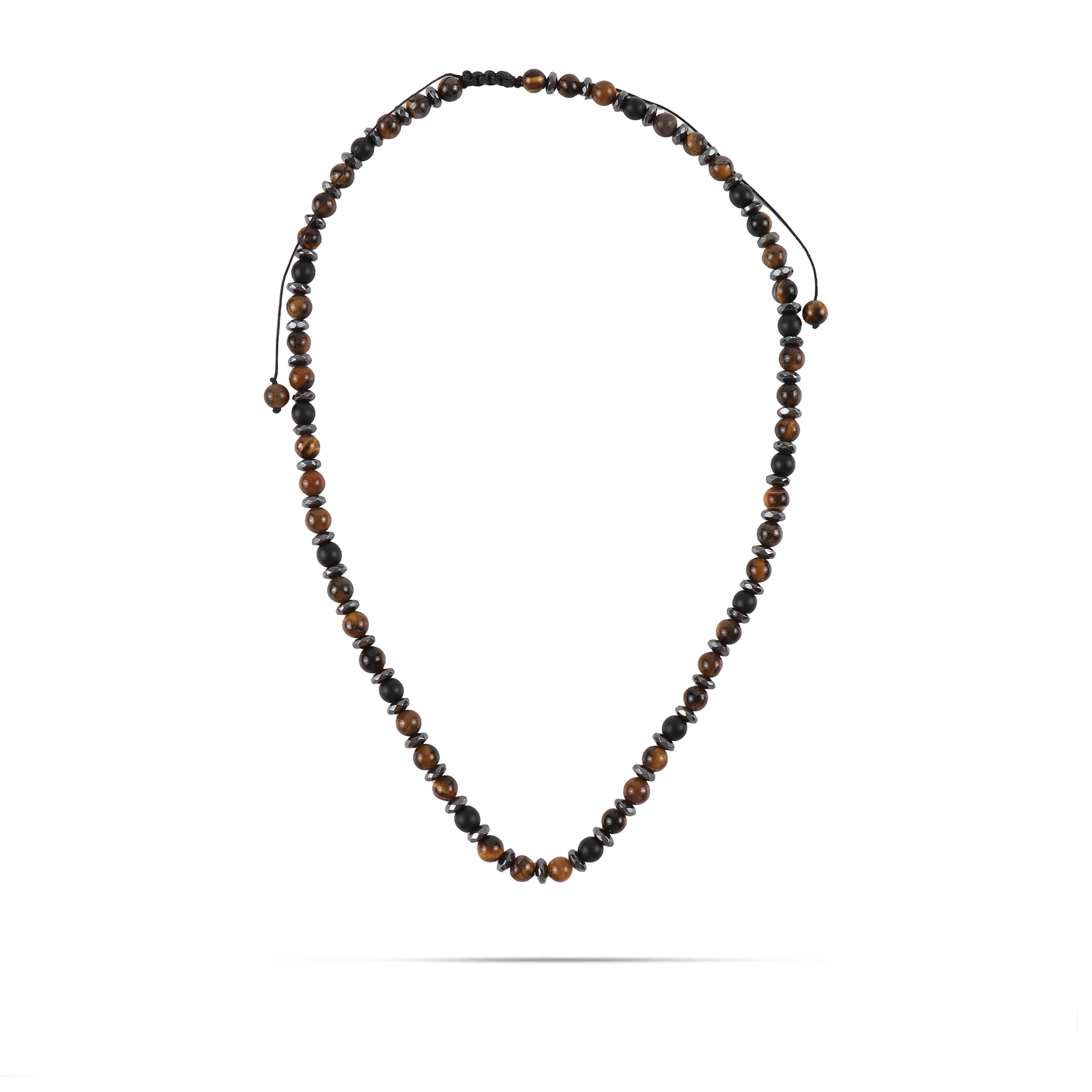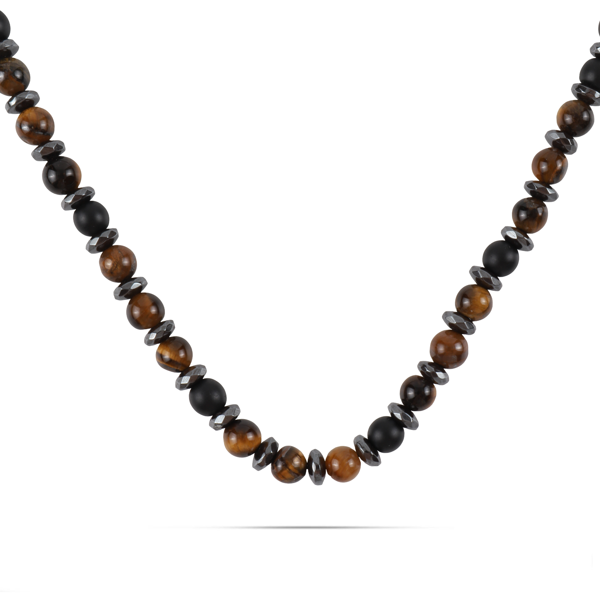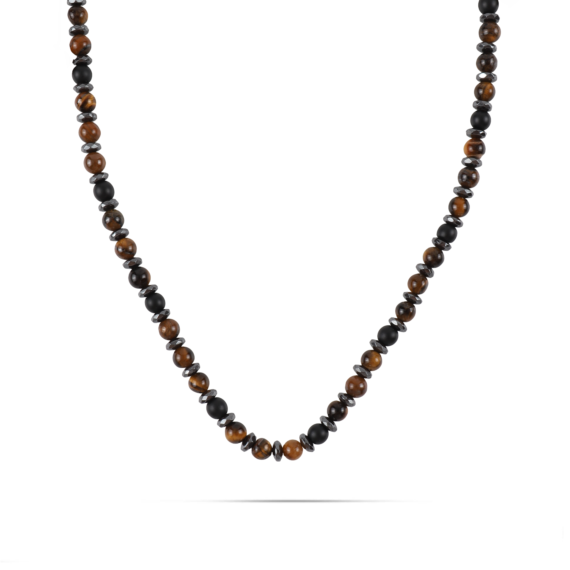Ανδρικό χειροποίητο κολιέ με φυσικές ορυκτές πέτρες από καφέ μάτι τίγρη (0,6cm), ματ πέτρα όνυχα (0,6cm) και ασημί πολυγωνική ροδέλα αιματίτη (0.6cm).