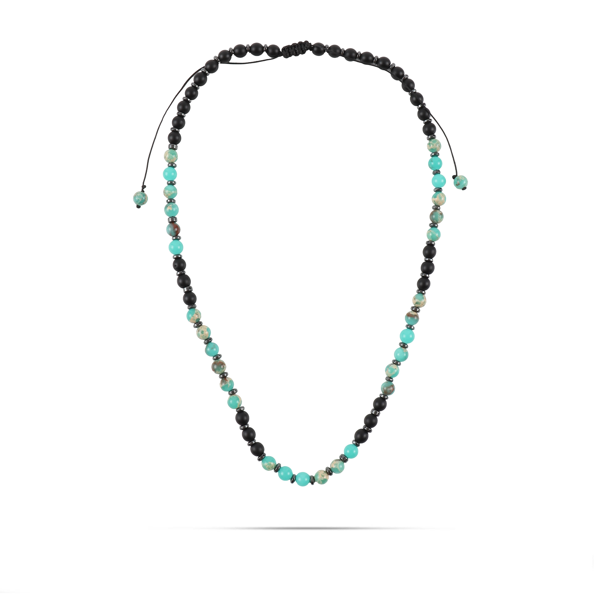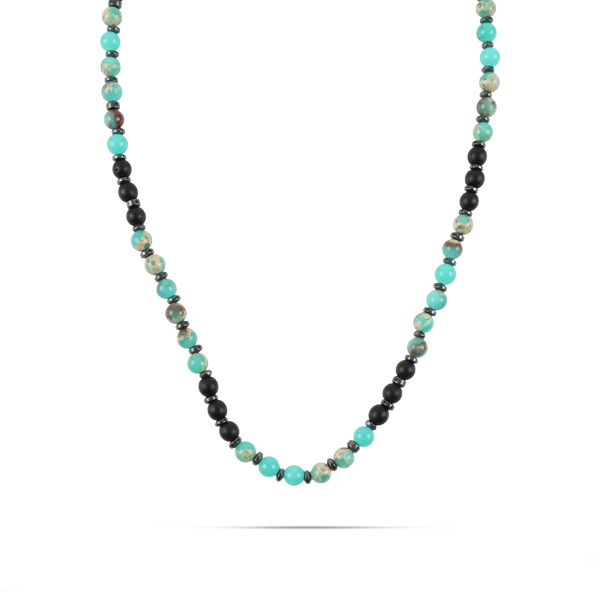 Ανδρικό χειροποίητο κολιέ με φυσικές ορυκτές πέτρες από τιρκουάζ ταγιέ αχάτη (0.6cm), μαύρο ματ όνυχα (0.6cm) και ασημί ροδέλα αιματίτη (0.4cm).