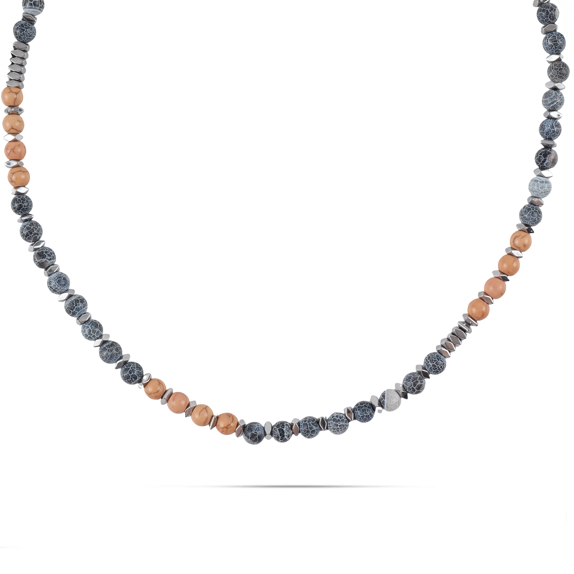 Ανδρικό χειροποίητο κολιέ με φυσικές ορυκτές πέτρες από μπλε και πορτοκαλί ταγιέ αχάτη (0.6cm) και ασημί πολυγωνικό και ρόμβο αιματίτη (0.4cm).