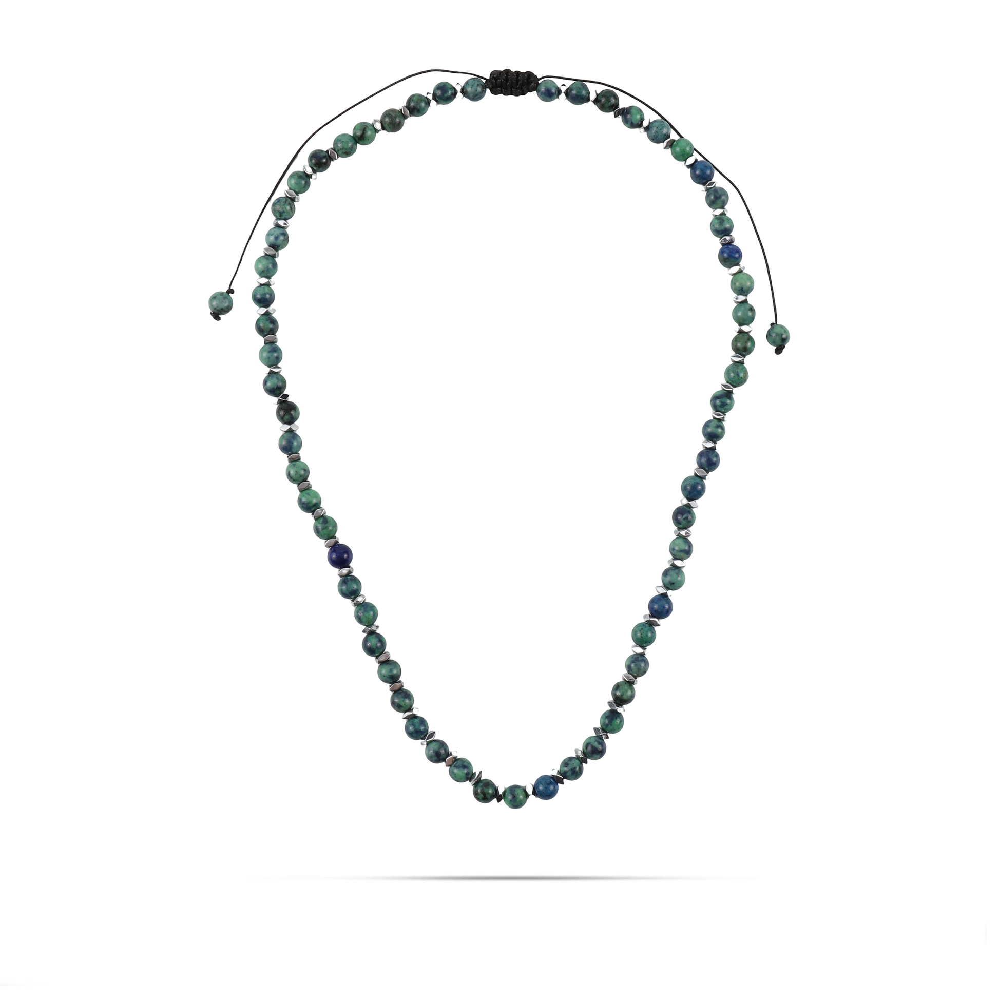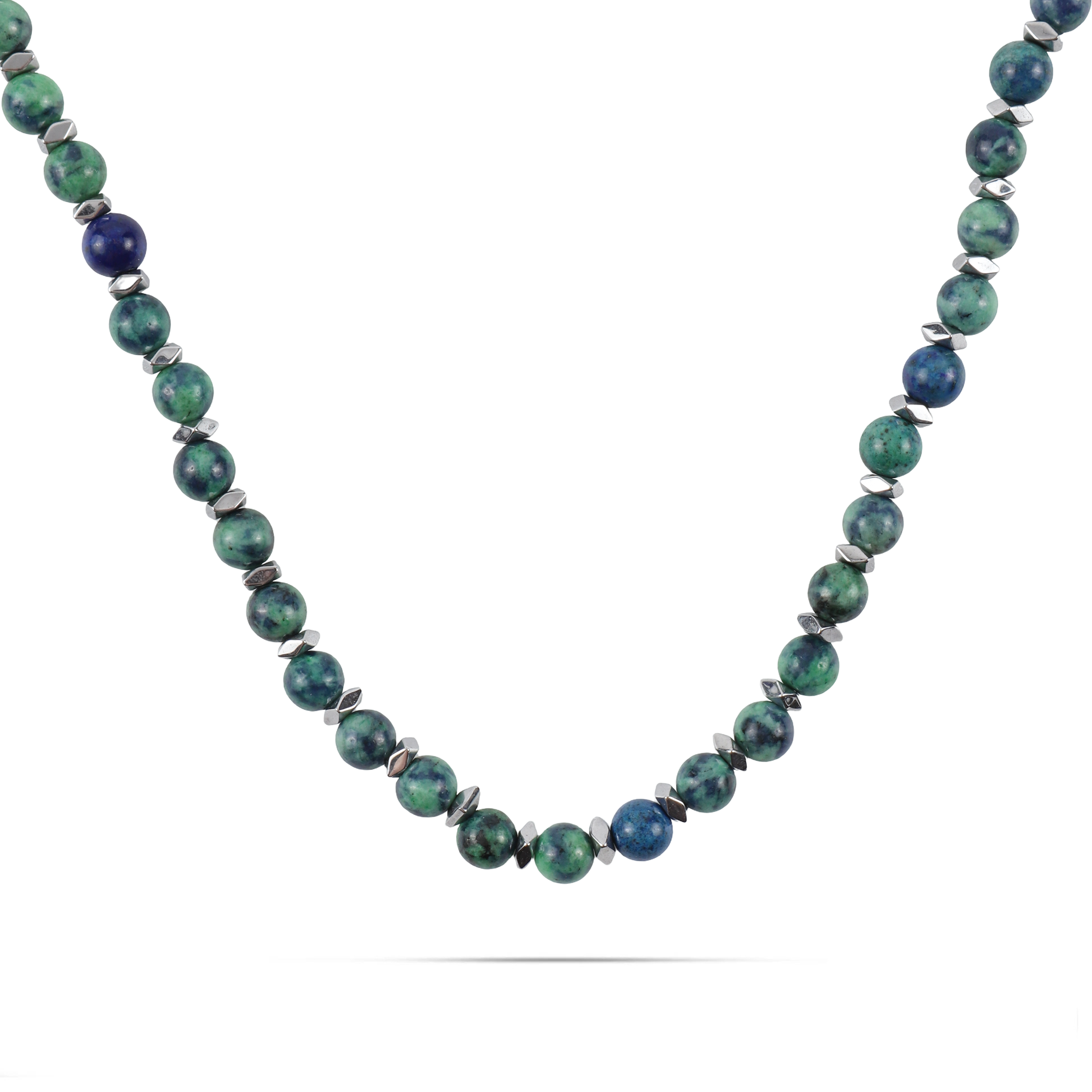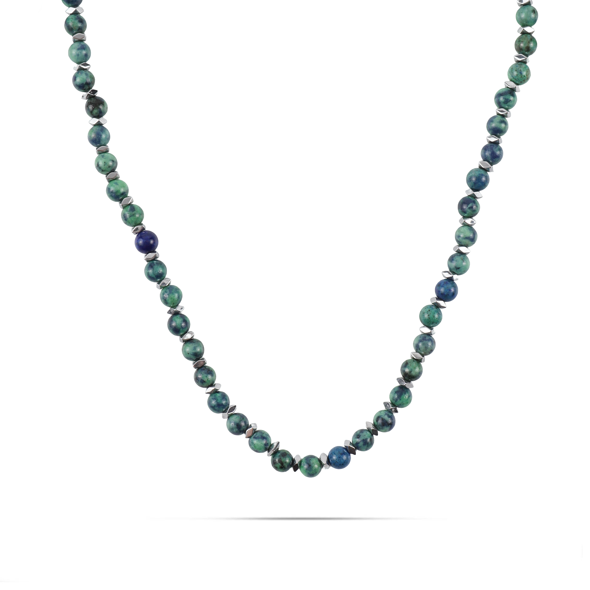 Ανδρικό χειροποίητο κολιέ με φυσικές ορυκτές πέτρες από μπλε πράσινο αχάτη (0.6cm) και ασημί πολυγωνικό αιματίτη (0.4cm).