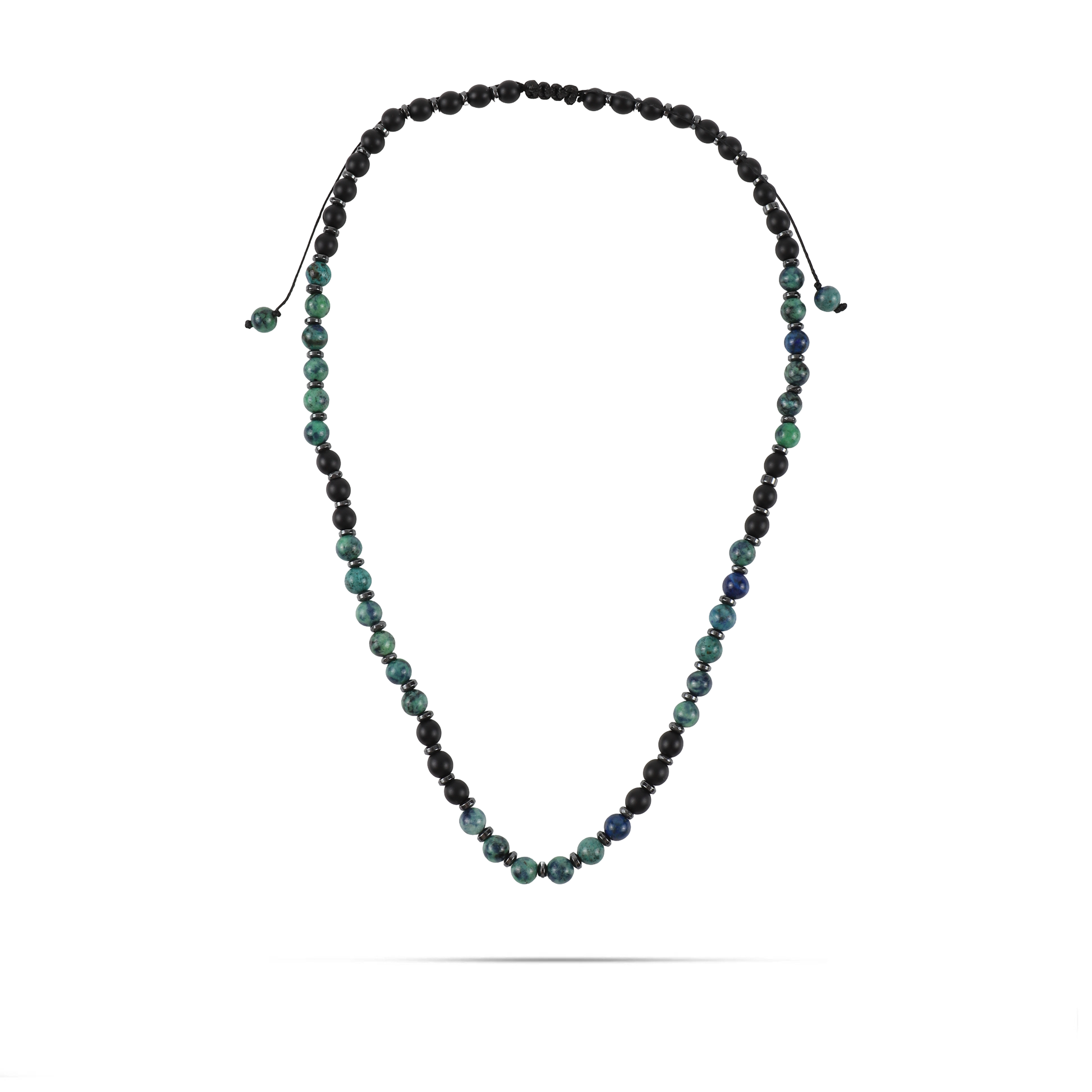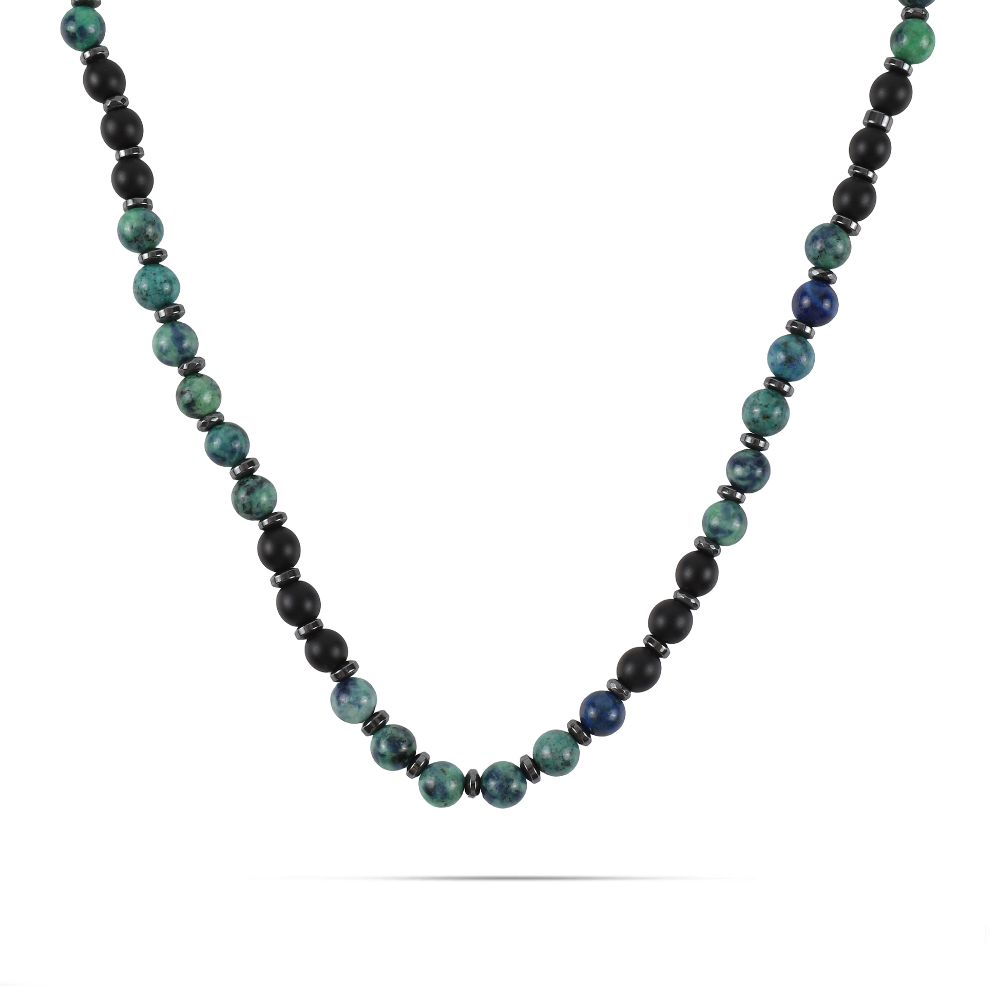 Ανδρικό χειροποίητο κολιέ με φυσικές ορυκτές πέτρες από μαύρο ματ όνυχα (0.6cm), μπλε πράσινο αχάτη (0.6cm) και ασημί ροδέλα αιματίτη (0.4cm).