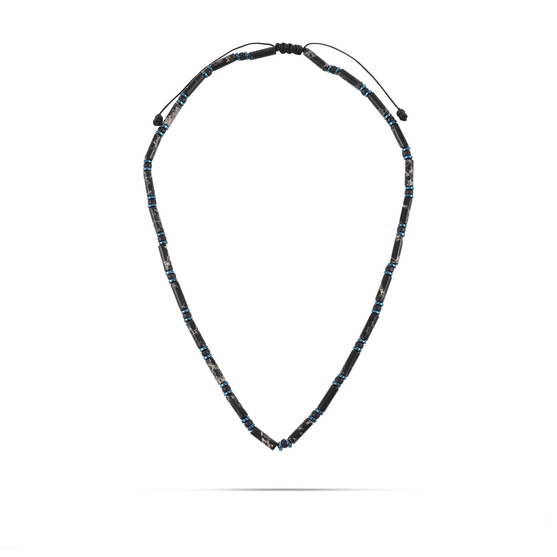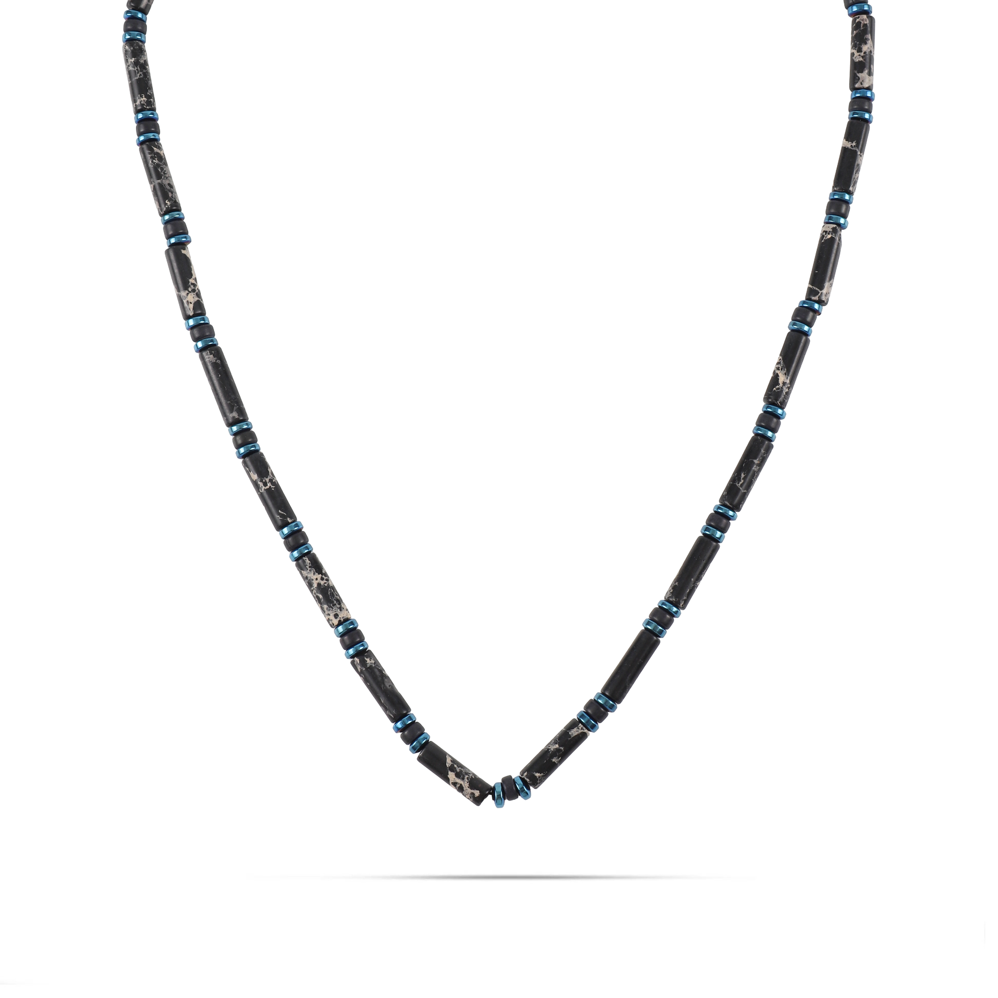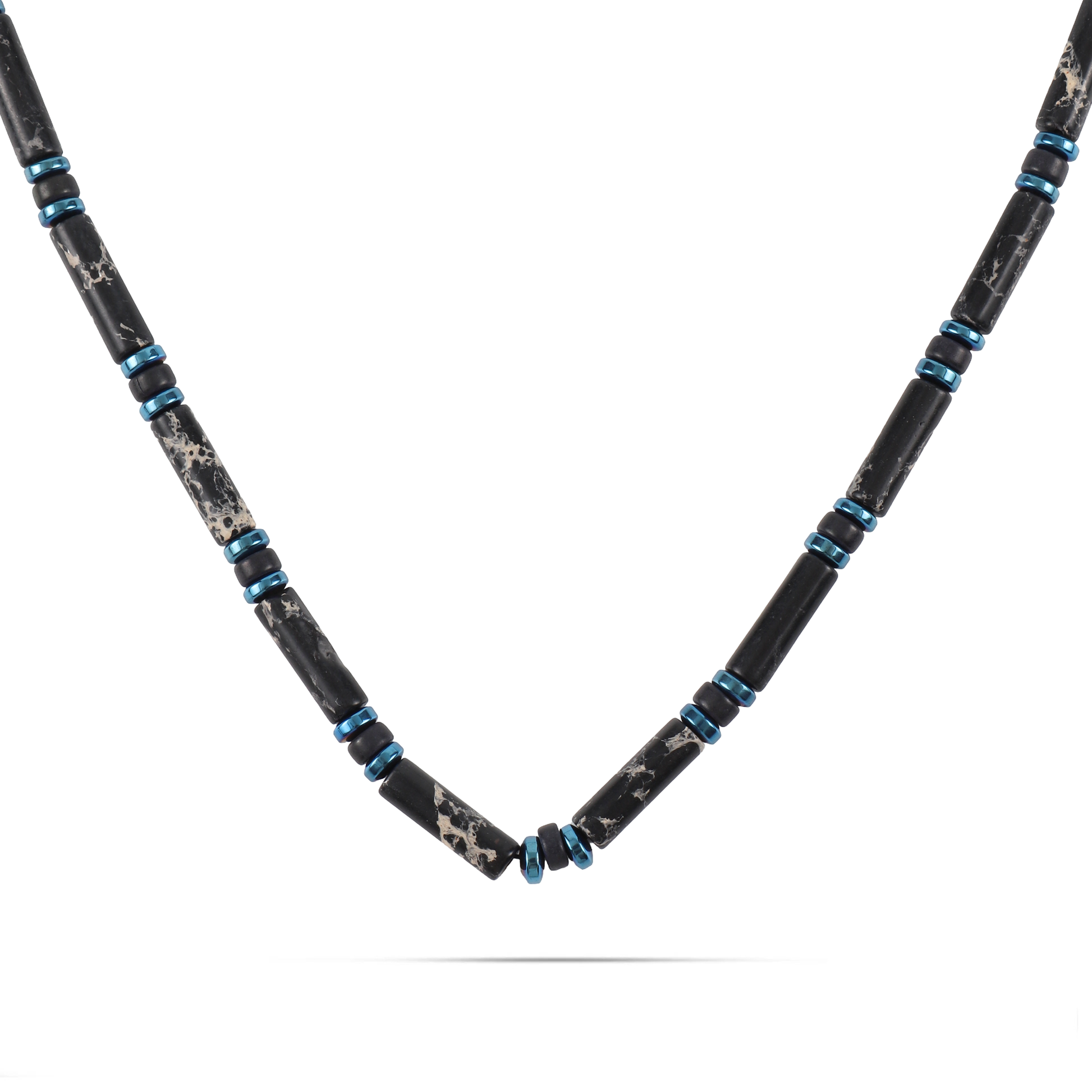 Ανδρικό χειροποίητο κολιέ με φυσικές ορυκτές πέτρες από χαολίτη (0,4cm), μαύρη ροδέλα χαολίτη (0,4cm) και γαλάζια πλακέ ροδέλα αιματίτη (0,4cm).