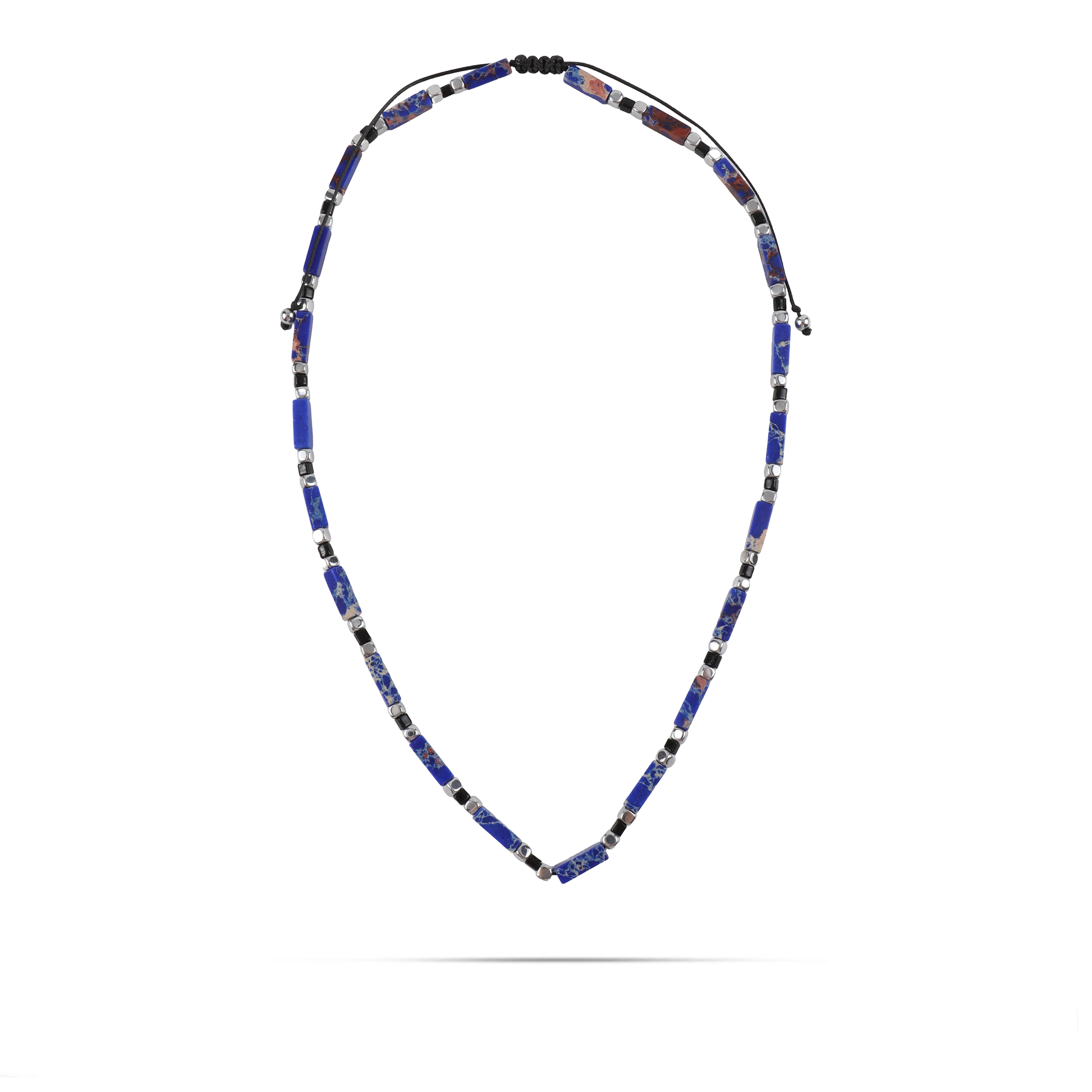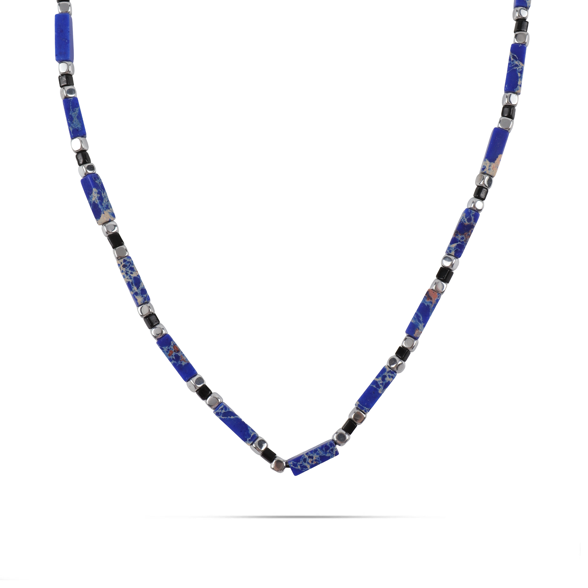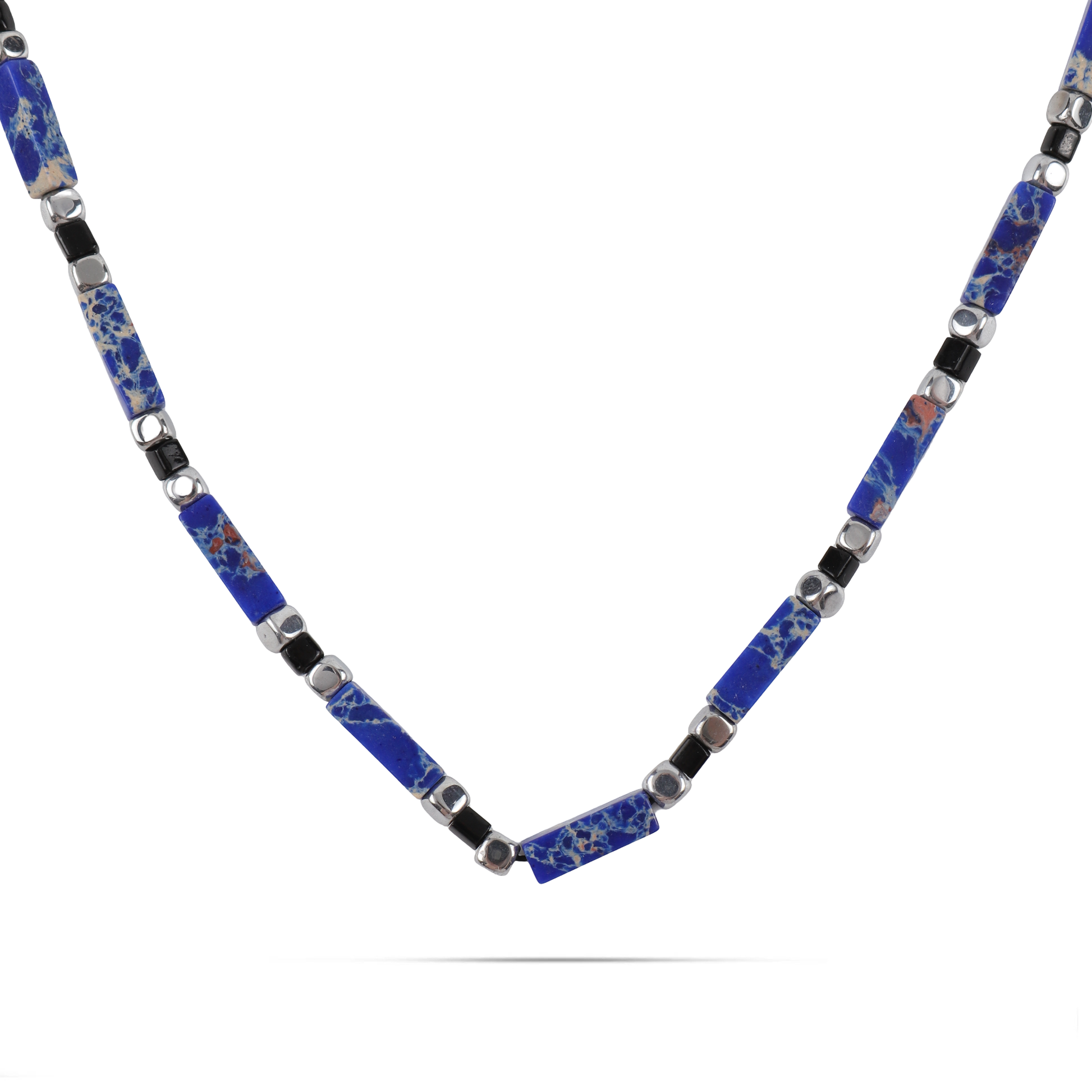 Ανδρικό χειροποίητο κολιέ με φυσικές ορυκτές πέτρες από μπλε παραλληλόγραμμο χαολίτη (0,4cm), μαύρο κύβο αιματίτη (0,3cm) και ασημί κύβο αιματίτη (0,4cm).