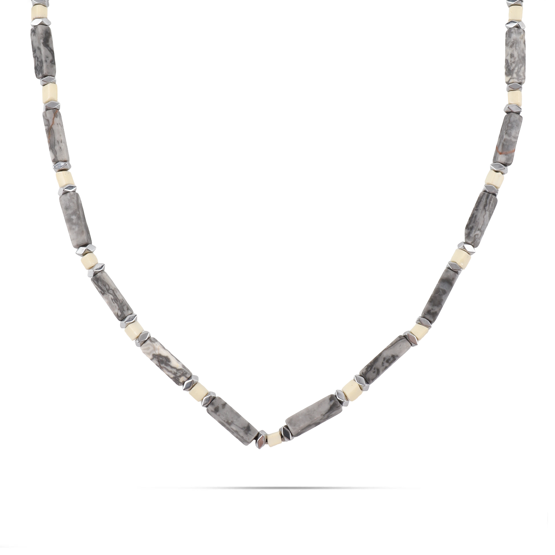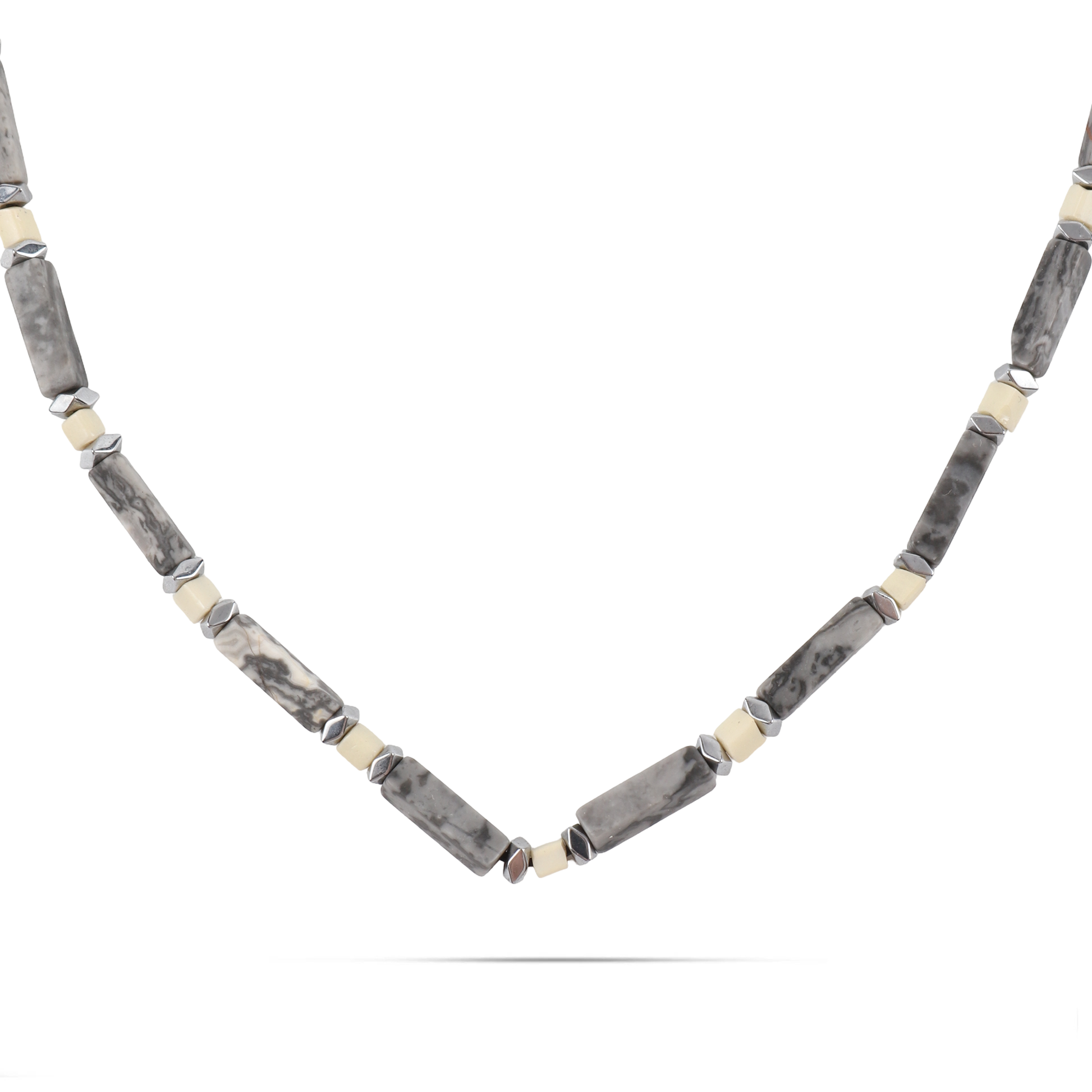 Ανδρικό χειροποίητο κολιέ με φυσικές ορυκτές πέτρες από κύβο χαολίτη (0,4cm), κύλινδρο χαολίτη (0,4cm) και πολυγωνικό αιματίτη (0,4cm).