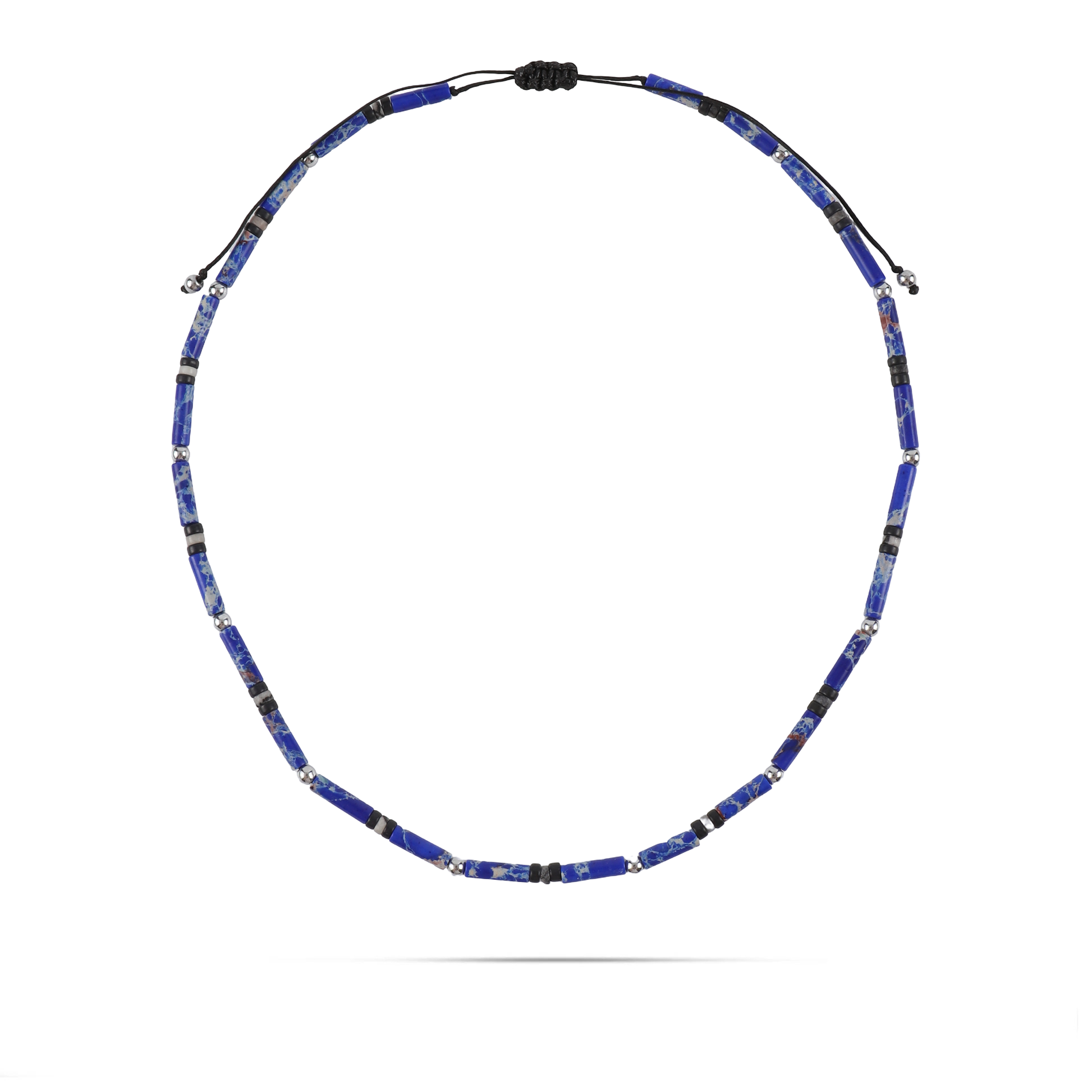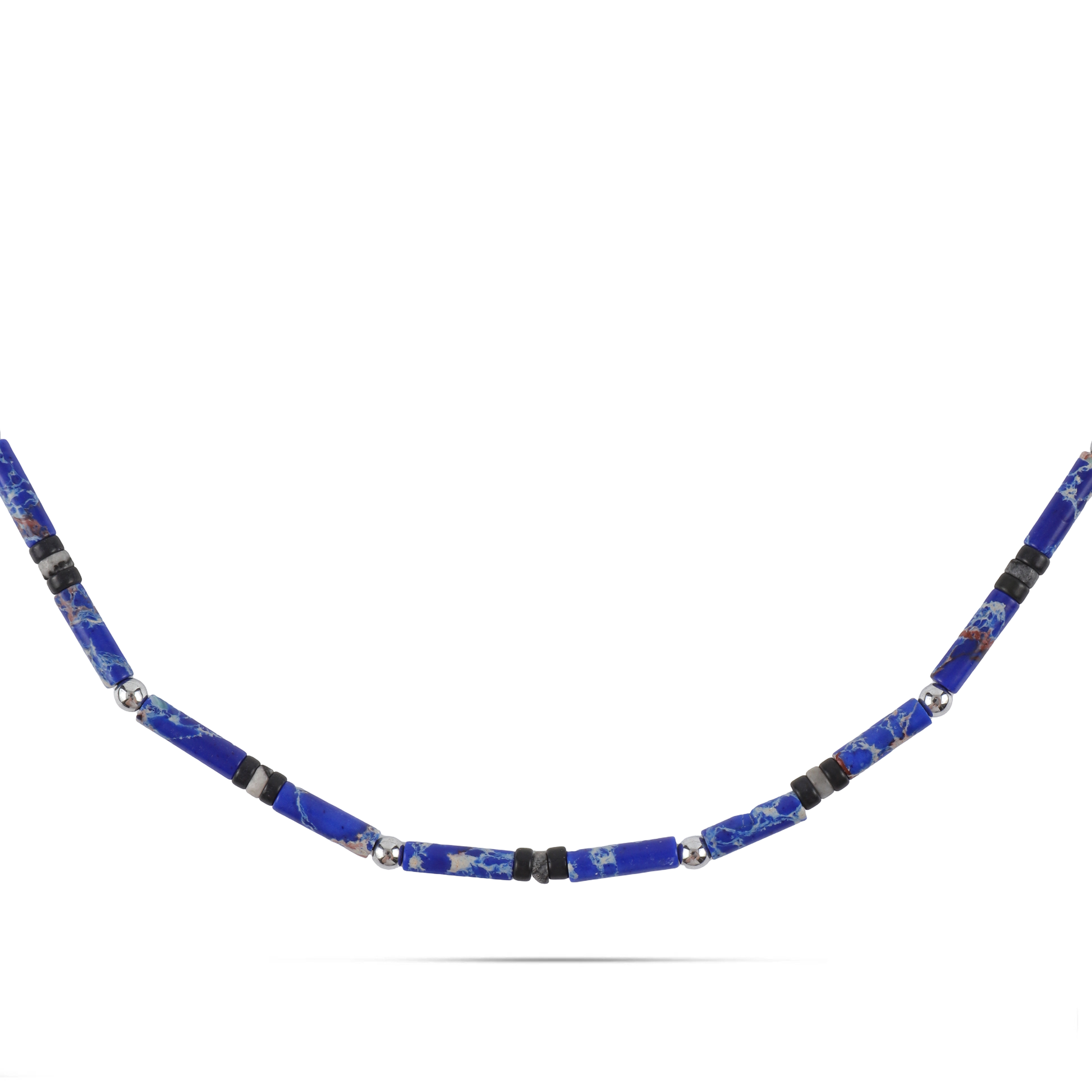 Ανδρικό χειροποίητο κολιέ με φυσικές ορυκτές πέτρες από μπλε κύλινδρο χαολίτη (0,4cm), μαύρη και γκρι ροδέλα χαολίτη (0,4cm) και ασημί μπίλια αιματίτη (0,4cm).